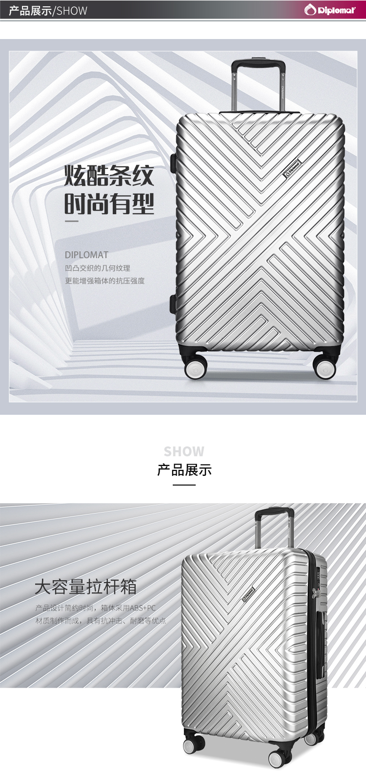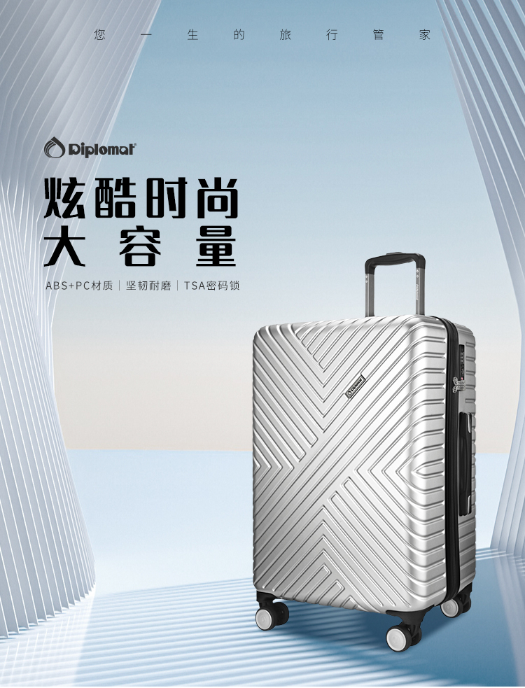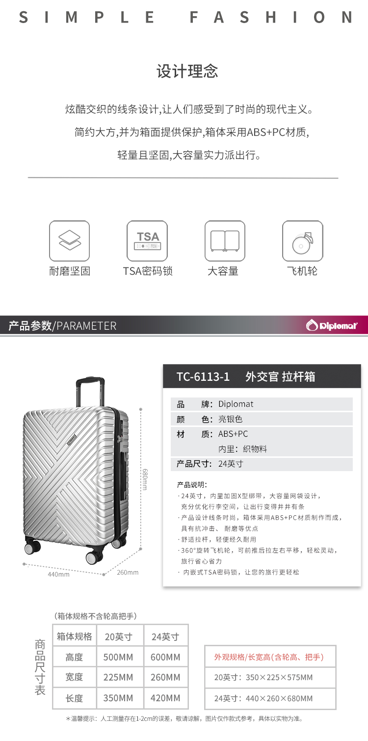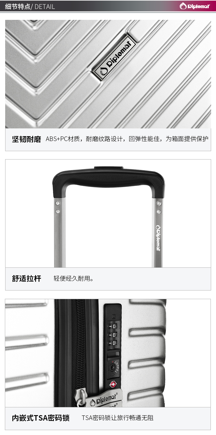 商品名称:Diplomat外交官坚韧耐磨行李箱商务旅行可登机轻便简约拉杆箱TC-6113-1 亮银色 24英寸