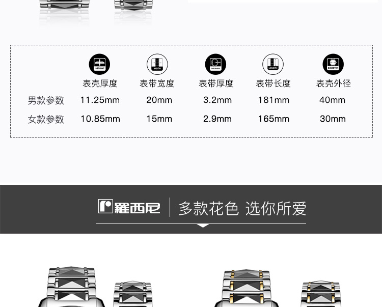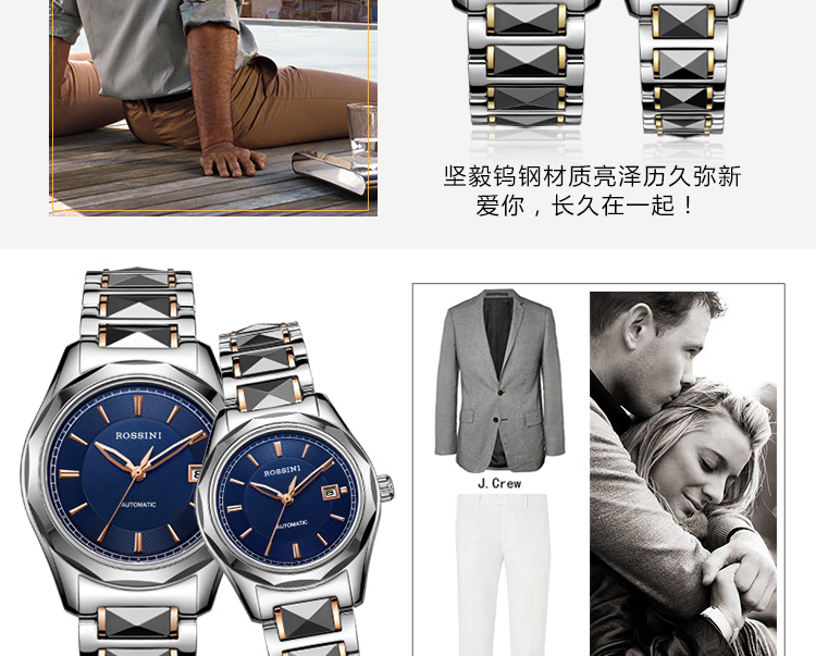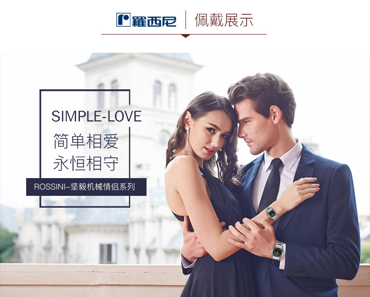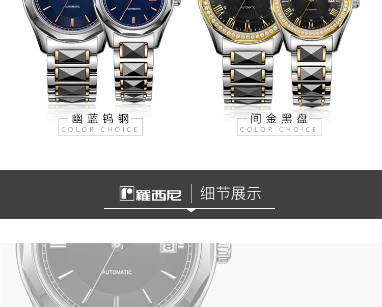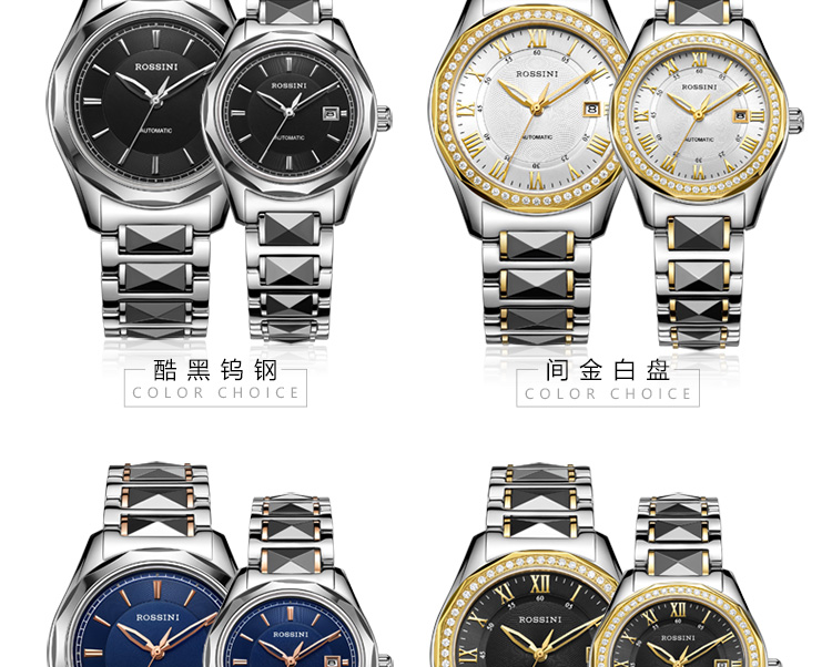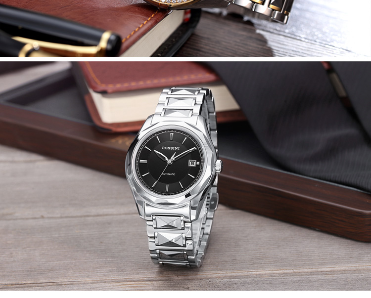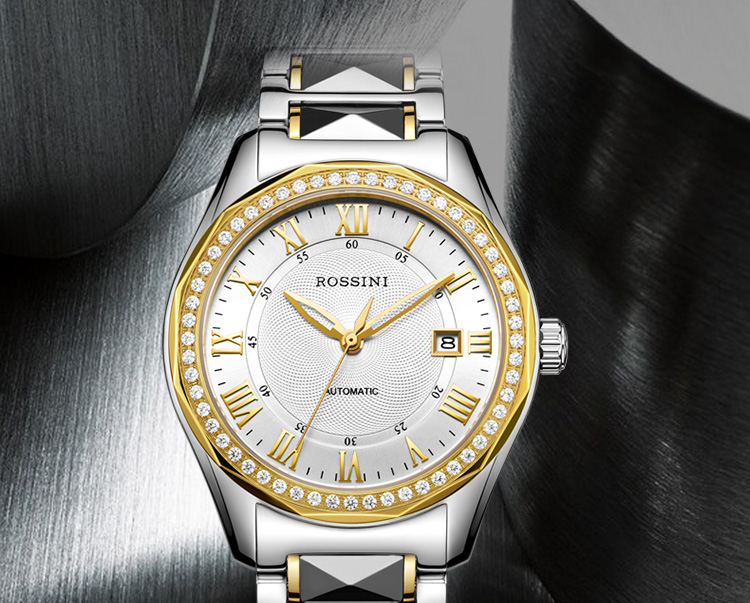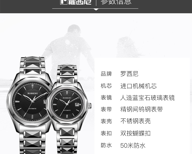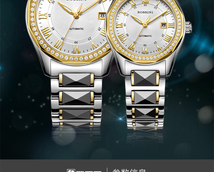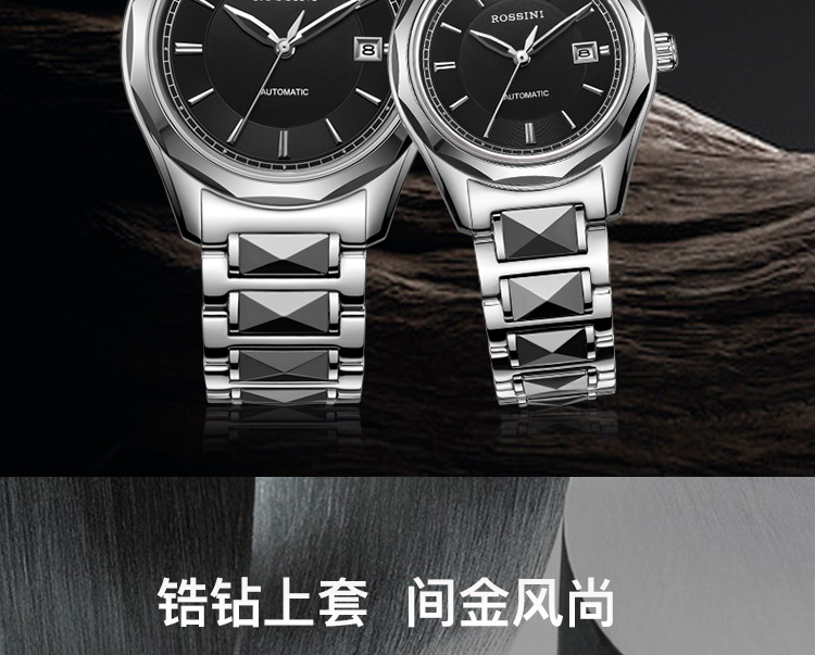 商品名称:Rossini罗西尼 启迪系列 机械手表情侣款黑盘钢带女表6444W04A