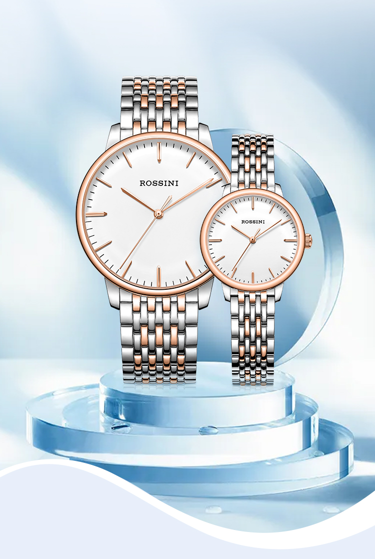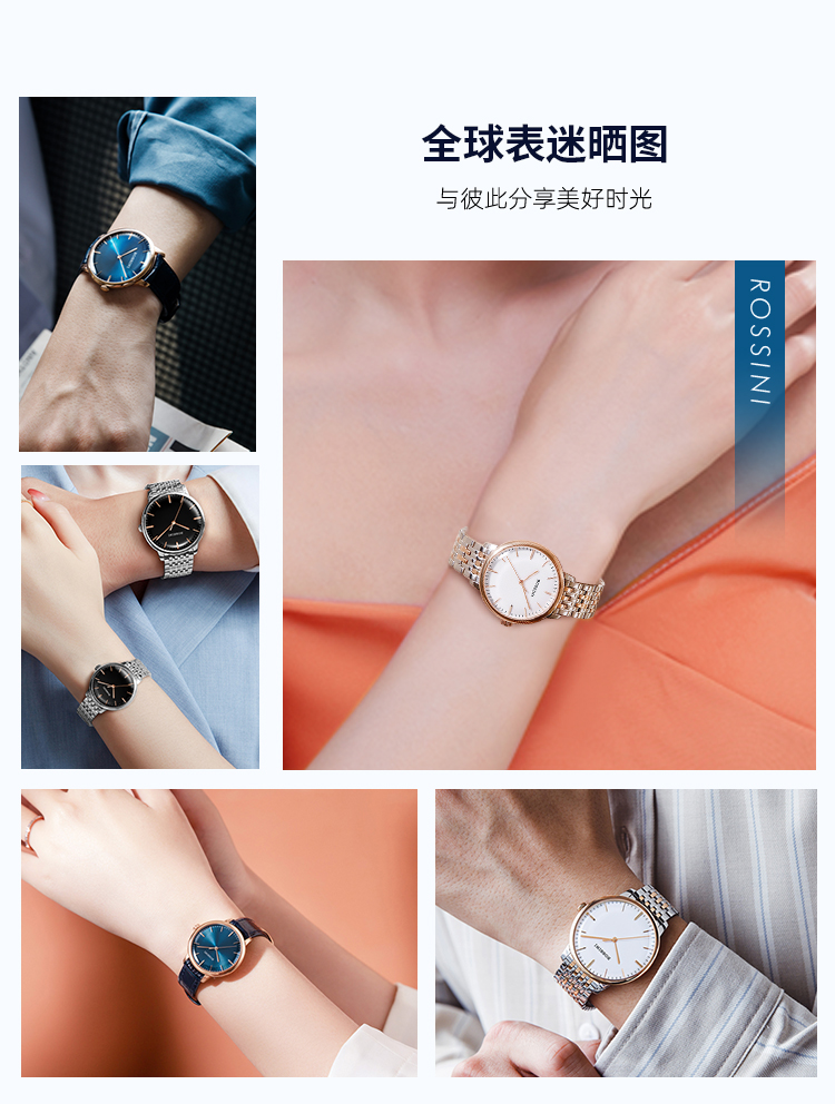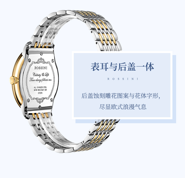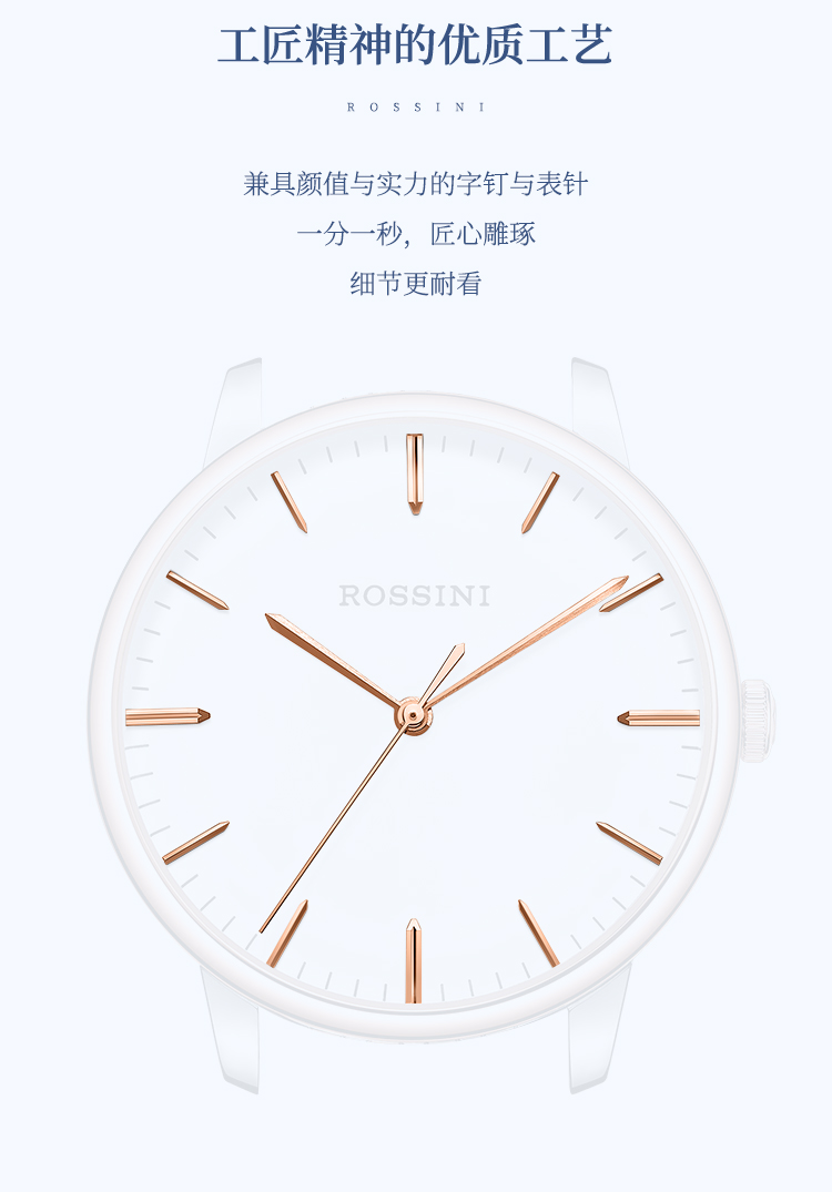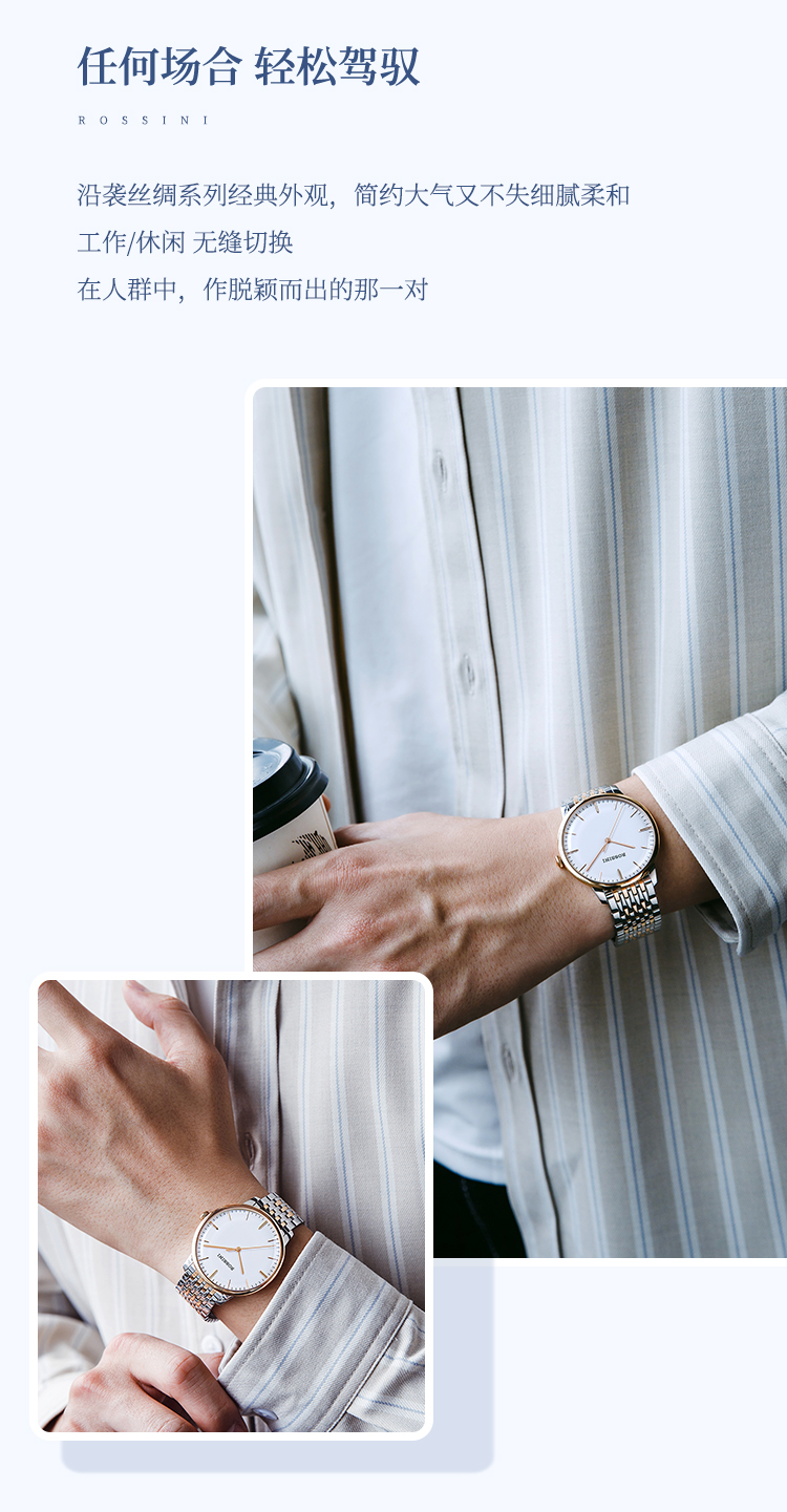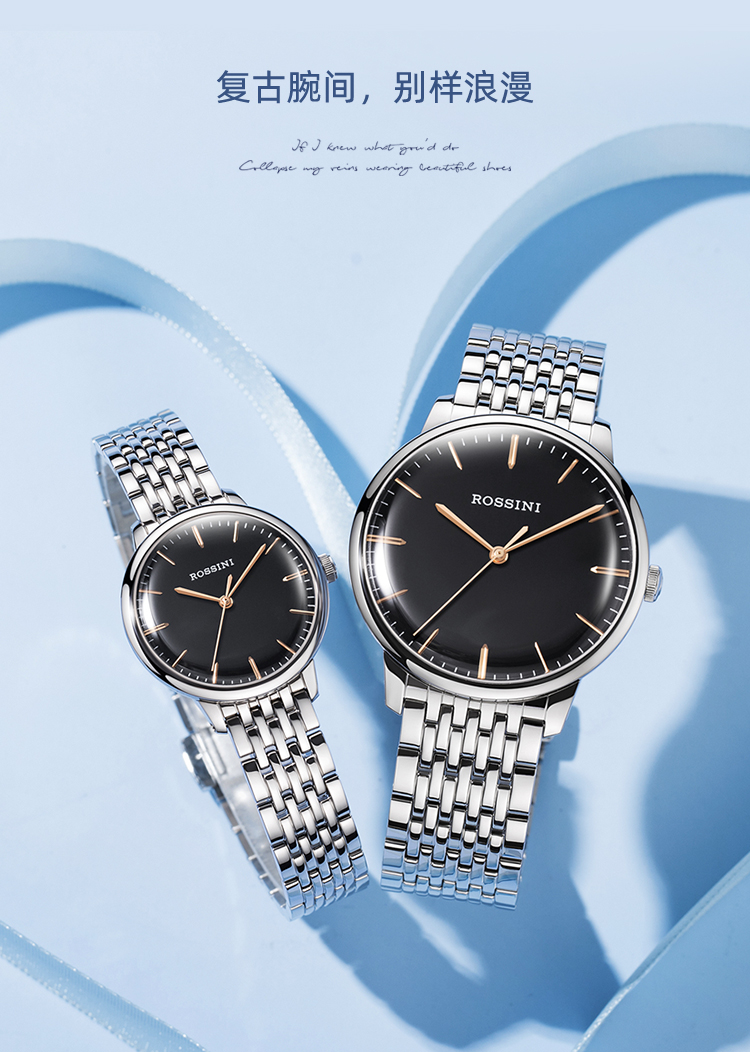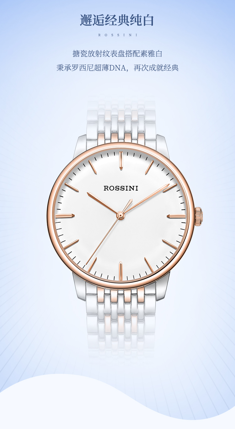 商品名称:Rossini罗西尼 丝绸系列 石英手表简约情侣款白盘钢带女表50032T01A