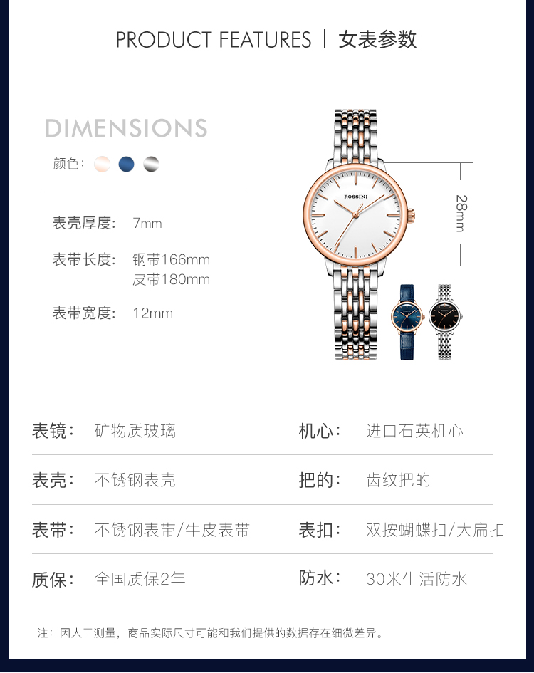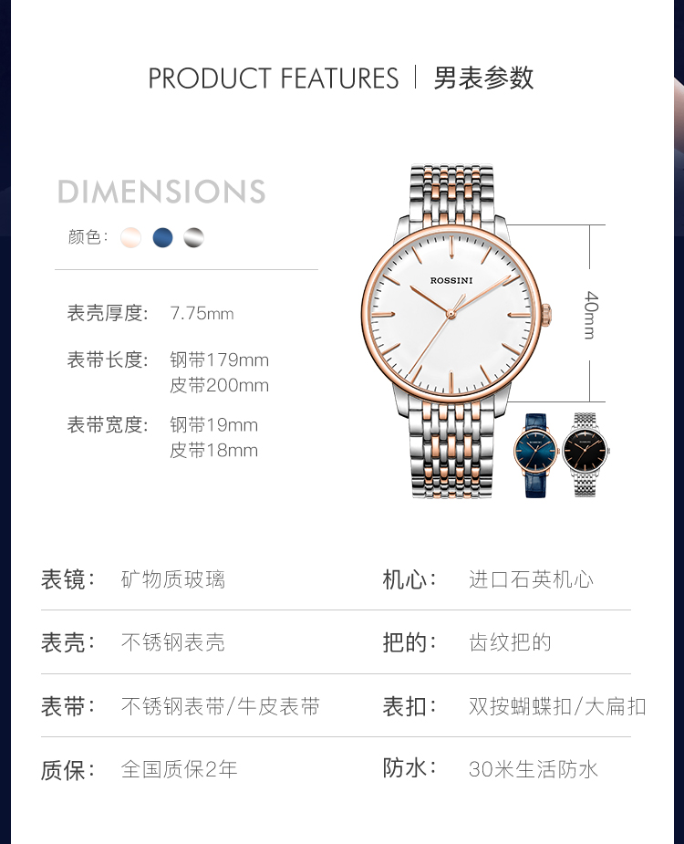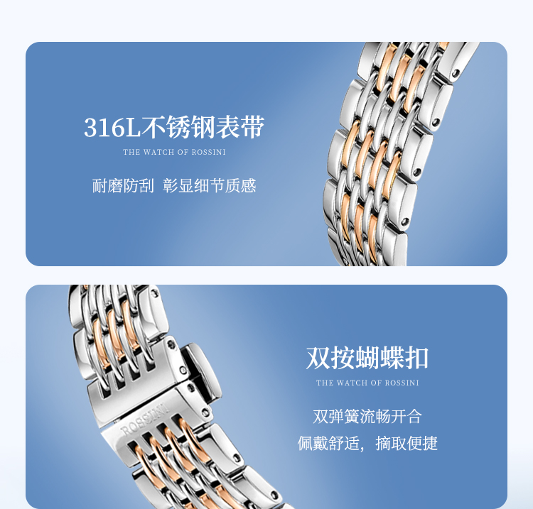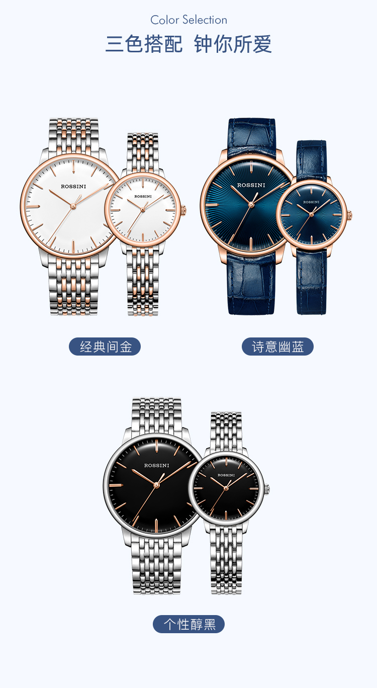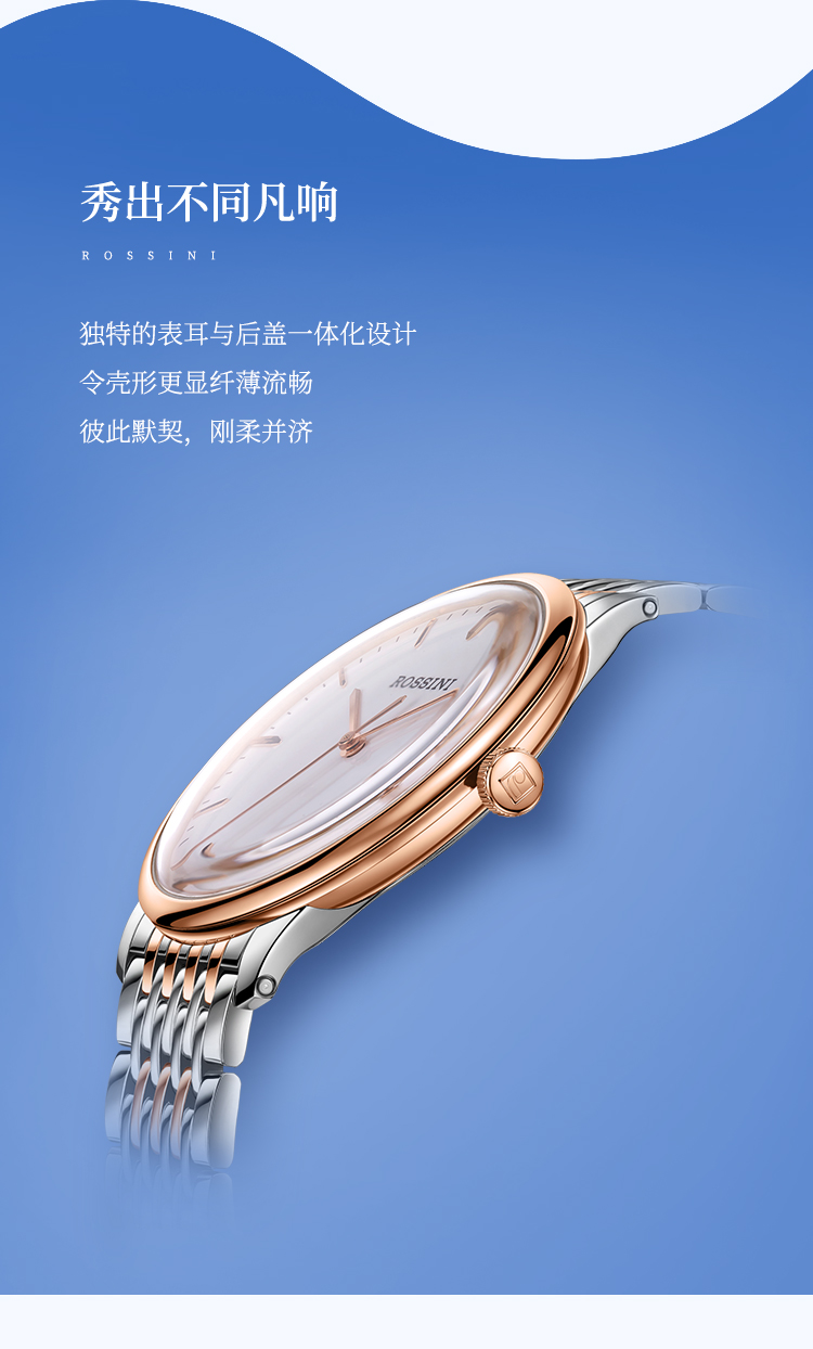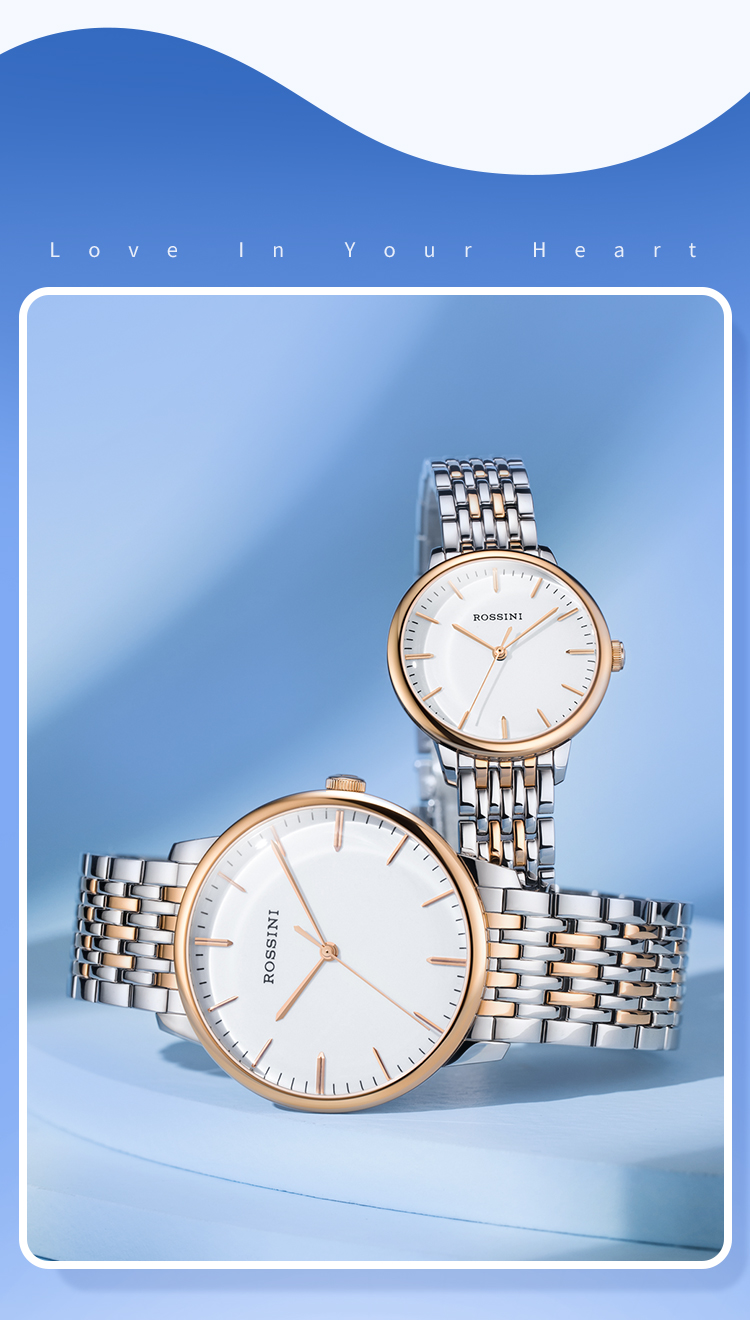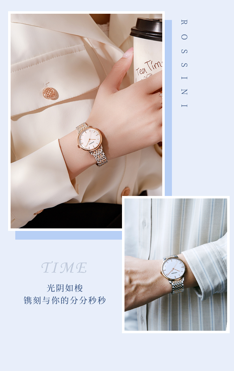 商品名称:Rossini罗西尼 丝绸系列 石英手表简约情侣款白盘钢带女表50032T01A