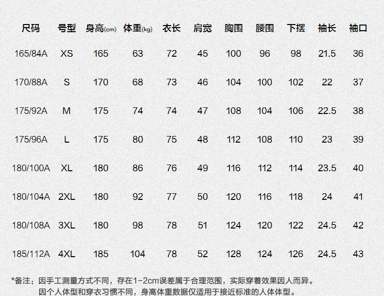 | 2XL(推荐86~90kg) | 77 | 50 | 116 | 24 | 120 | 118 | 180/104A |