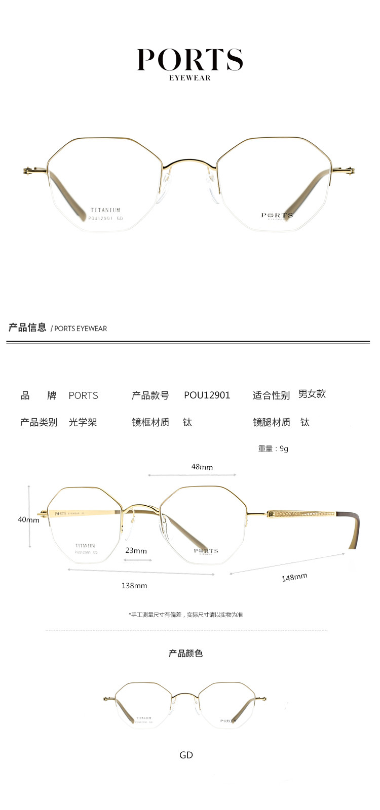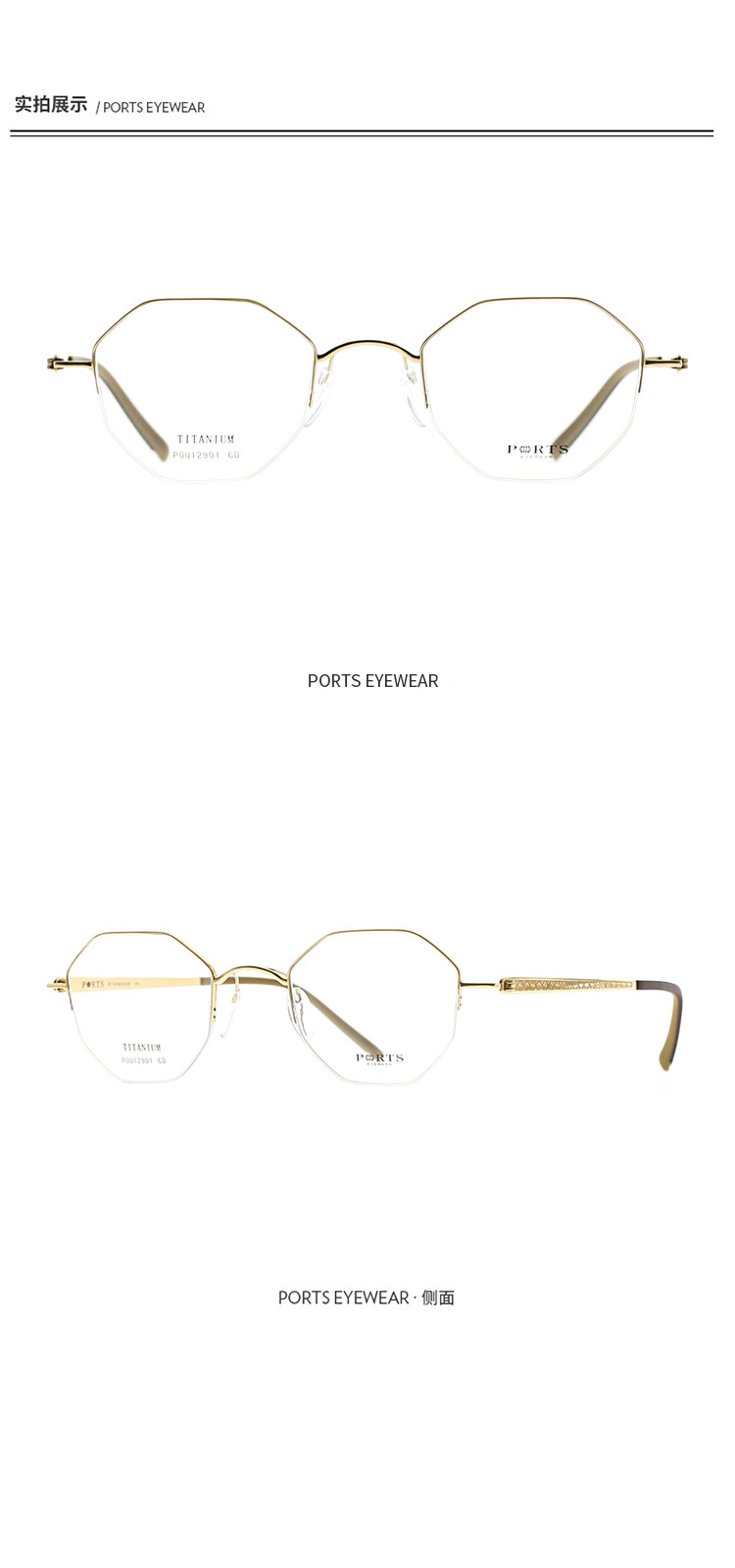 商品名称:PORTS眼镜中性款光学架简约时尚圆形钛眼镜架POU12901 002314