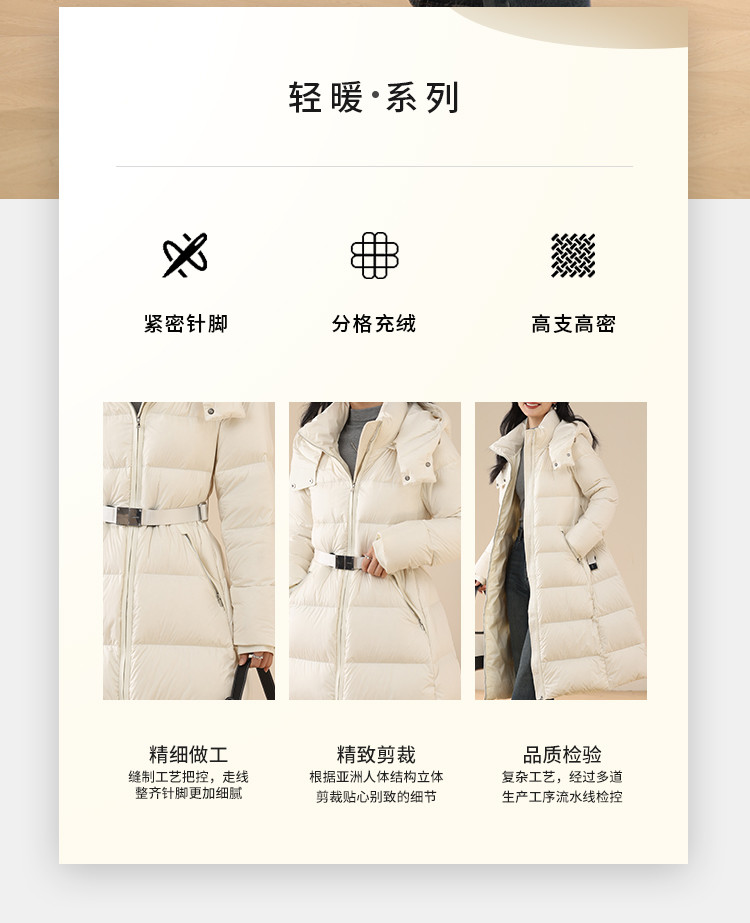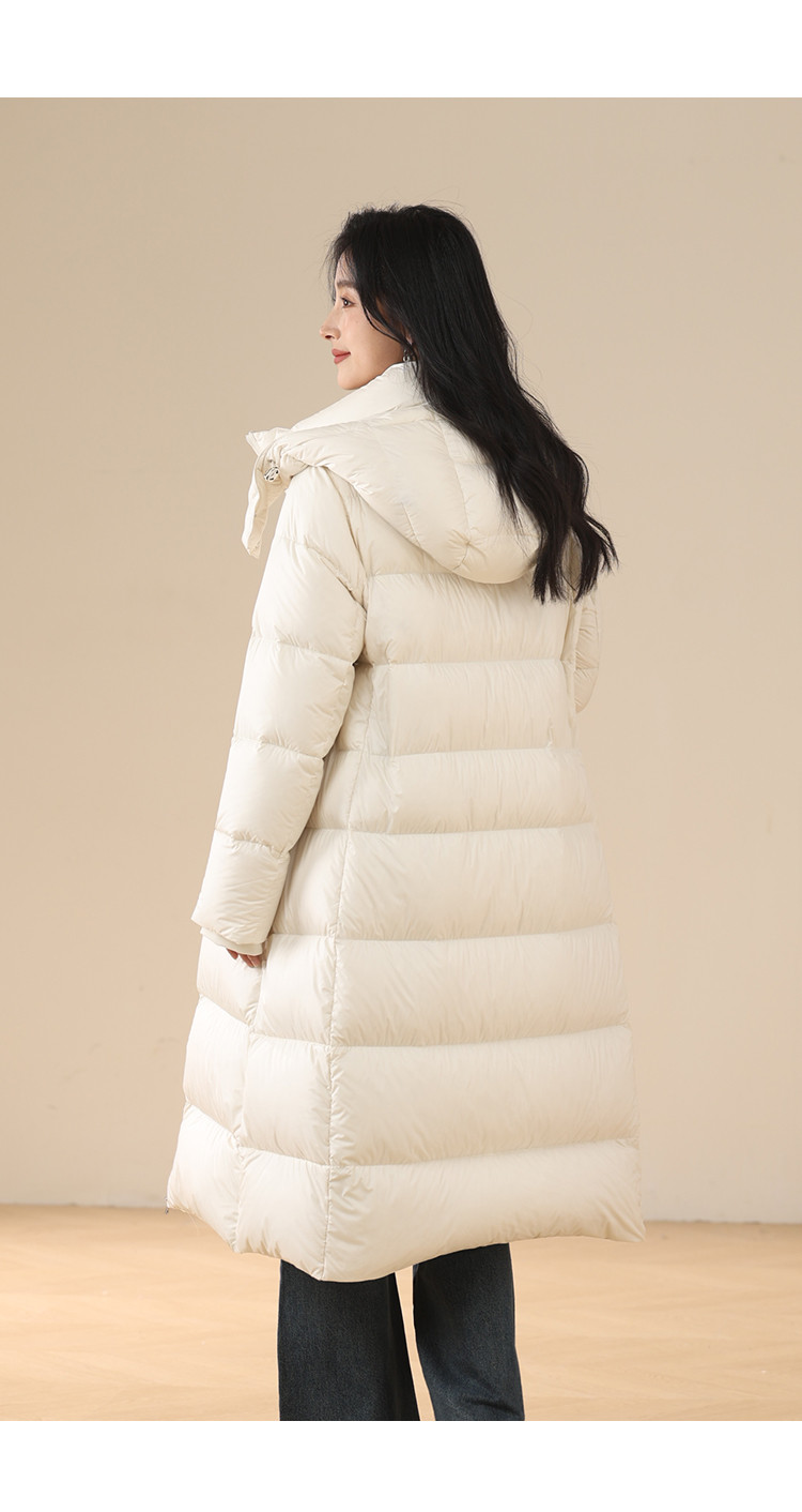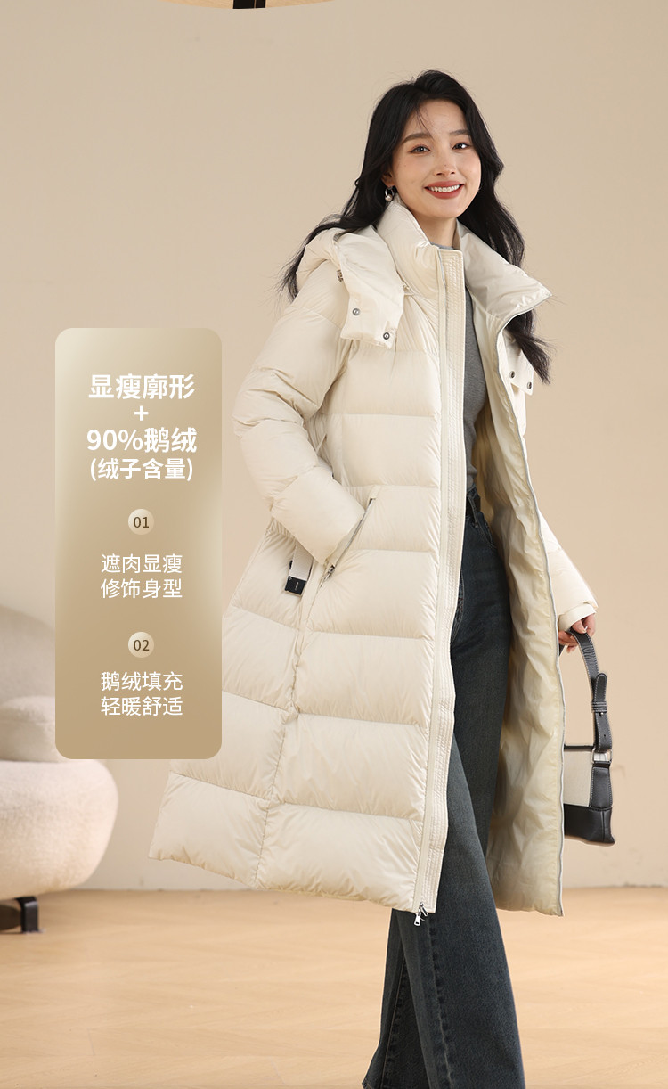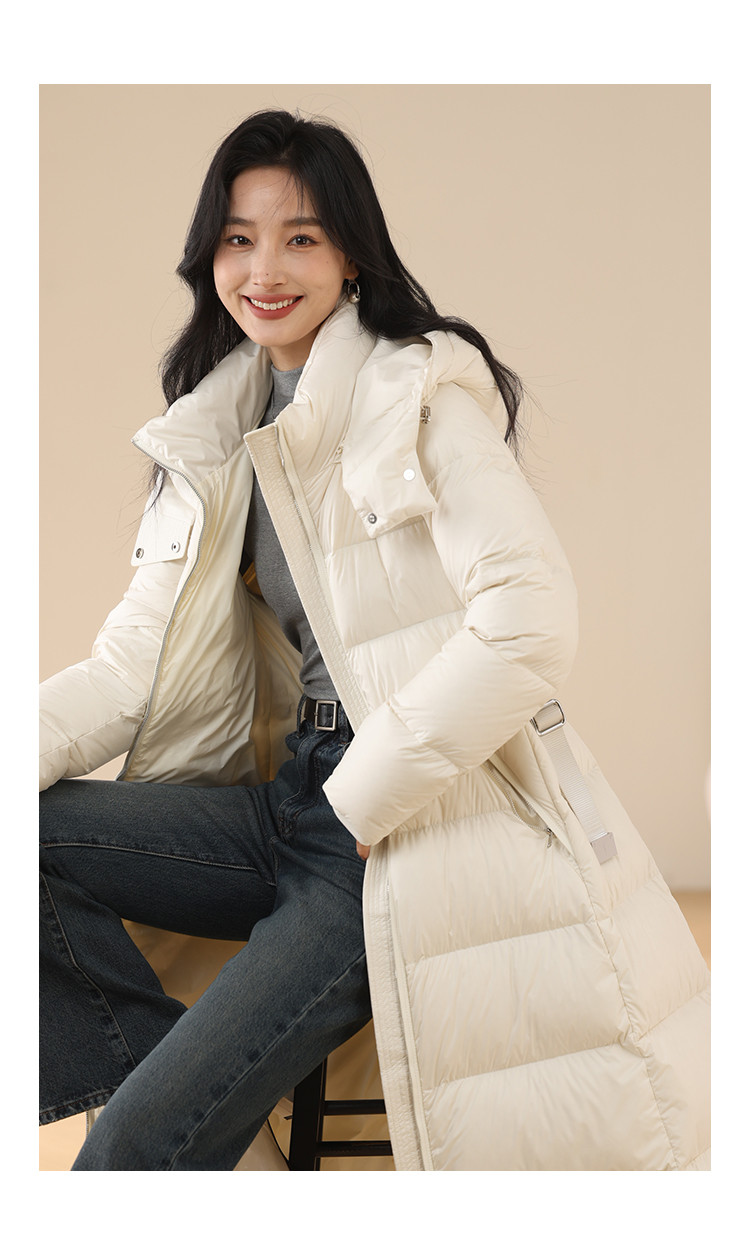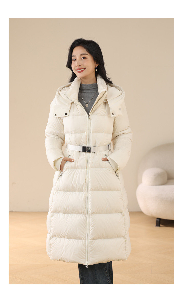 商品名称:【鹅绒】莫兰迪色系气质优雅修身带帽加厚长款羽绒服 681055
