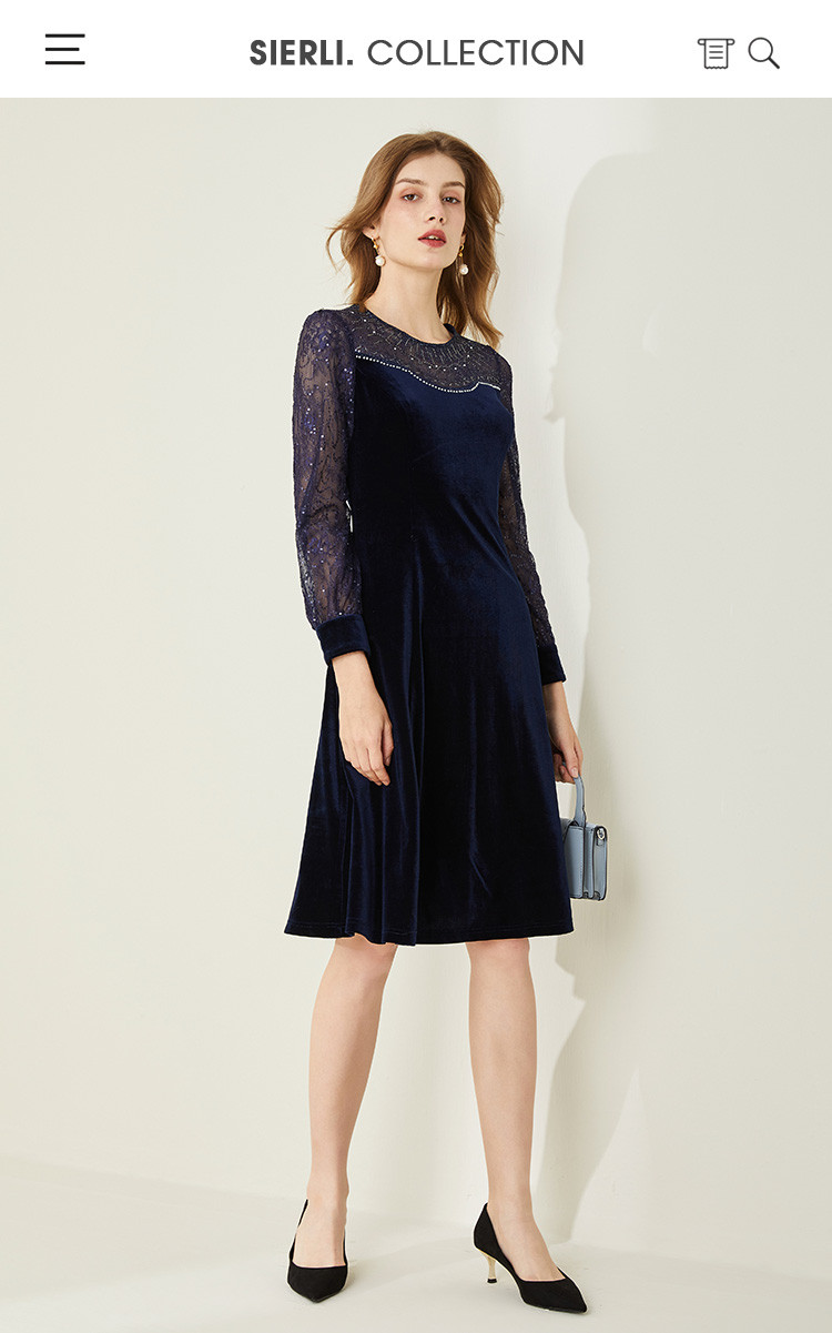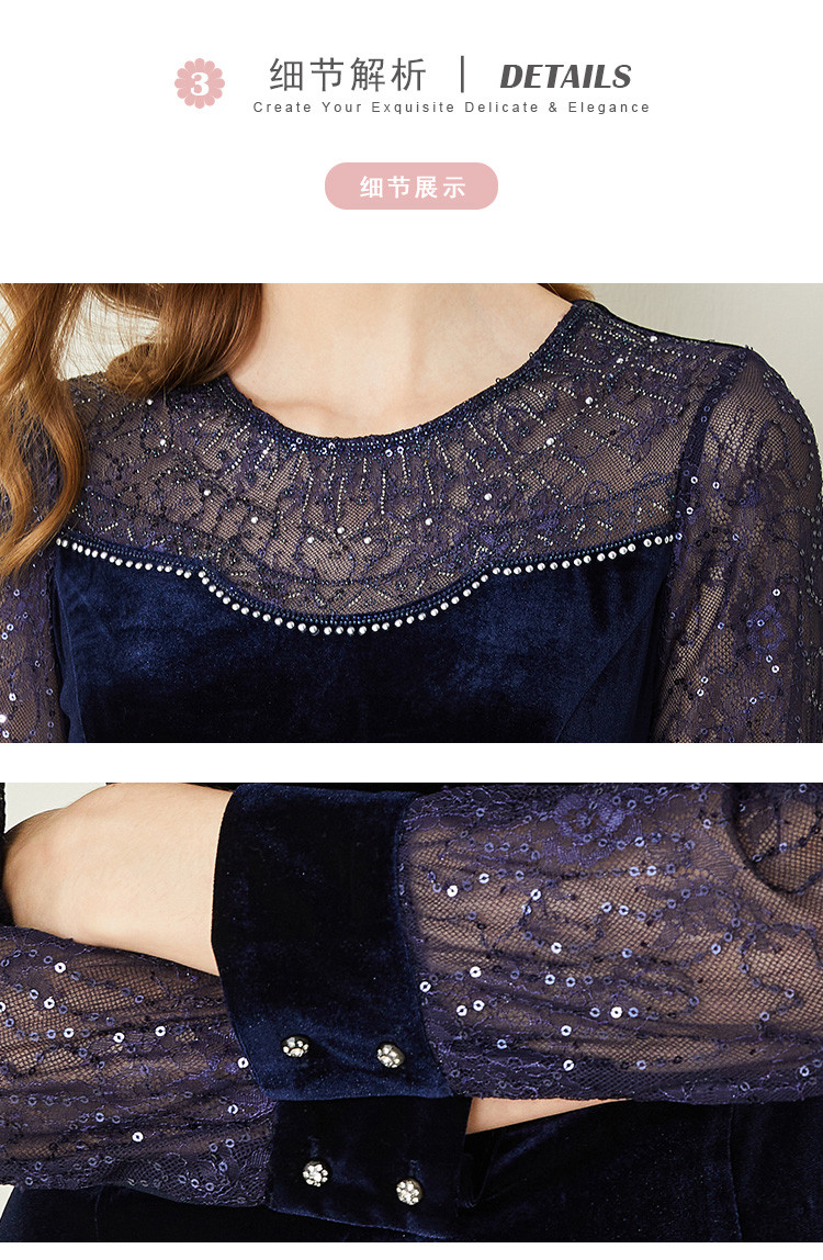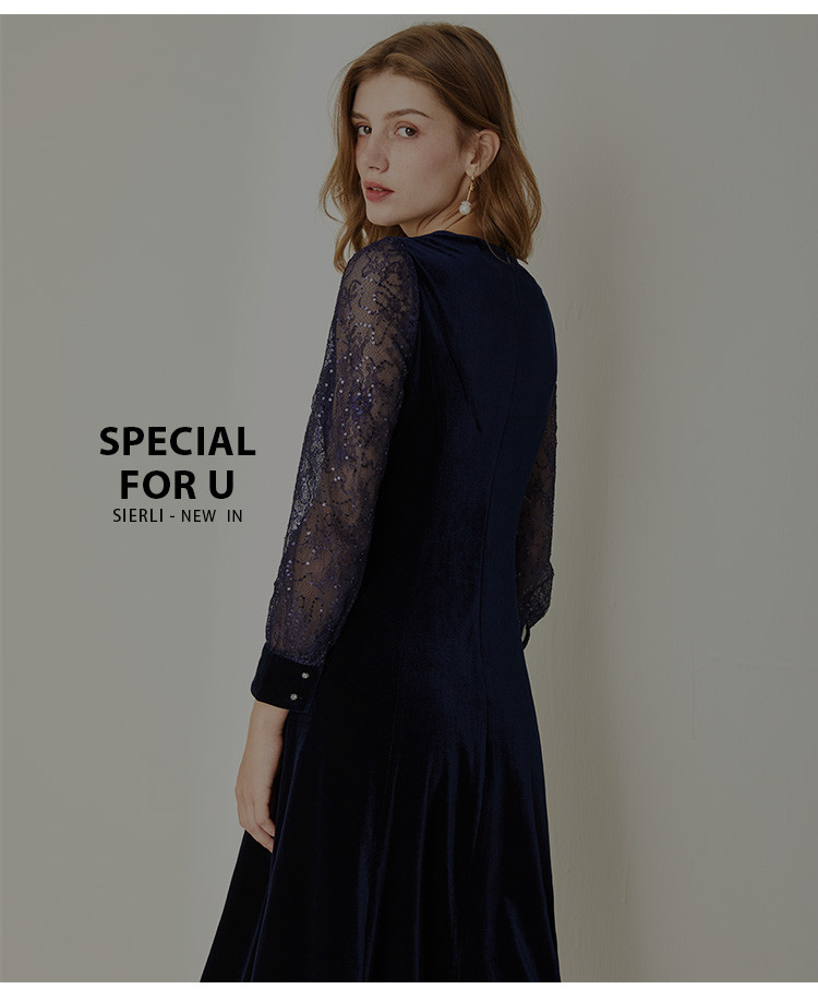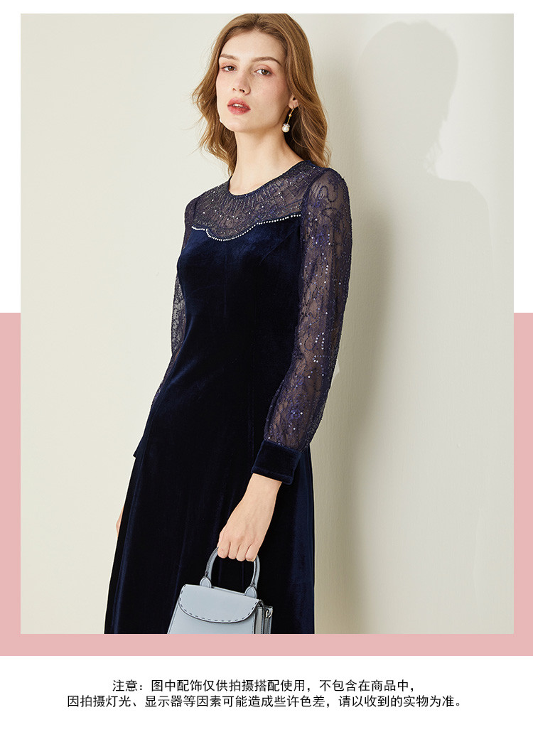 商品名称:春季时尚亮片拼丝绒轻奢气质圆领长袖A摆连衣裙 345247