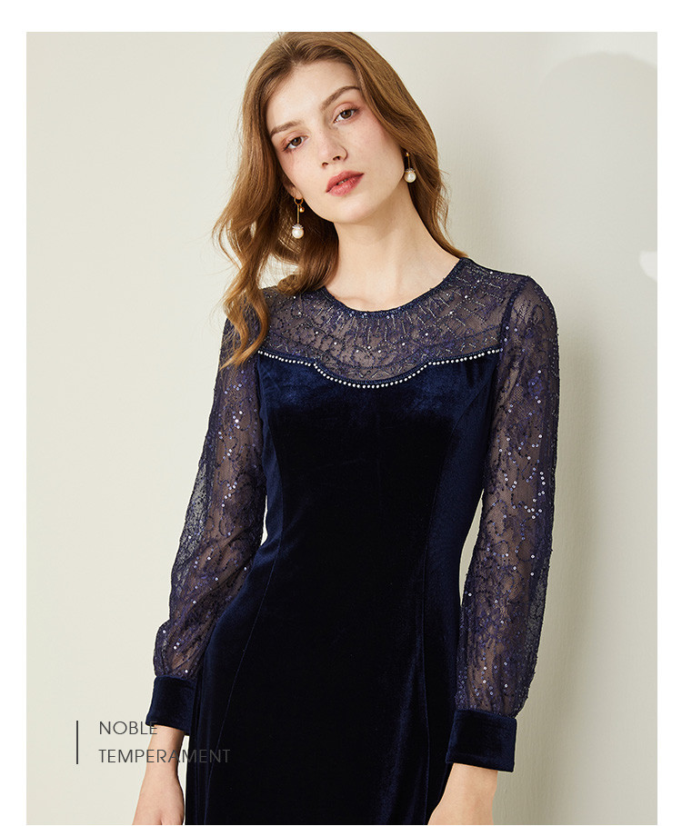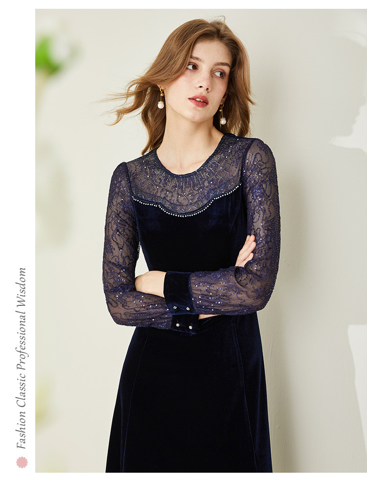 春季时尚亮片拼丝绒轻奢气质圆领长袖A摆连衣裙 345247
