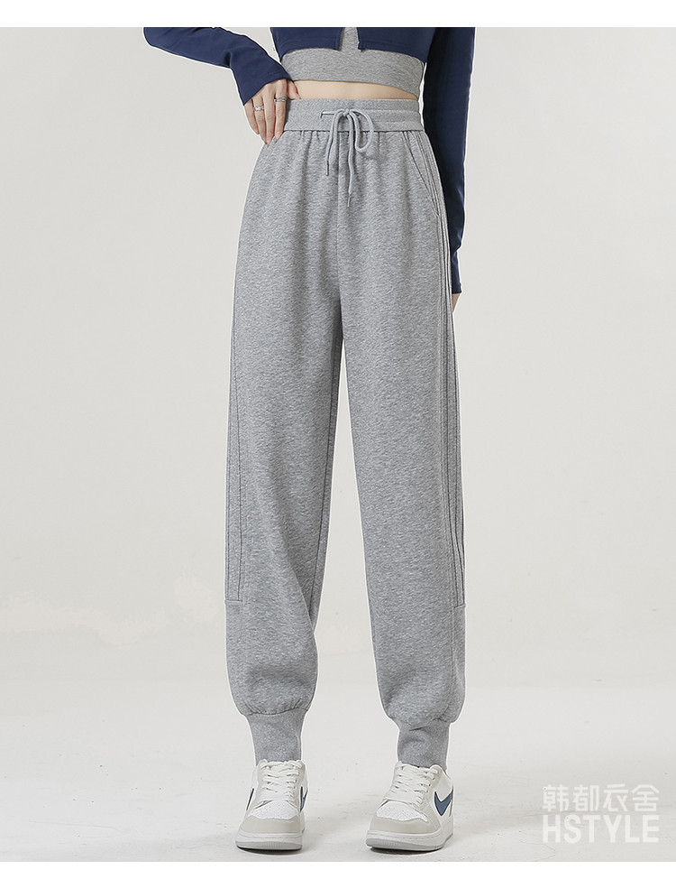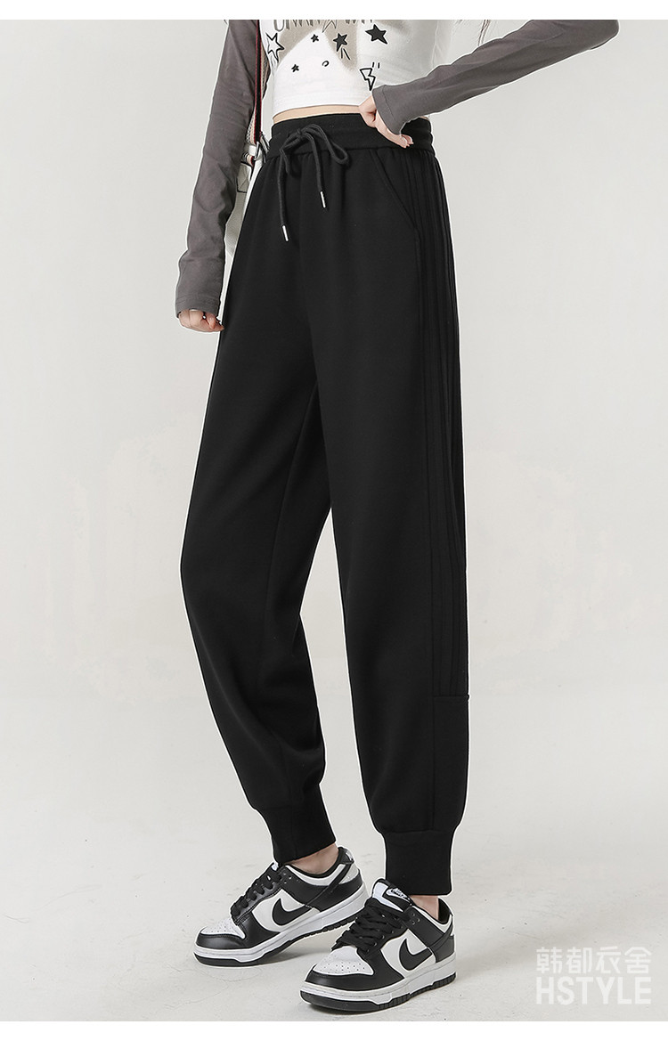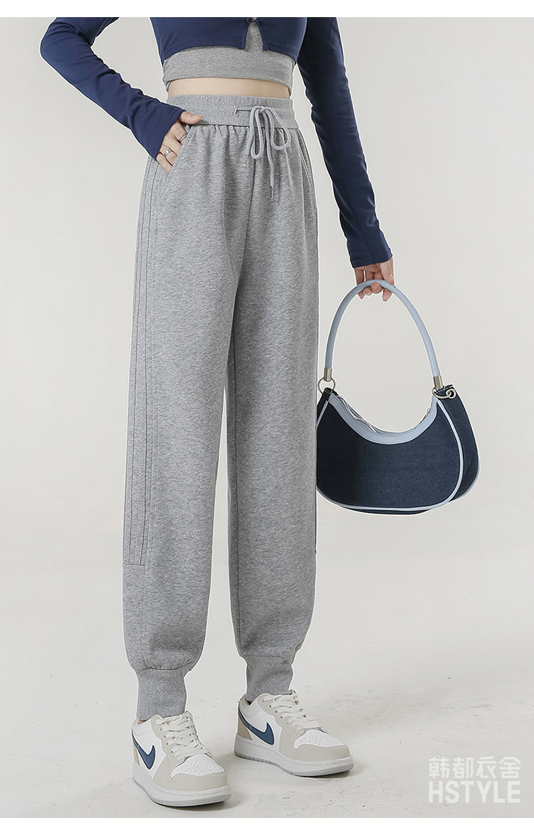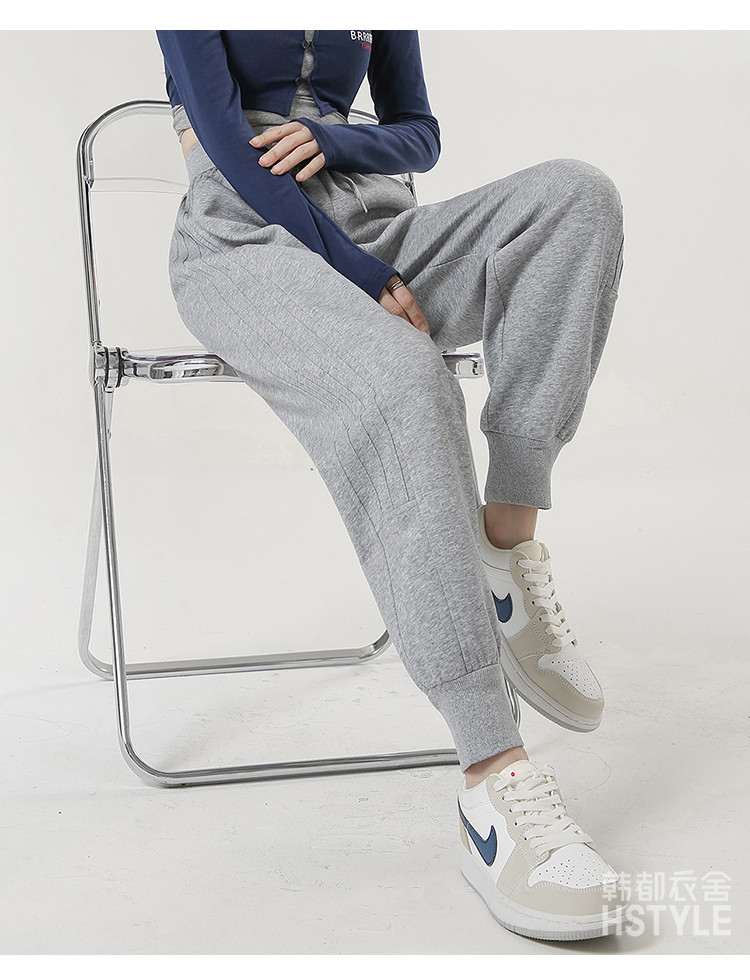 春季款束脚裤女运动休闲裤抽绳设计松紧腰通勤显瘦侧拼卫裤女 056011