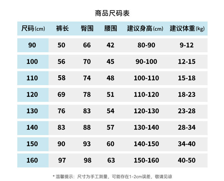 | 尺码 | 身高(cm) | 腰围(cm) | 裤长(cm) | 臀围(cm) | 适合年龄 | 号型 |
