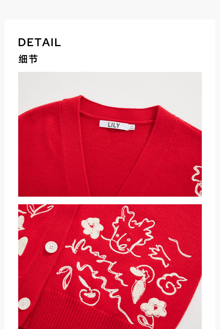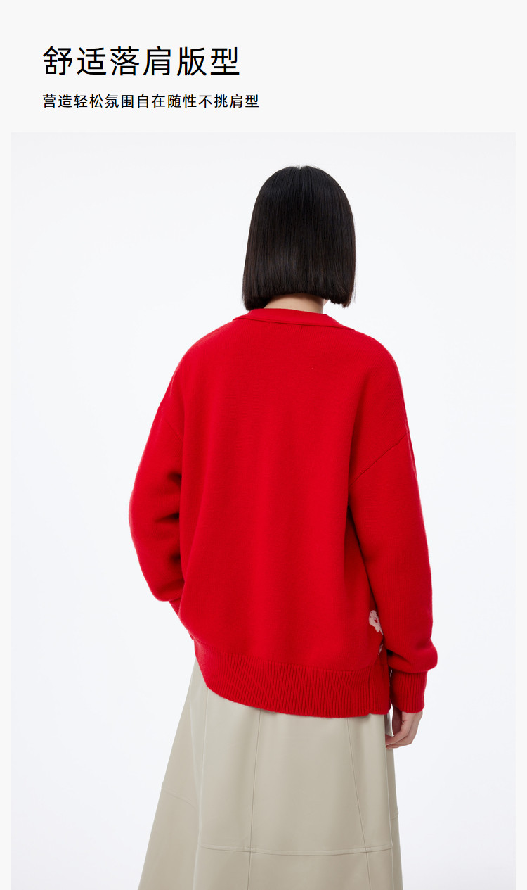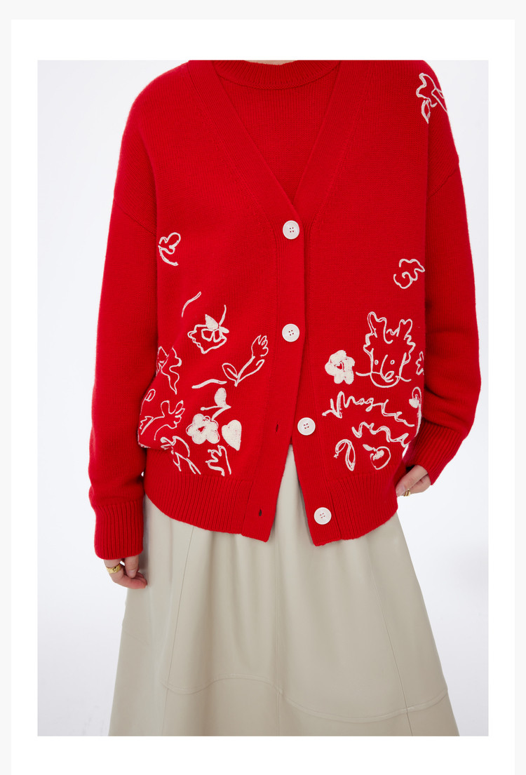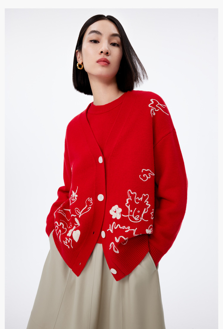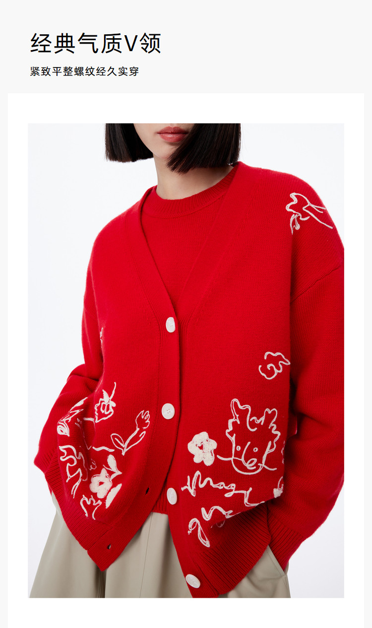 商品名称:【龙年衣】春季款外套拜年红色绵羊毛趣味v领针织开衫外套女 526747