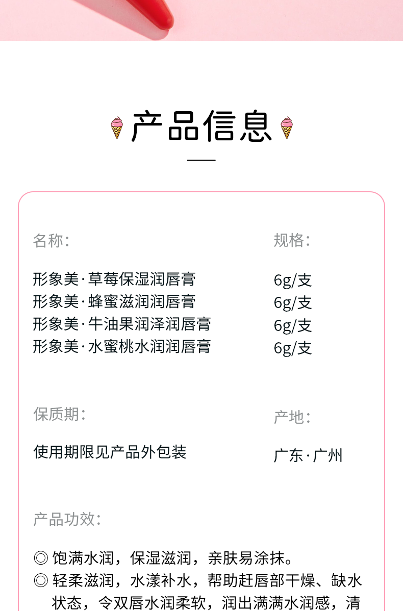 商品名称:形象美保湿滋润润唇膏6g草莓蜂蜜牛油果水蜜桃4款可选秋冬季秋冬天唇部护理