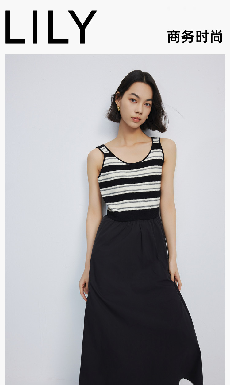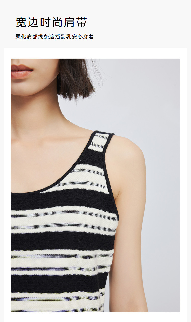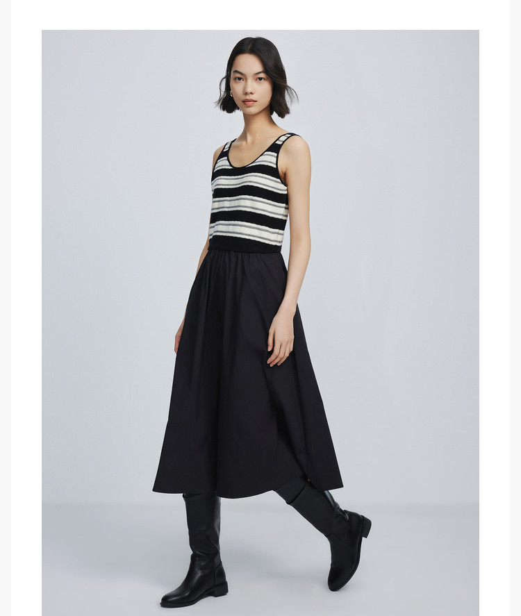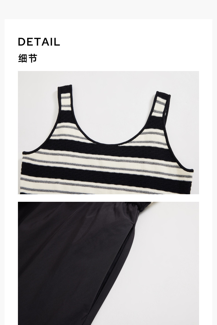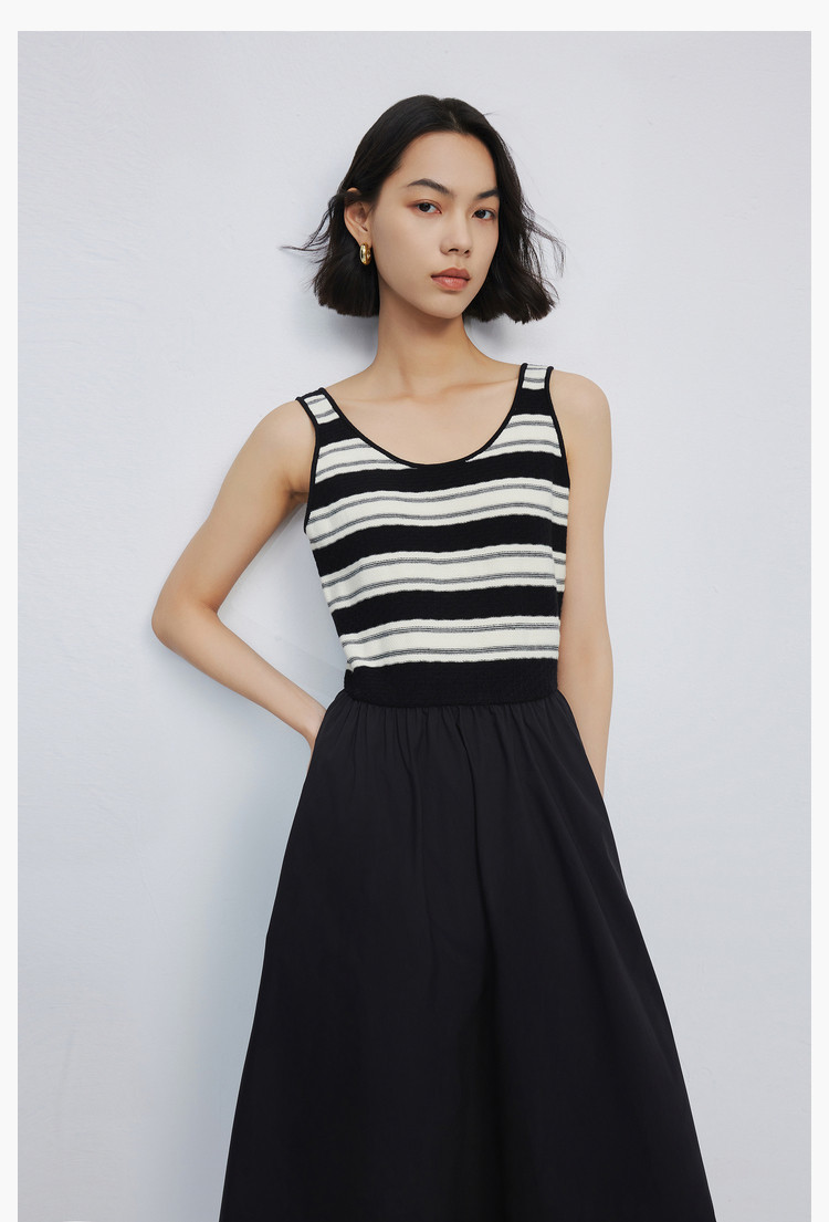 商品名称:春季复古拼接条纹时尚通勤款加宽肩带优雅针织连衣裙小黑裙 438939
