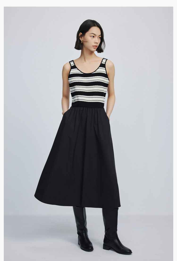 春季复古拼接条纹时尚通勤款加宽肩带优雅针织连衣裙小黑裙 438939