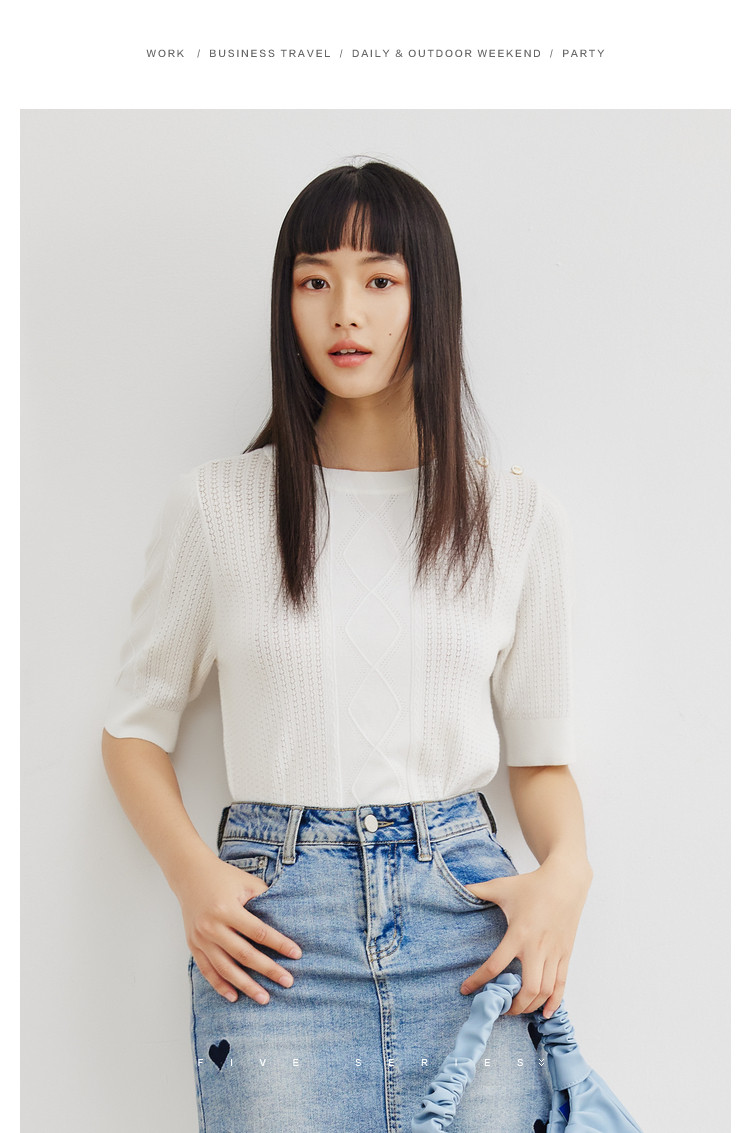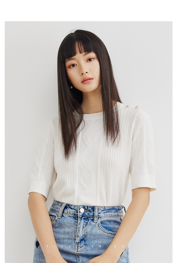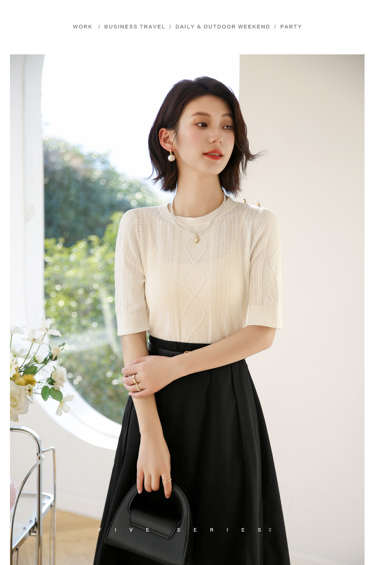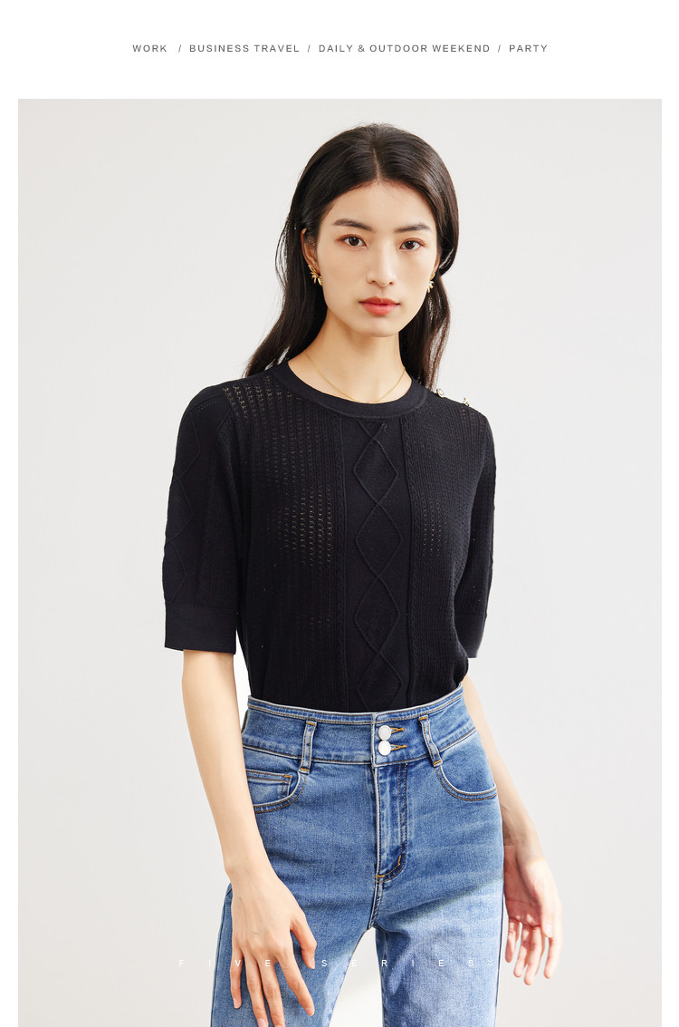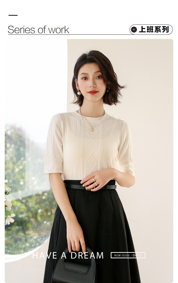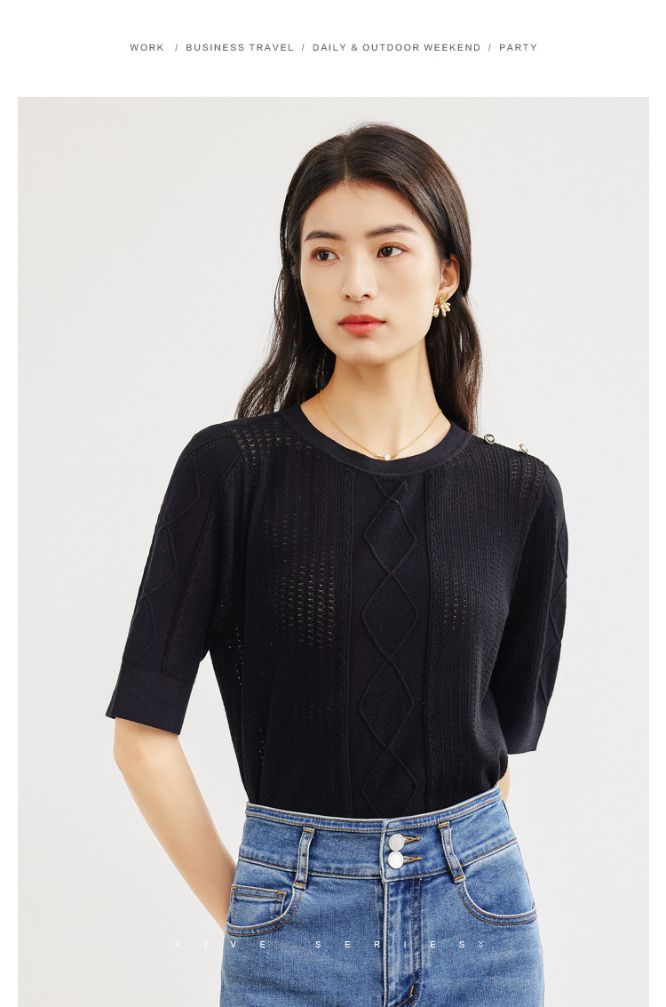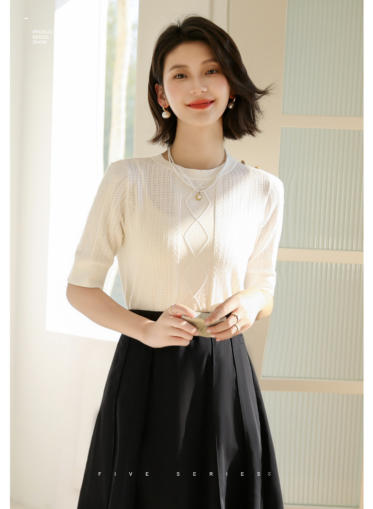 商品名称:五分袖圆领针织衫女夏款显瘦百搭镂空设计感上衣女 599875