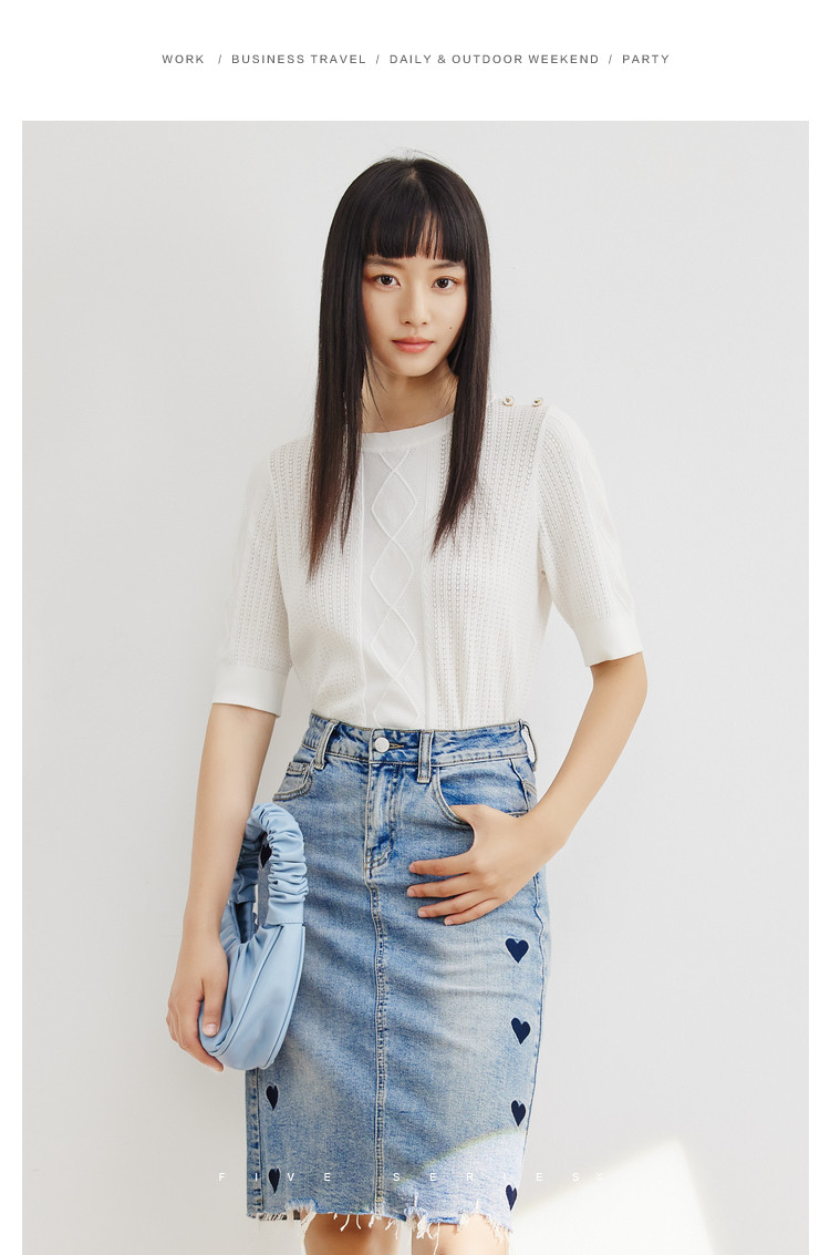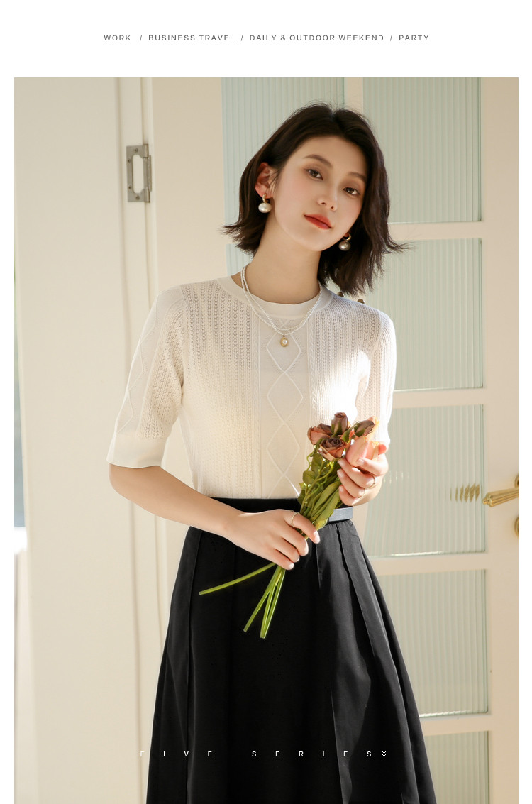 五分袖圆领针织衫女夏款显瘦百搭镂空设计感上衣女 599875