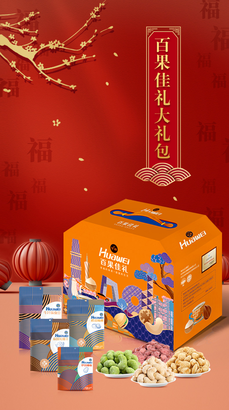 华巍百果佳礼(6袋装)商超版1415g /盒(笑口山杏/兰花豆/薄皮核桃/山楂小方/椰枣/龙眼干)