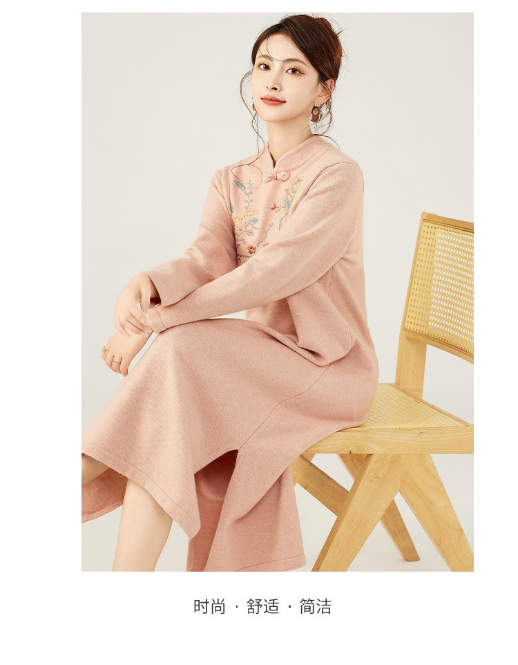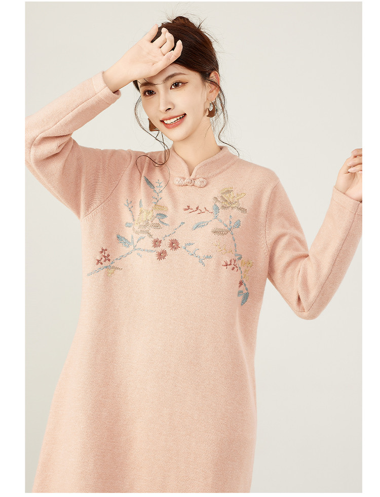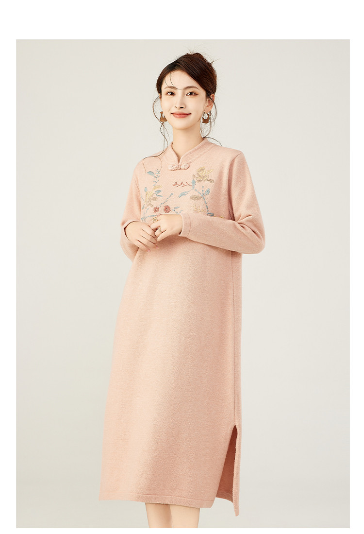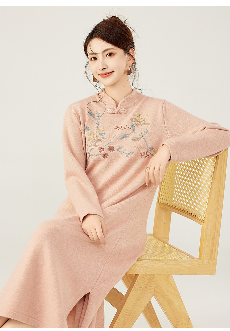 【新中式国风立领盘扣】秋冬精致刺绣设计侧开叉旗袍连衣裙女 610783