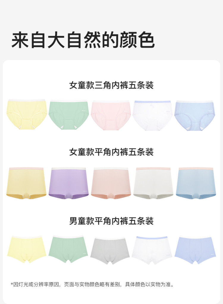 粉末蓝+浅苔绿+淡茱萸粉+蒲公英白+鹅黄(女童三角裤批次1)