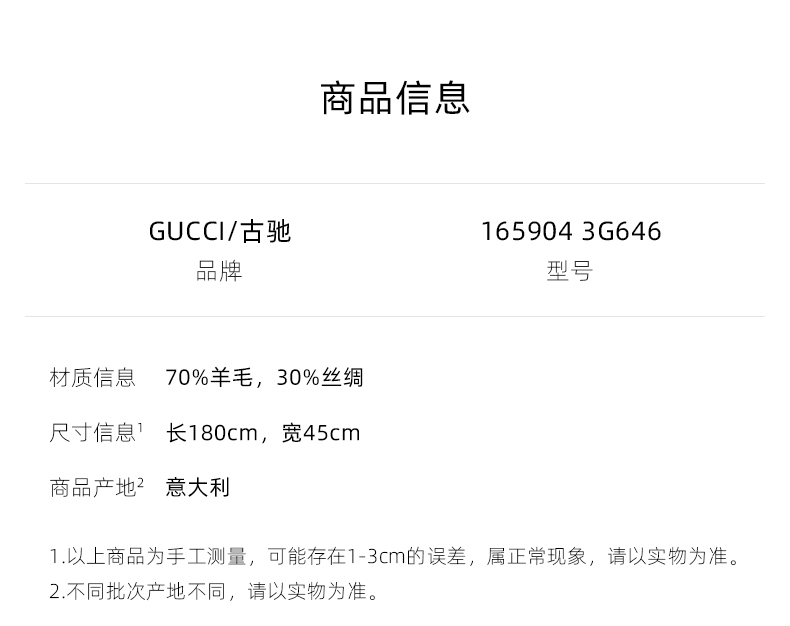 商品名称:GUCCI 女士羊毛真丝围巾 165904 165904 3G646 9664