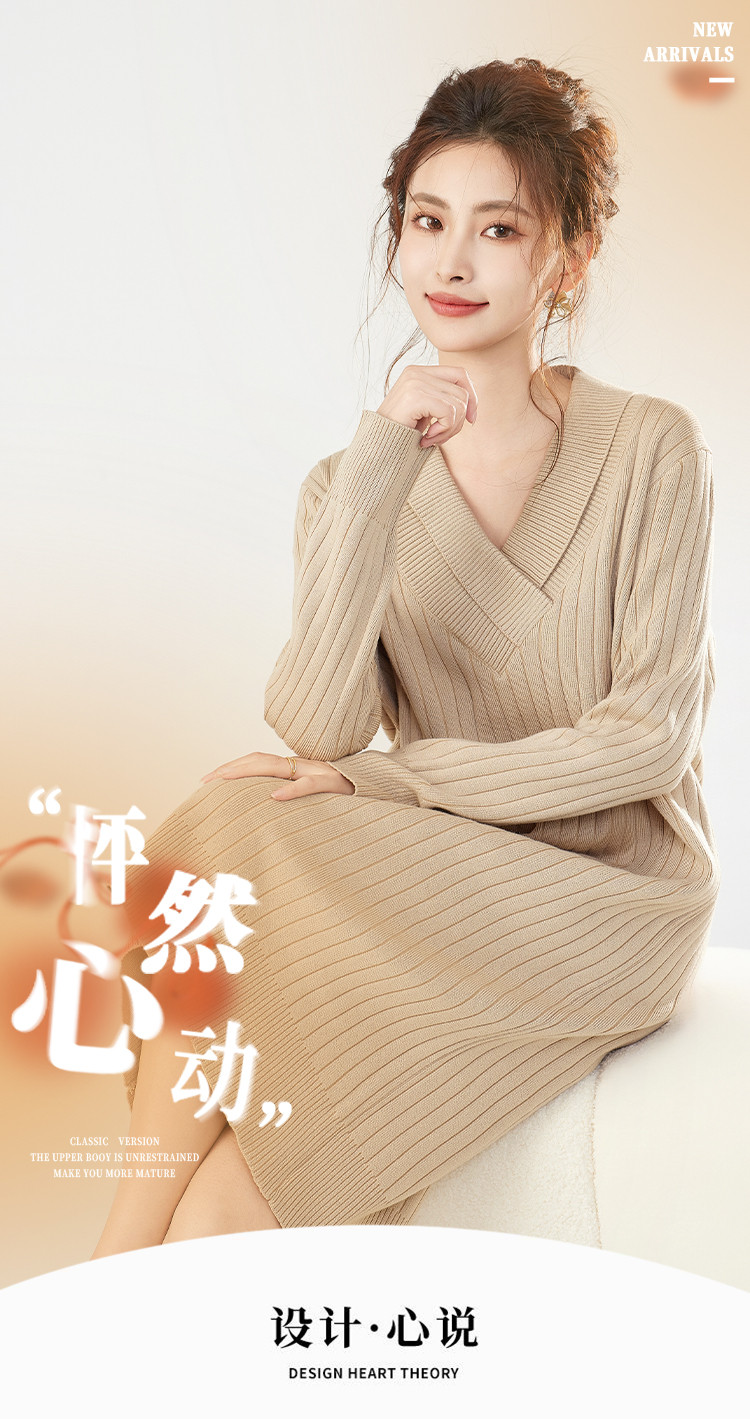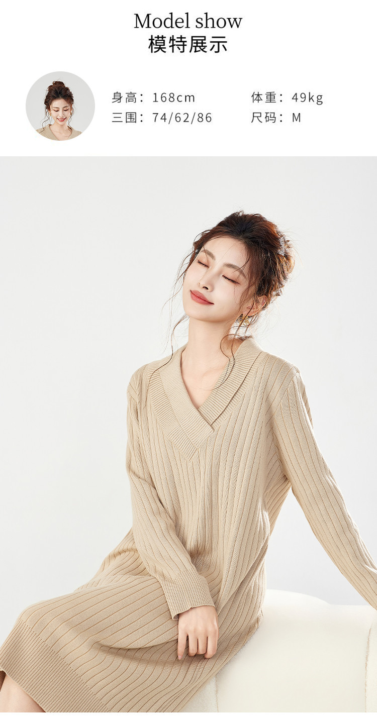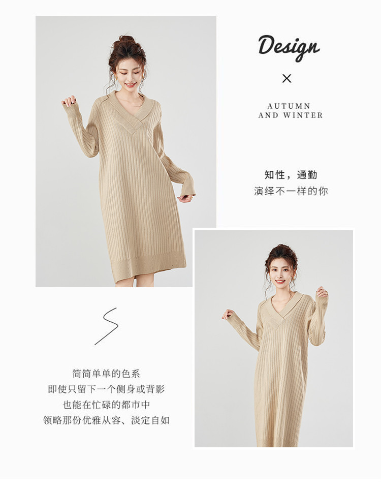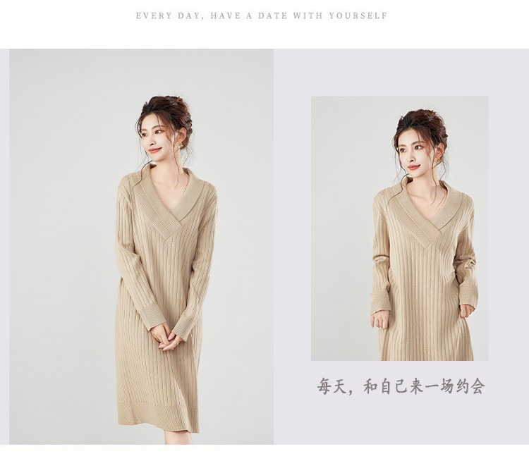 商品名称:【配大衣】秋冬时尚V领长袖过膝打底针织连衣裙女 458911