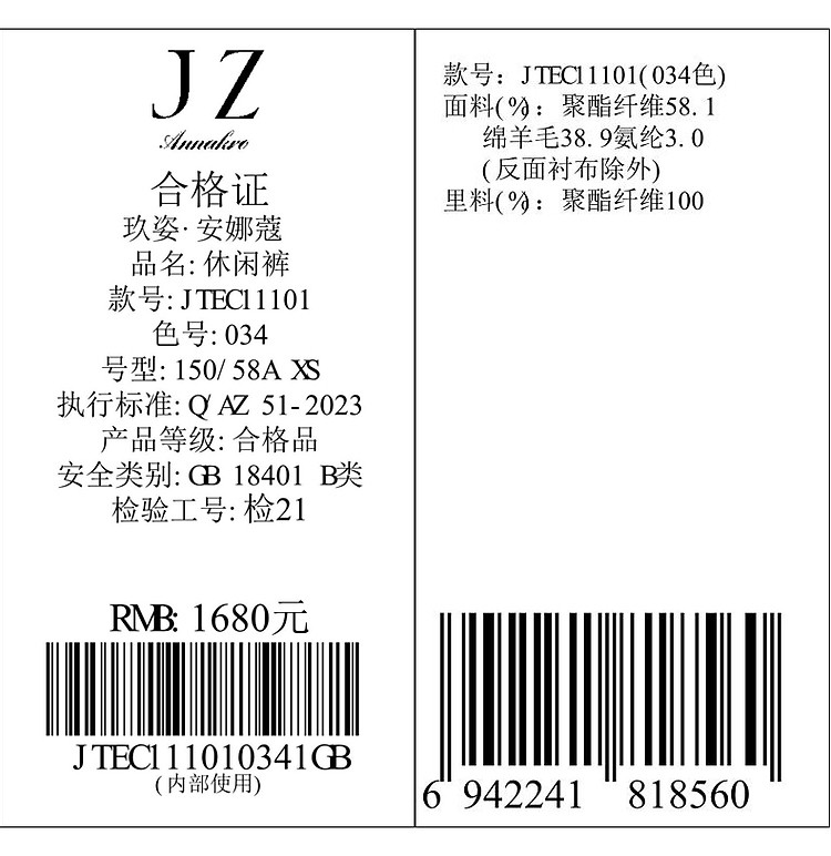 商品名称:玖姿旗下安娜蔻系列简约立体中线锥形裤休闲裤女春季 892556