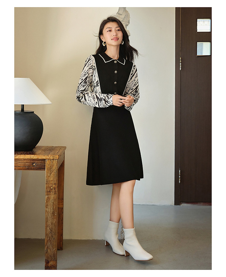 玖姿旗下安娜蔻系列优雅印花假两件拼接毛衫连衣裙女春季 685260