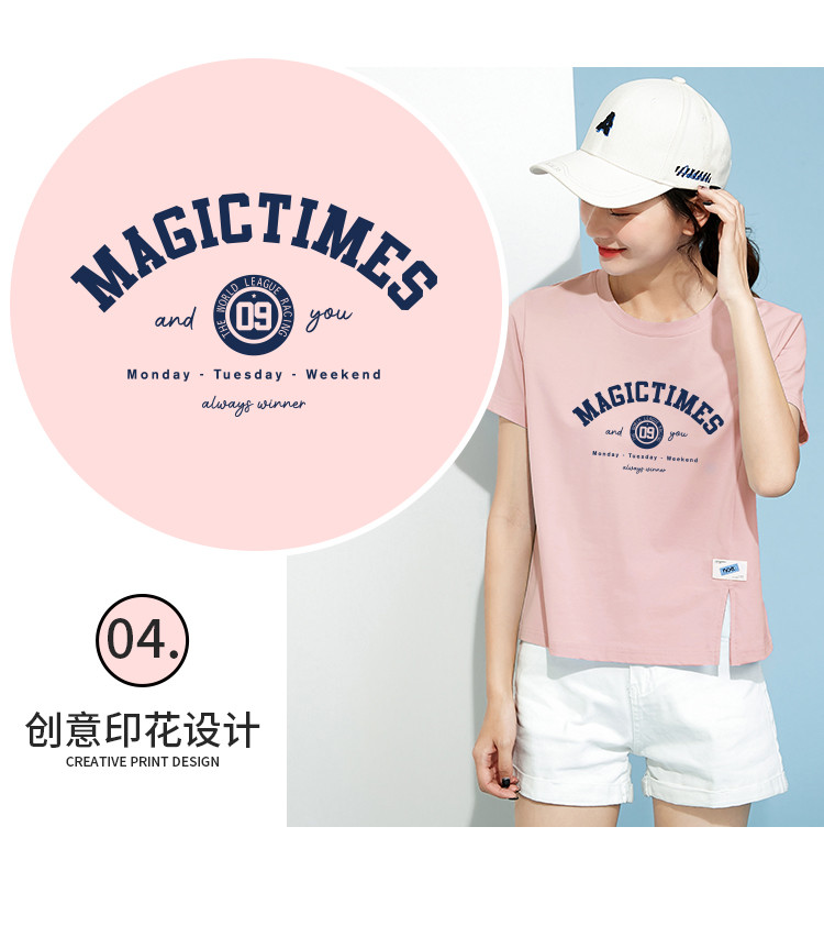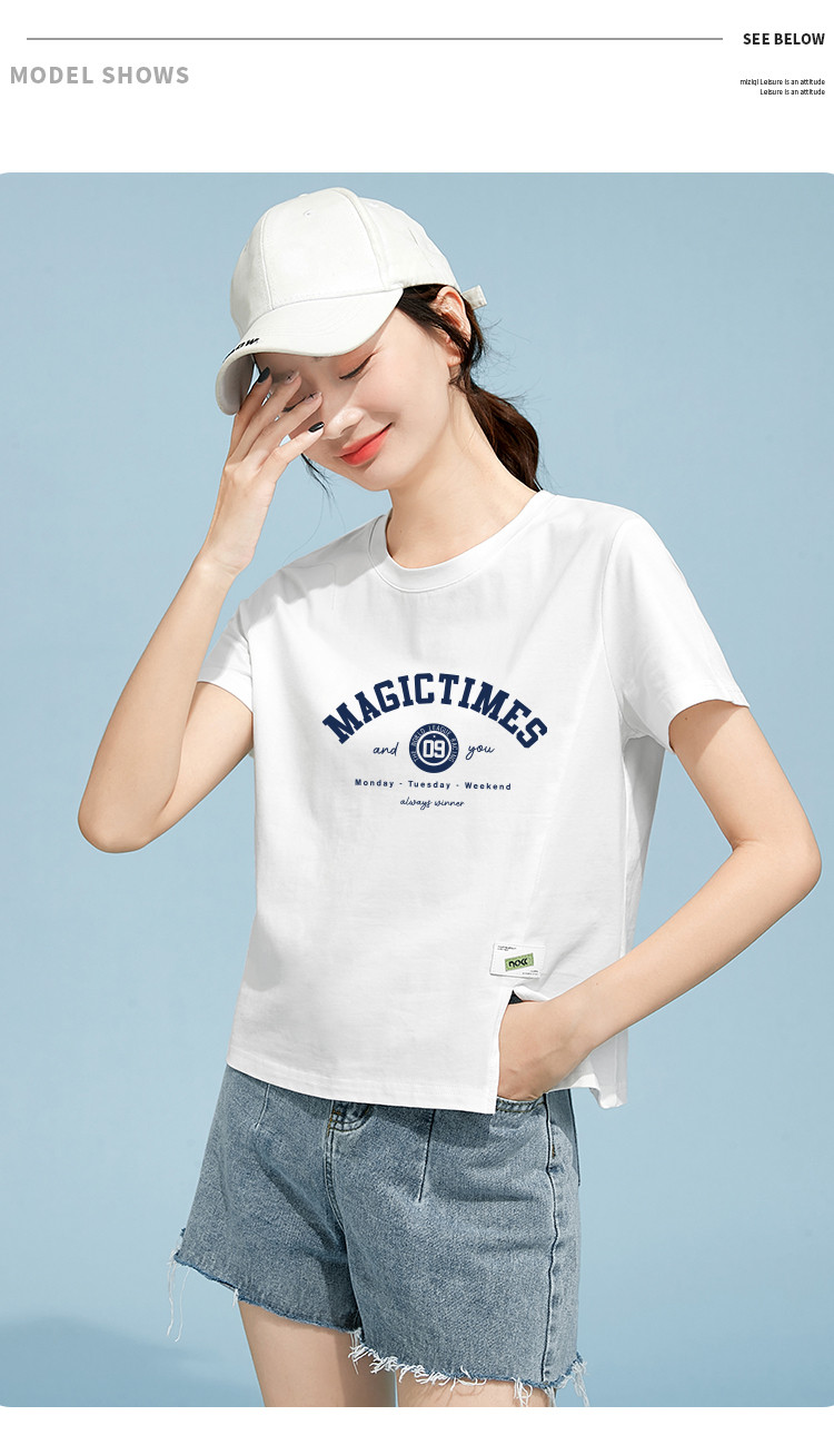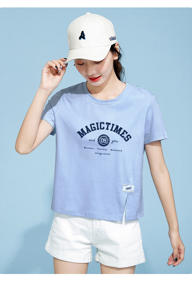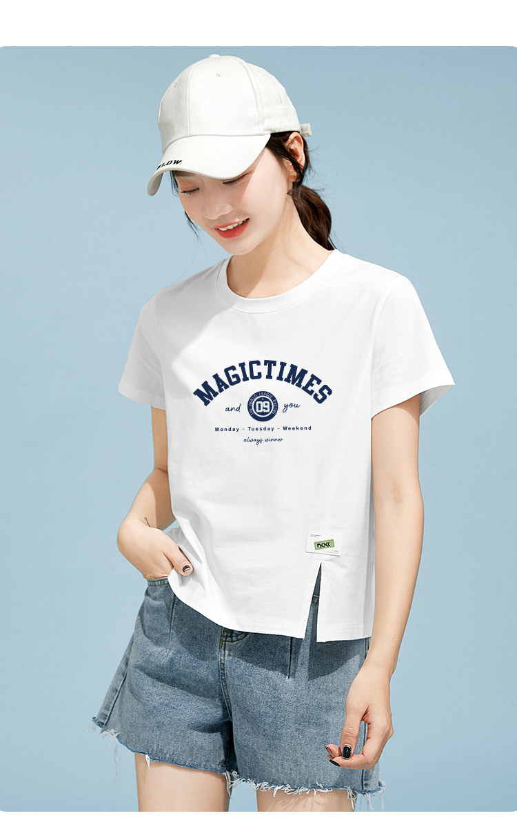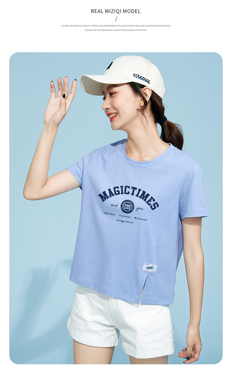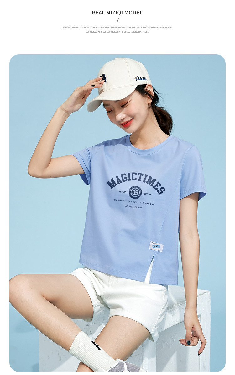 商品名称:米子旗夏季款印花圆领T恤女下摆开叉短款短袖上衣 447322