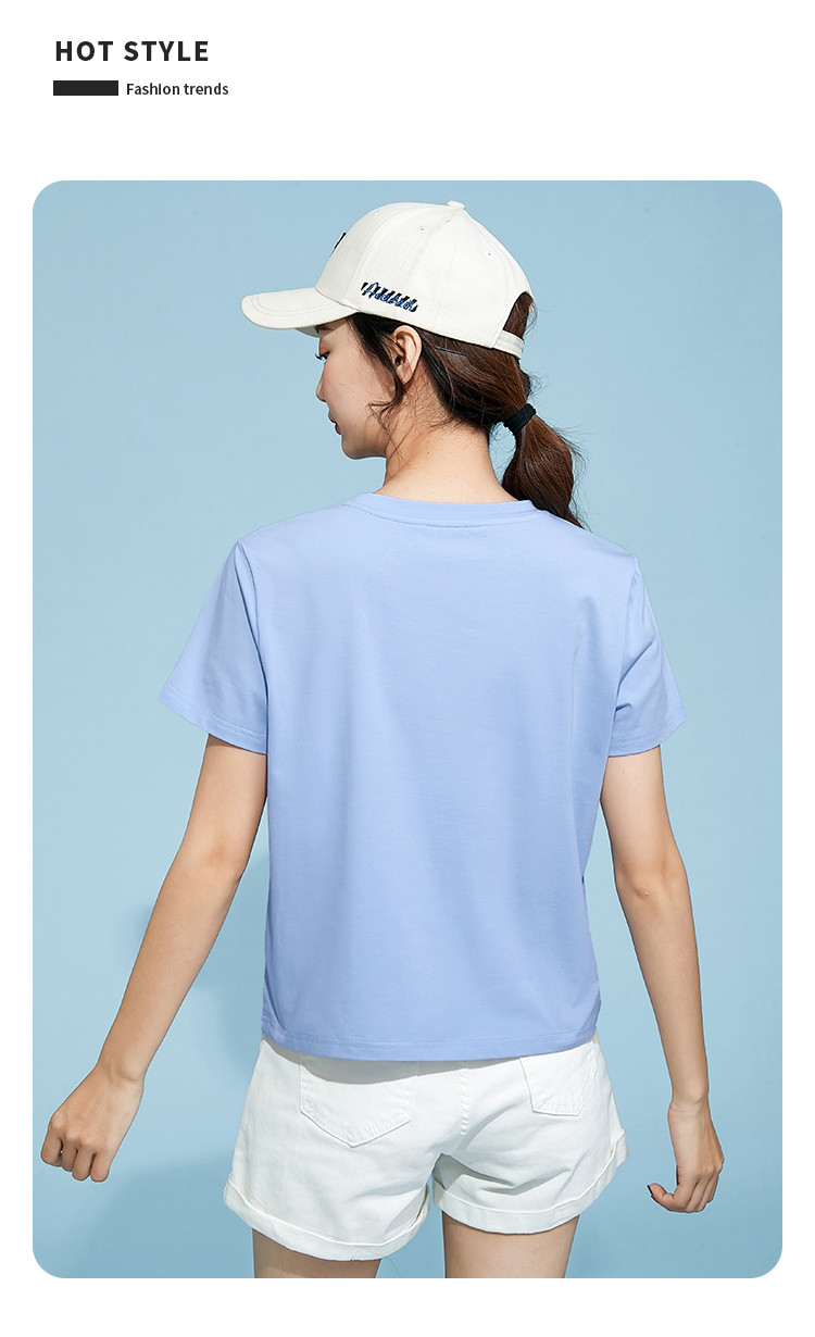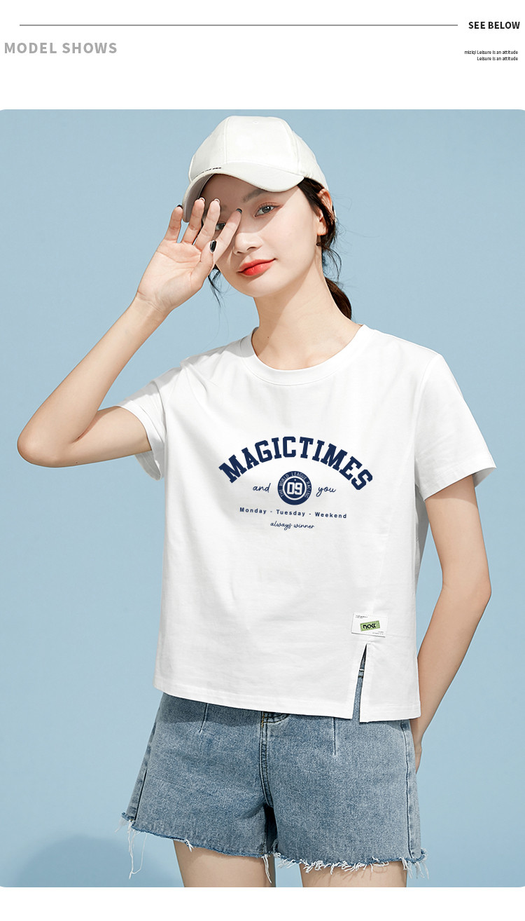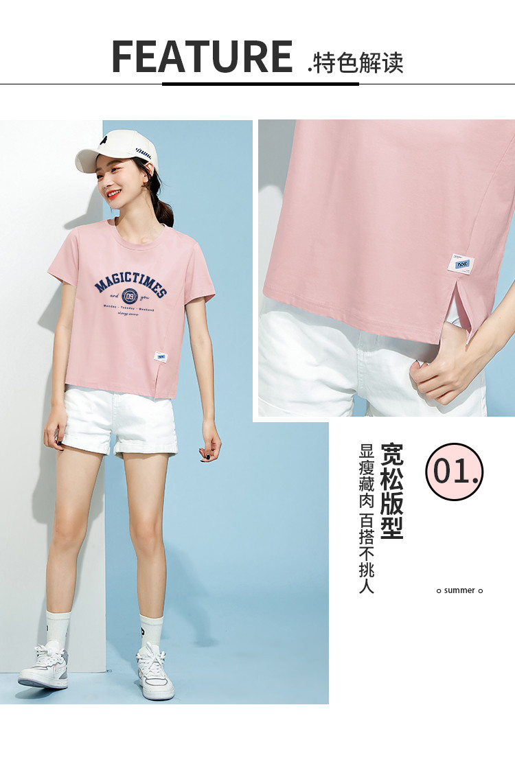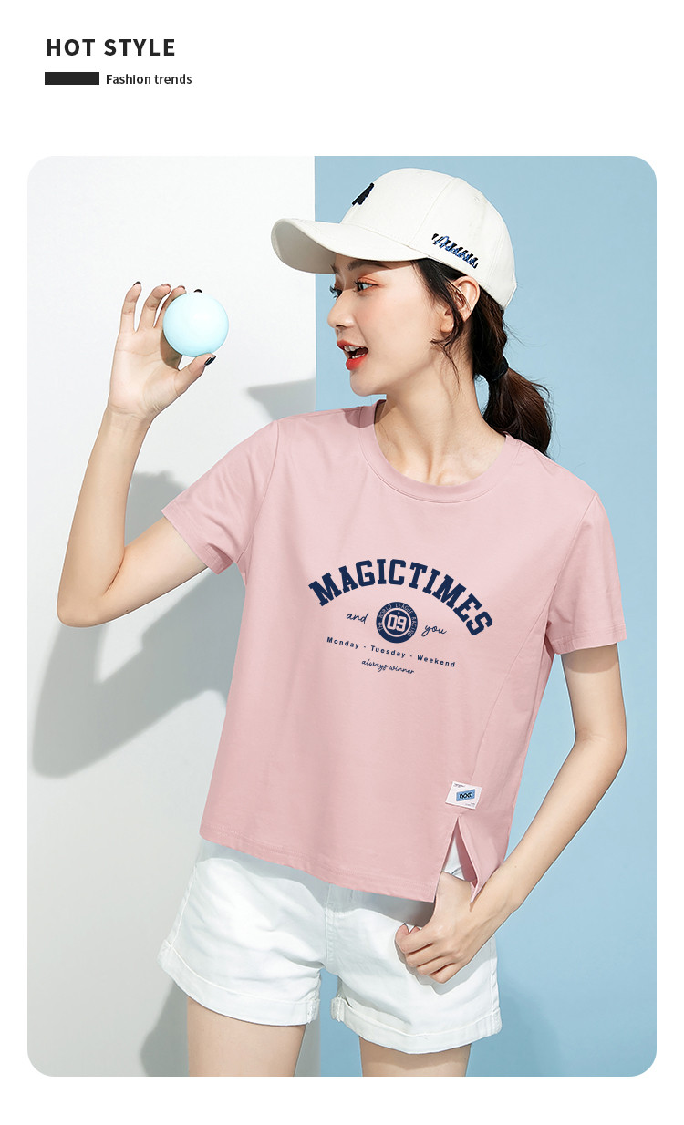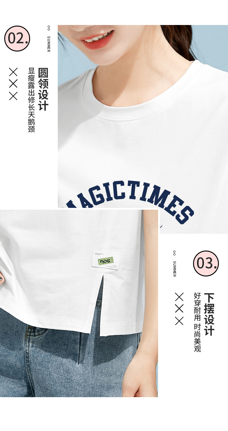 商品名称:米子旗夏季款印花圆领T恤女下摆开叉短款短袖上衣 447322