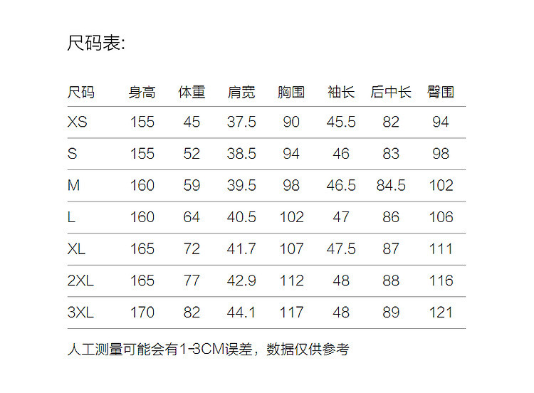 | 尺码 | 裙长(cm) | 肩宽(cm) | 臀围(cm) | 袖长(cm) | 胸围(cm) | 号型 |