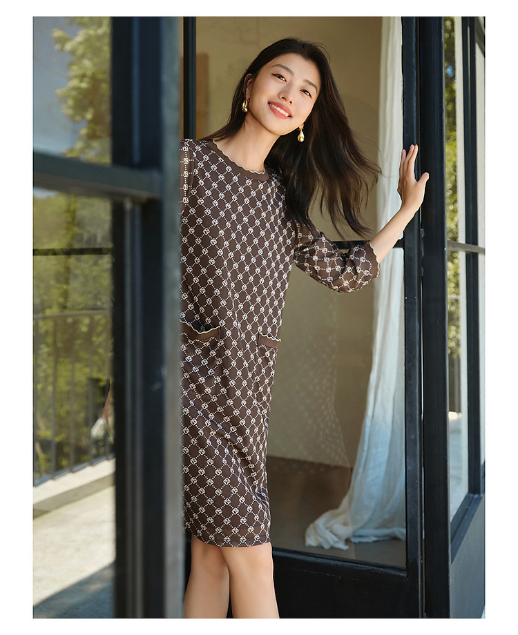 玖姿旗下安娜蔻系列经典老花摩登印花直筒连衣裙女春季 330188