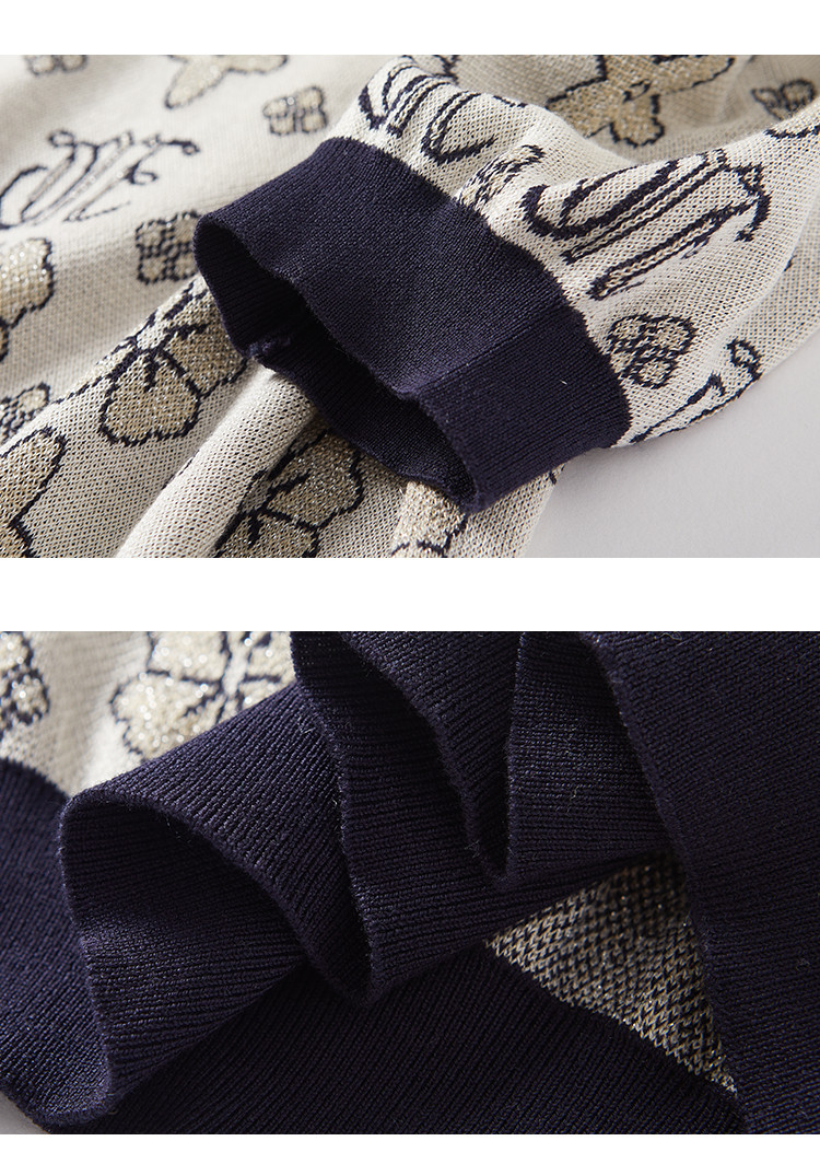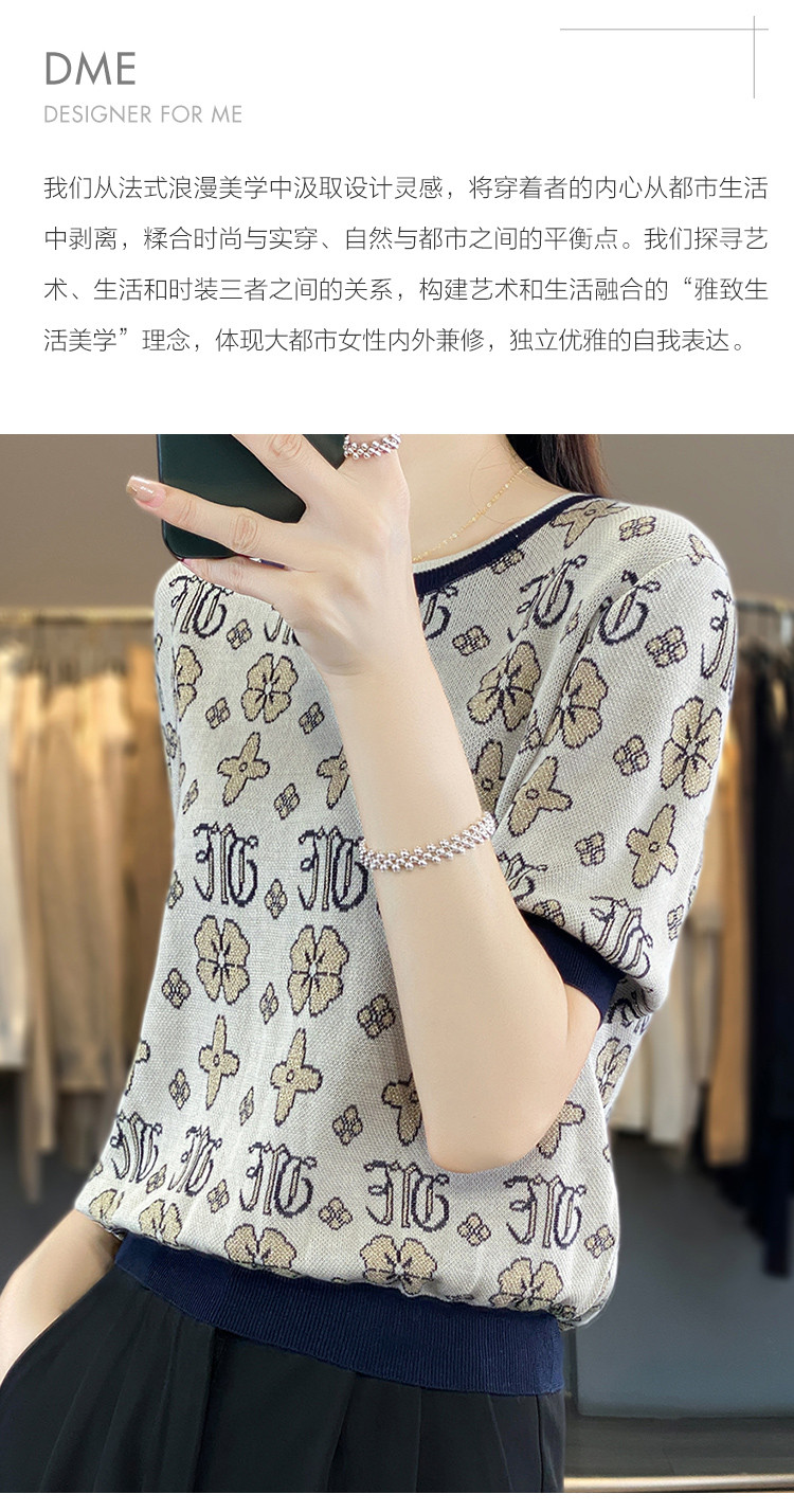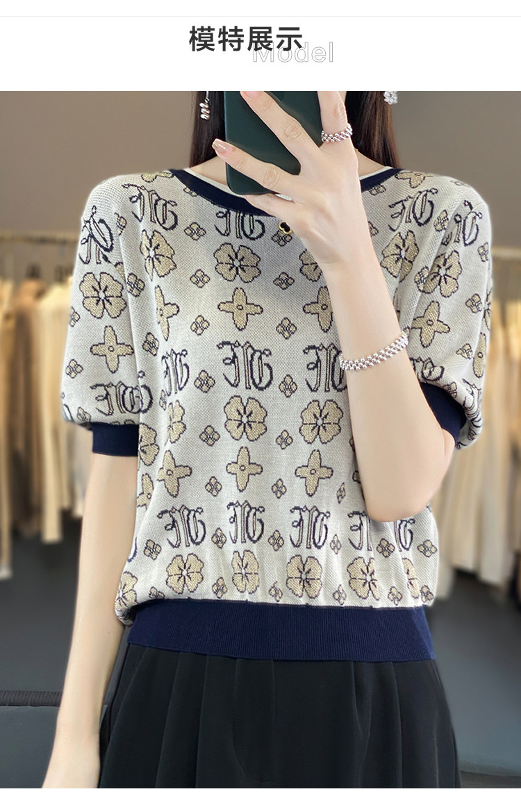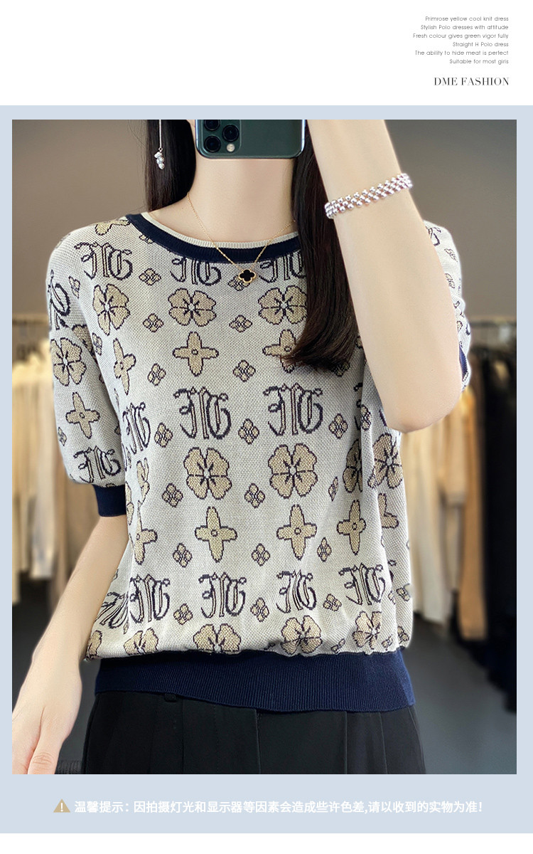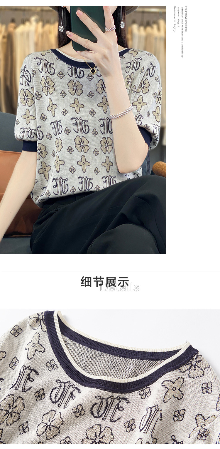 商品名称:【舒柔莱赛尔】夏季复古撞色印花线衫短袖小个子气质针织衫女上衣 007937
