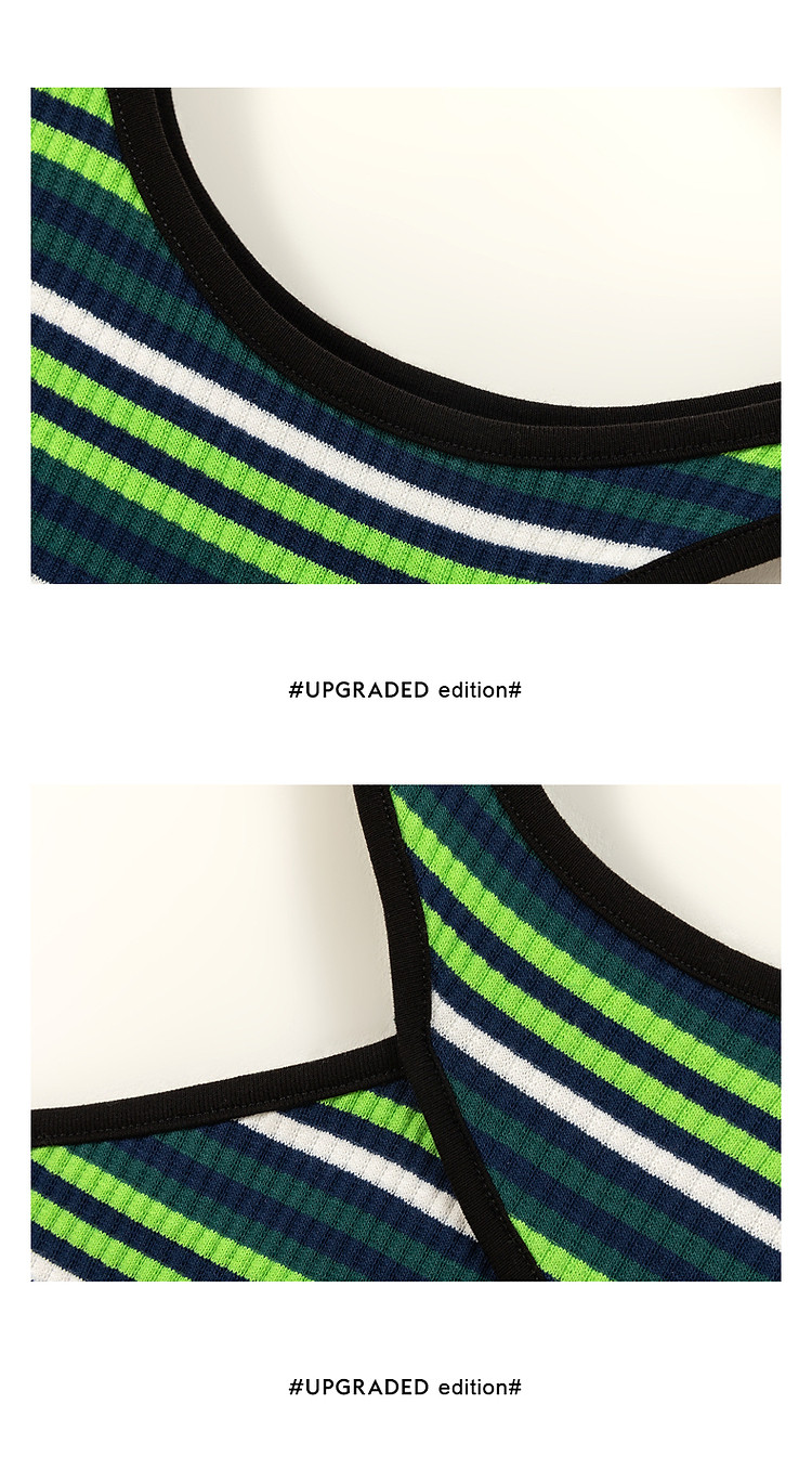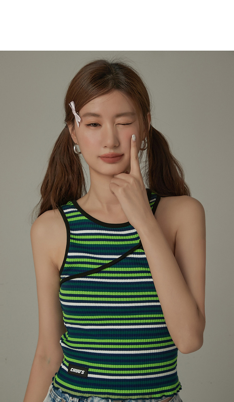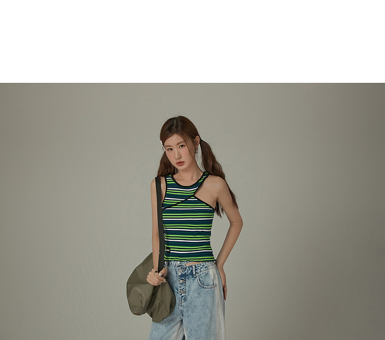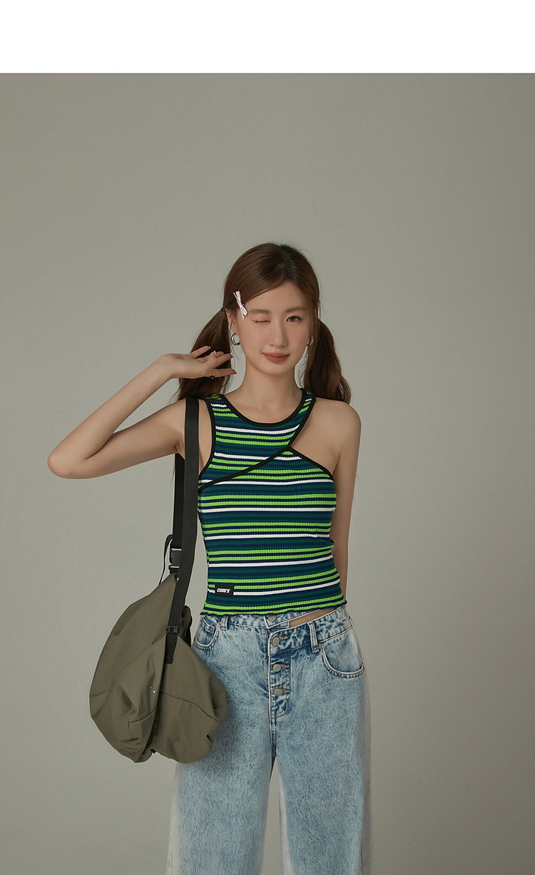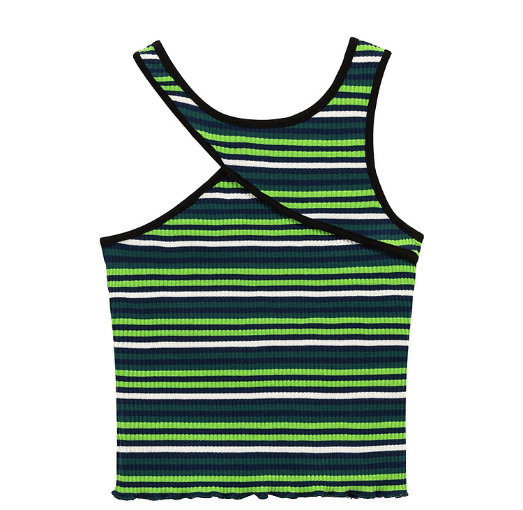 商品名称:条纹无袖背心女春秋不对称露背木耳边撞色外穿上衣 385619
