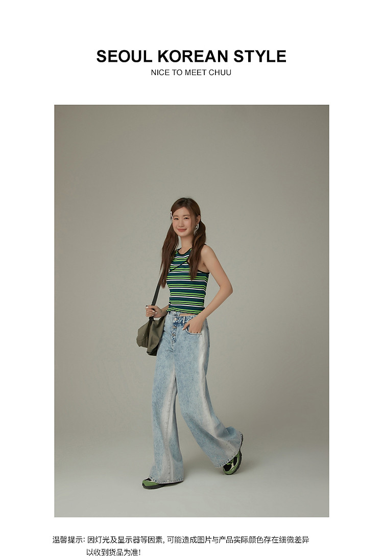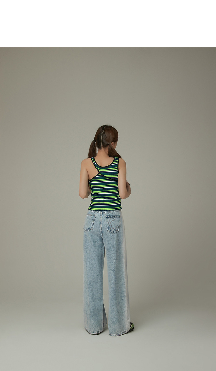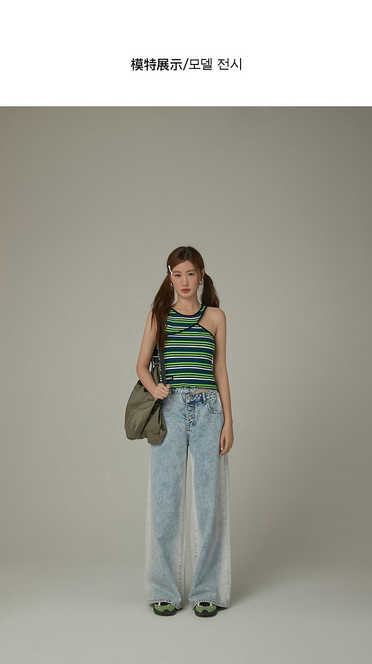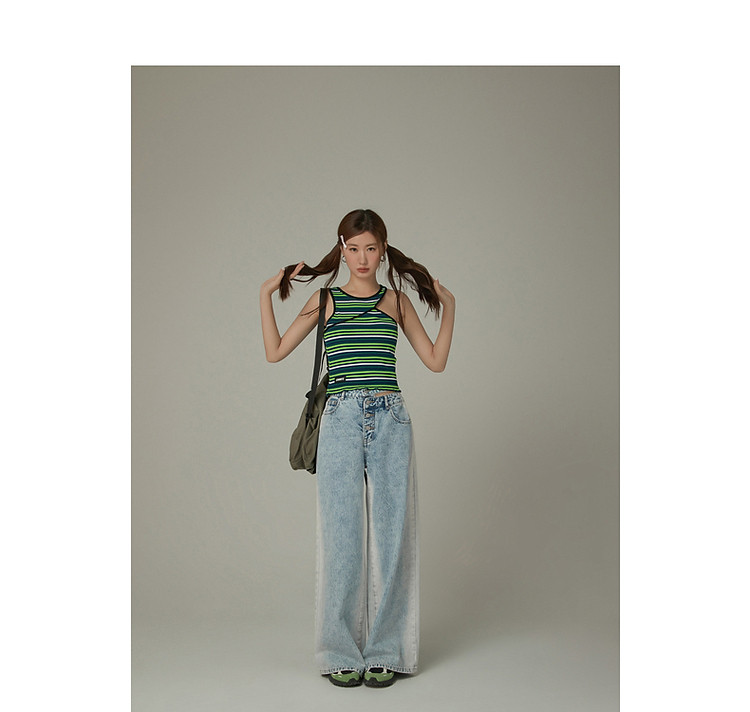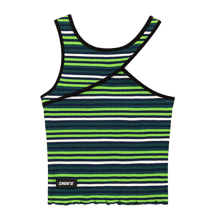 商品名称:条纹无袖背心女春秋不对称露背木耳边撞色外穿上衣 385619
