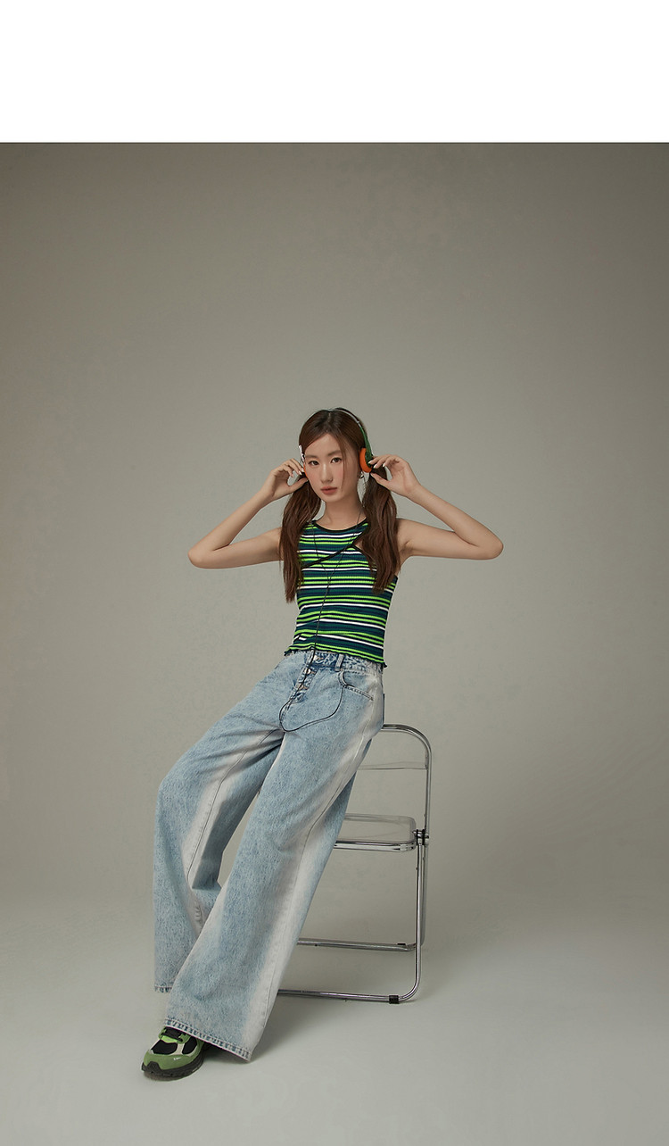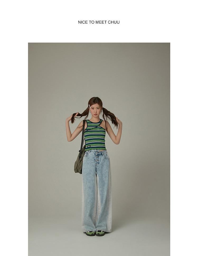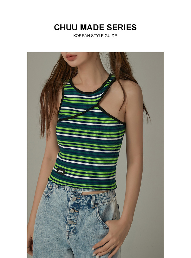 条纹无袖背心女春秋不对称露背木耳边撞色外穿上衣 385619