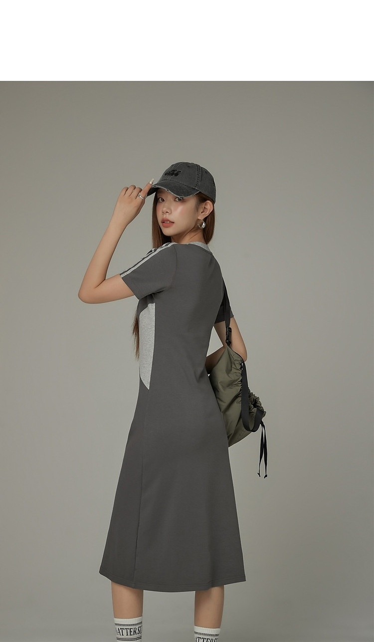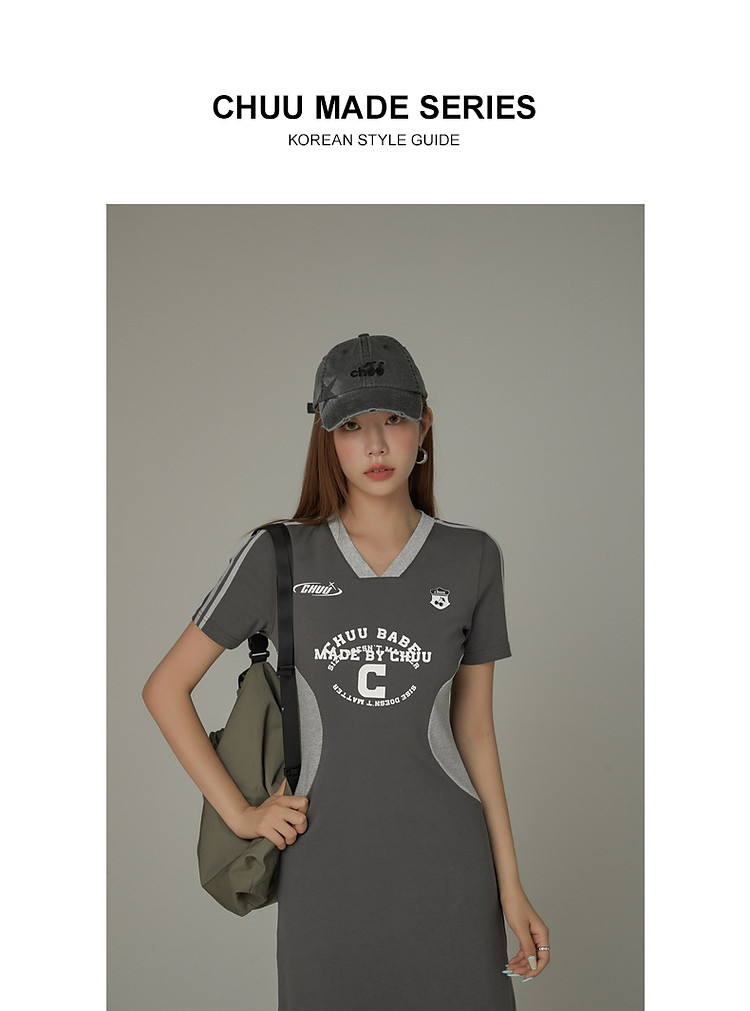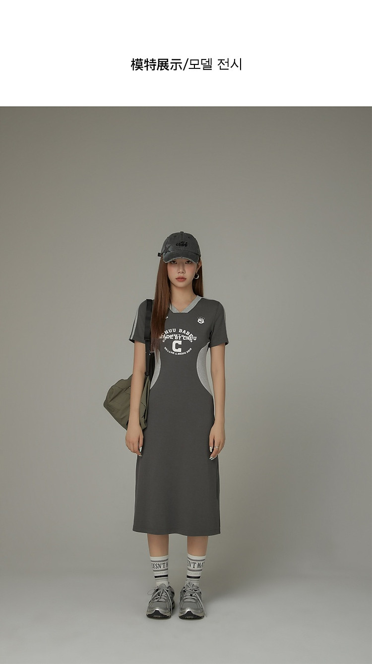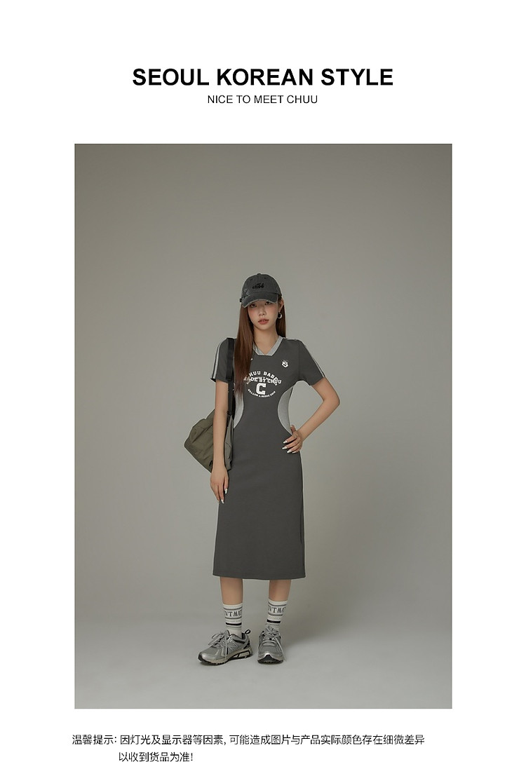 商品名称:CHUU拼接短袖连衣裙女春秋学院字母印花撞色中长裙 027091