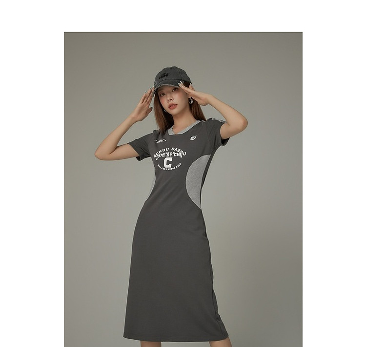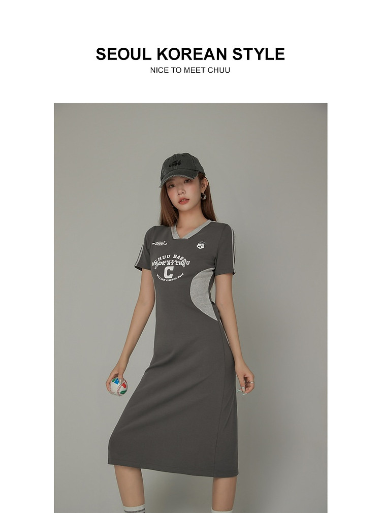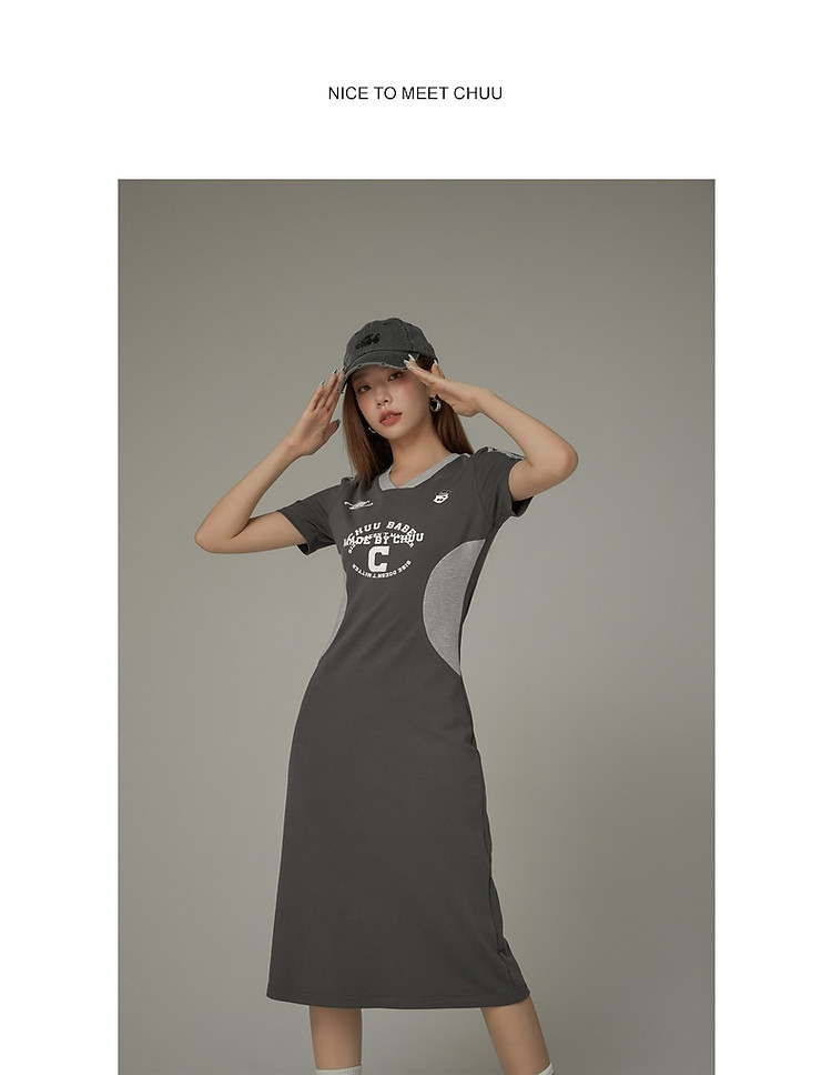 CHUU拼接短袖连衣裙女春秋学院字母印花撞色中长裙 027091