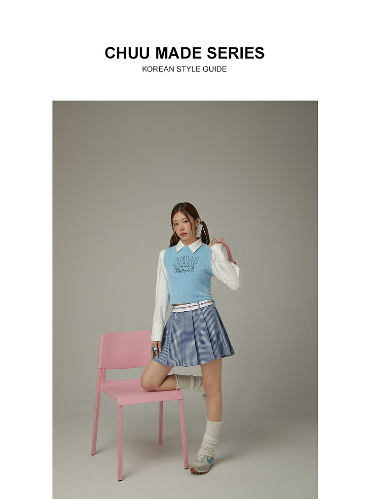 CHUU高腰格子百褶半身裙女春秋撞色印花a字裙子 670739