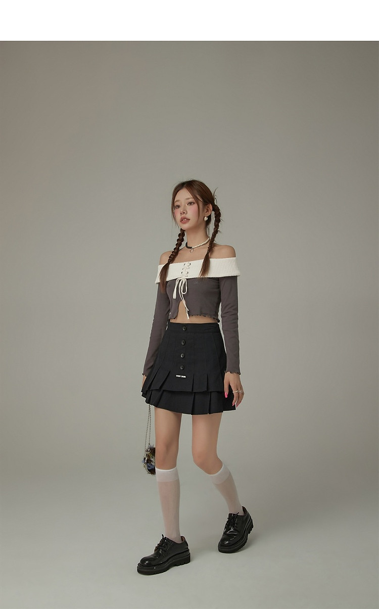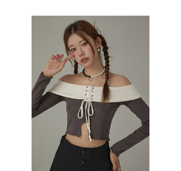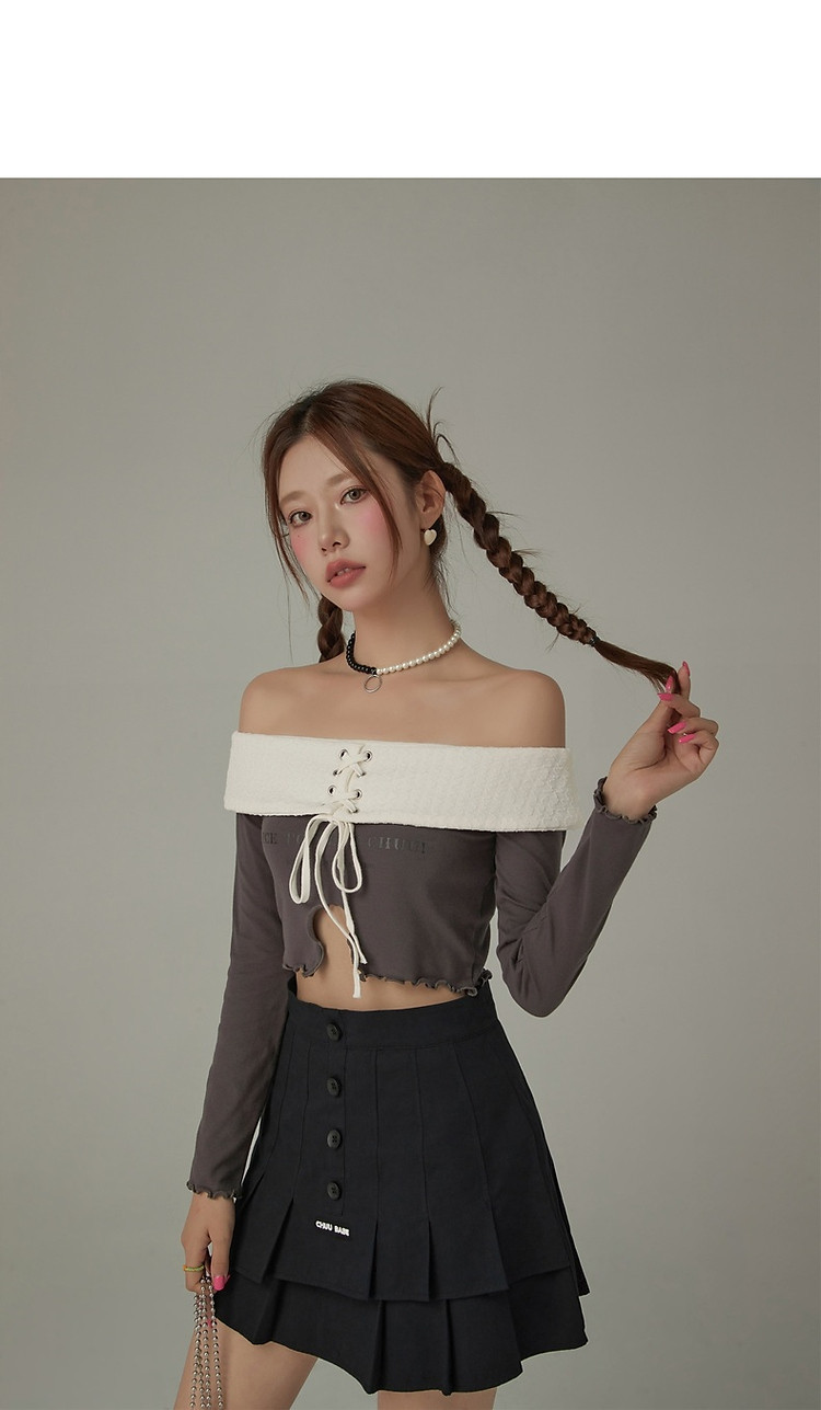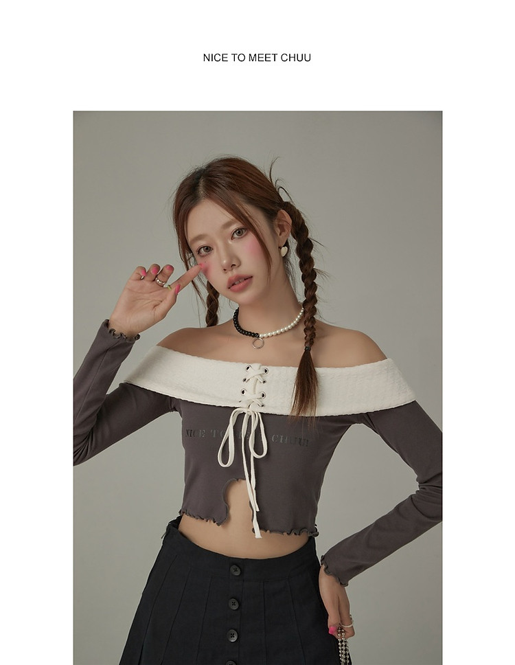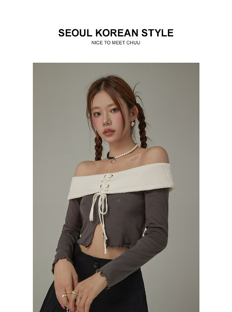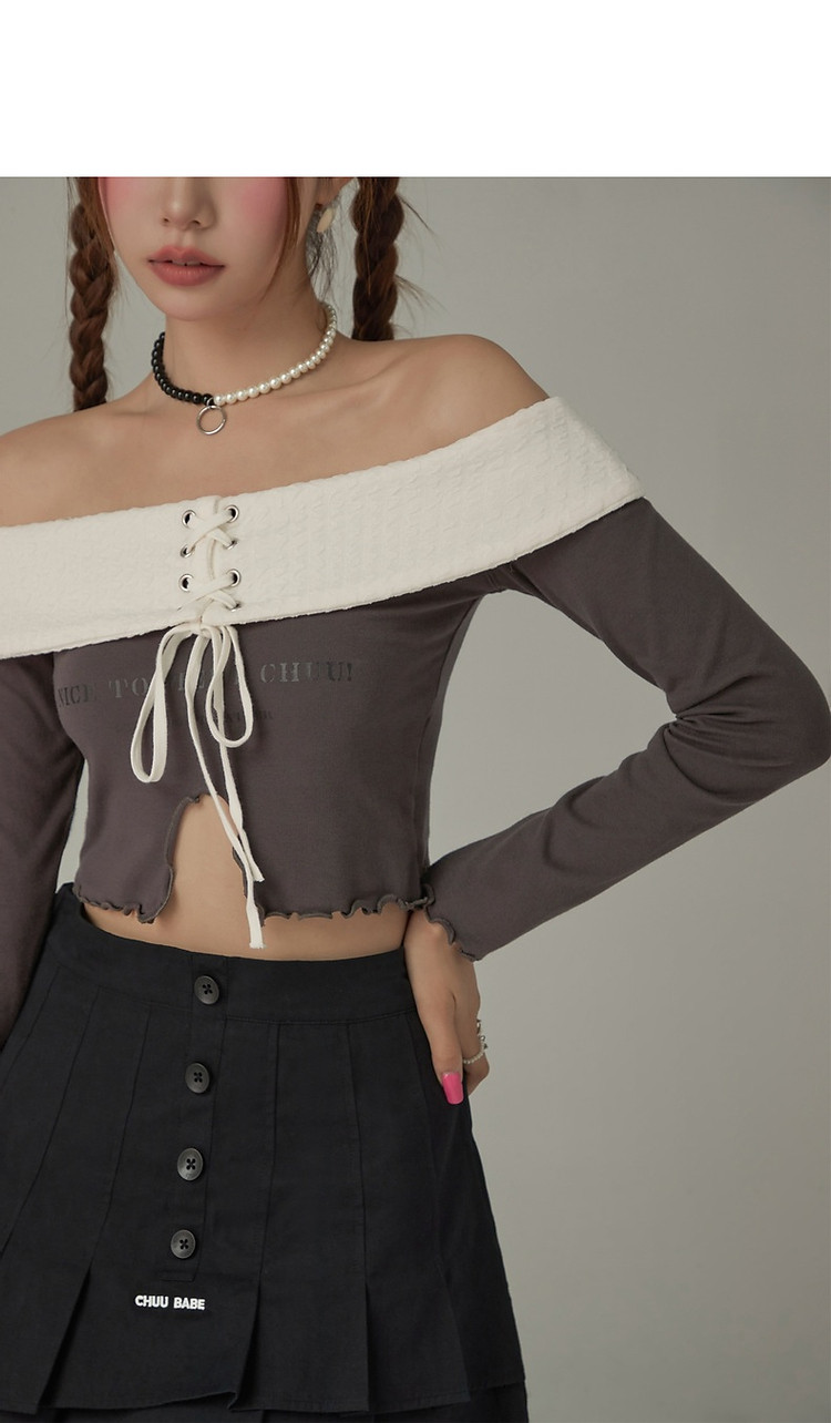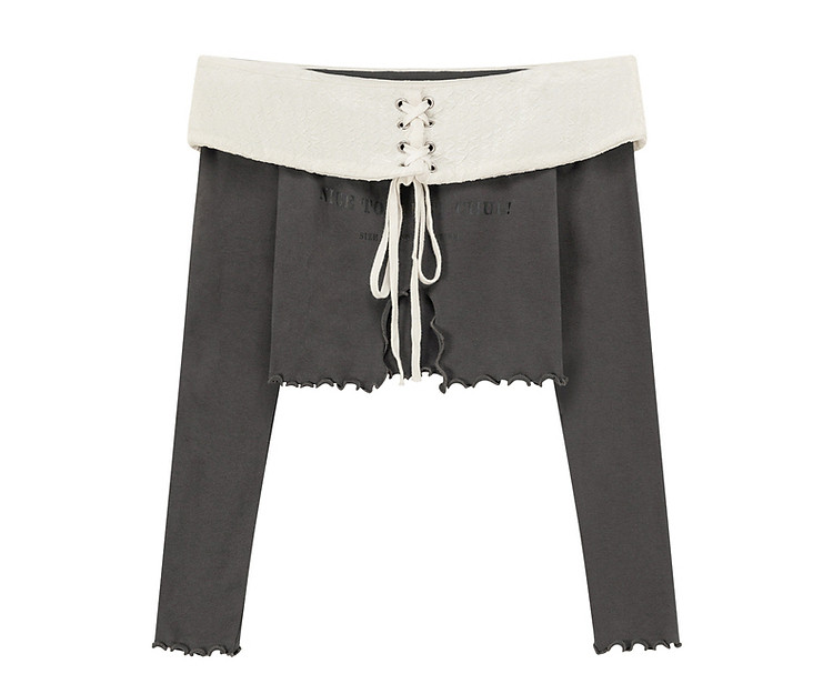 撞色系带长袖T恤女春秋字母开叉一字肩木耳边上衣 450387