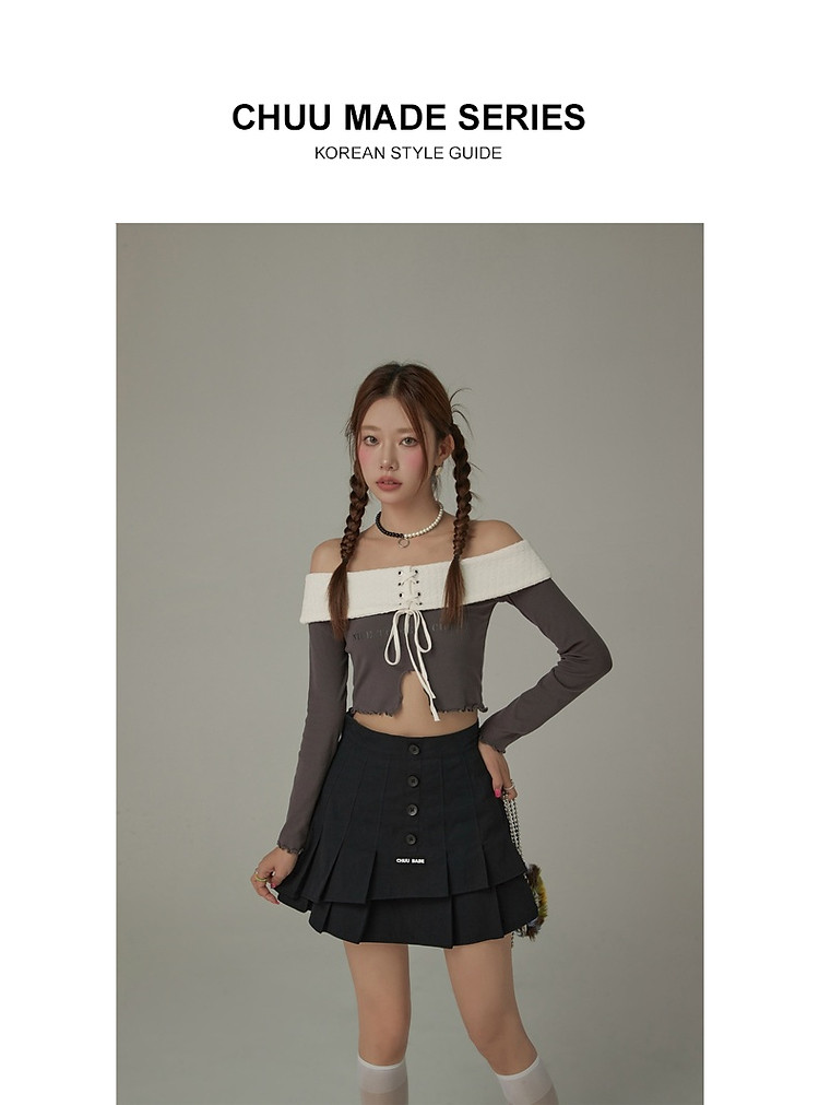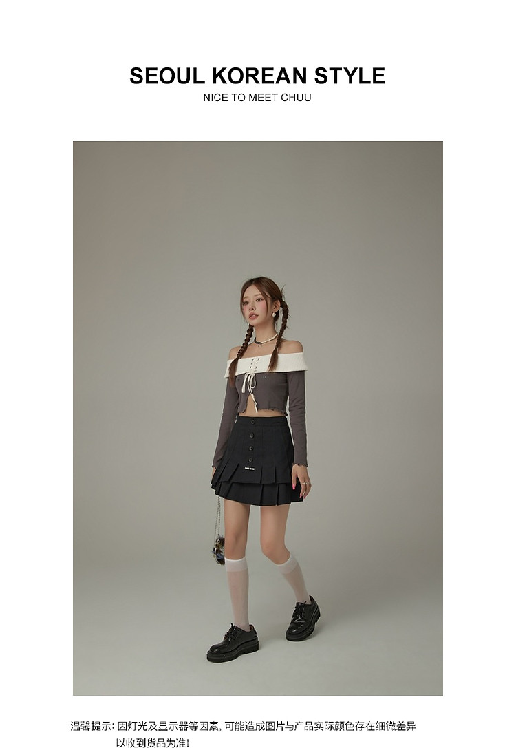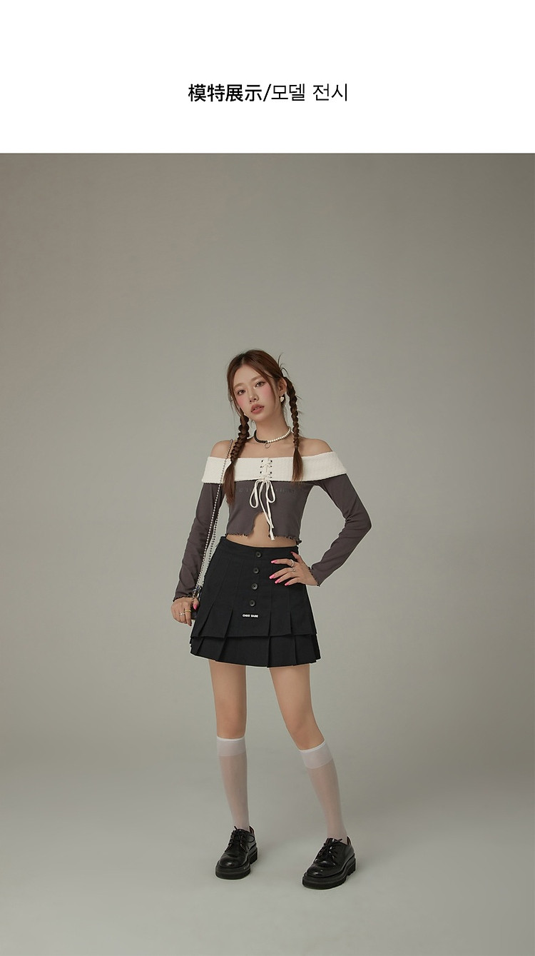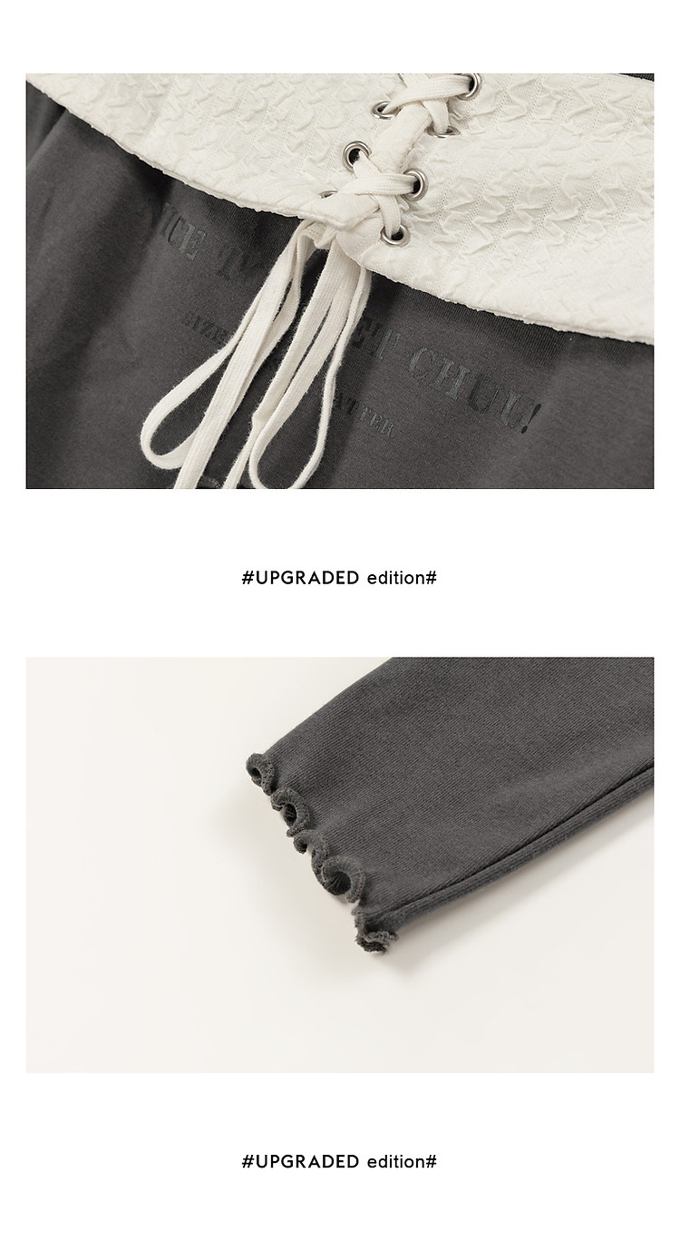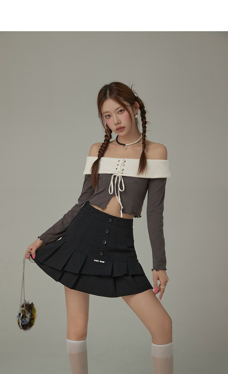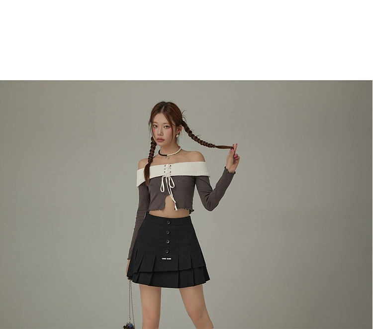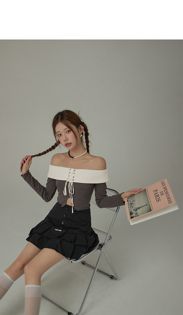 撞色系带长袖T恤女春秋字母开叉一字肩木耳边上衣 450387