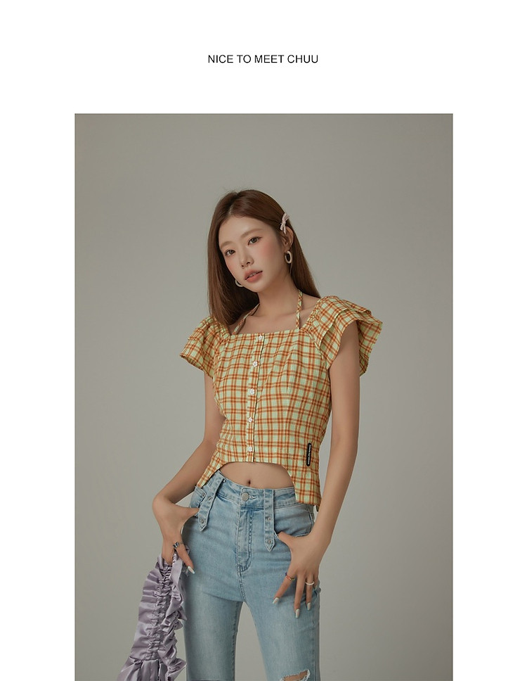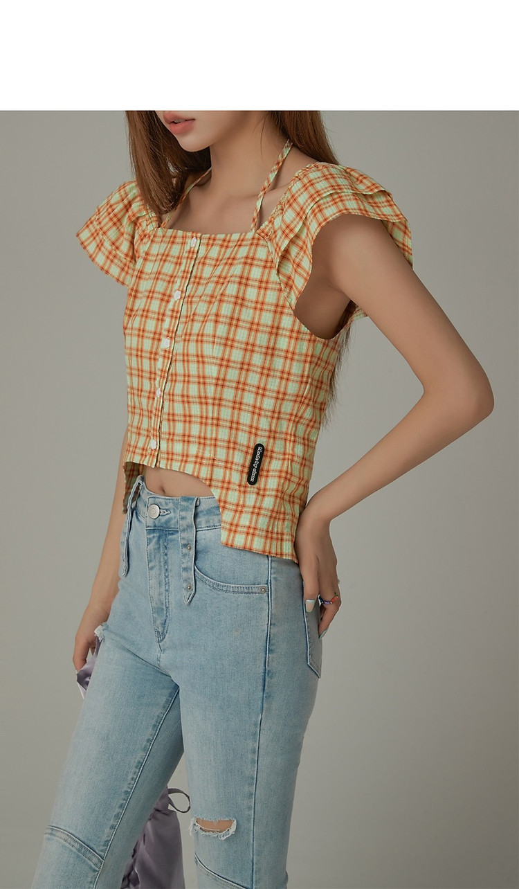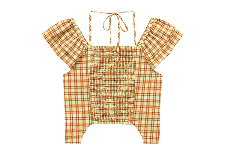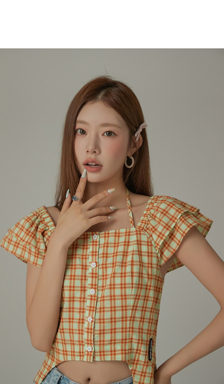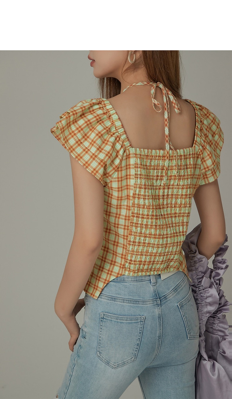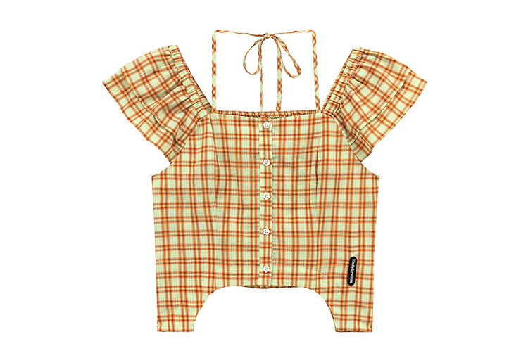 商品名称:格子雪纺衫女春秋挂脖系带甜辣减龄设计感小众上衣 483923