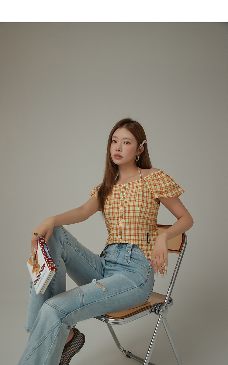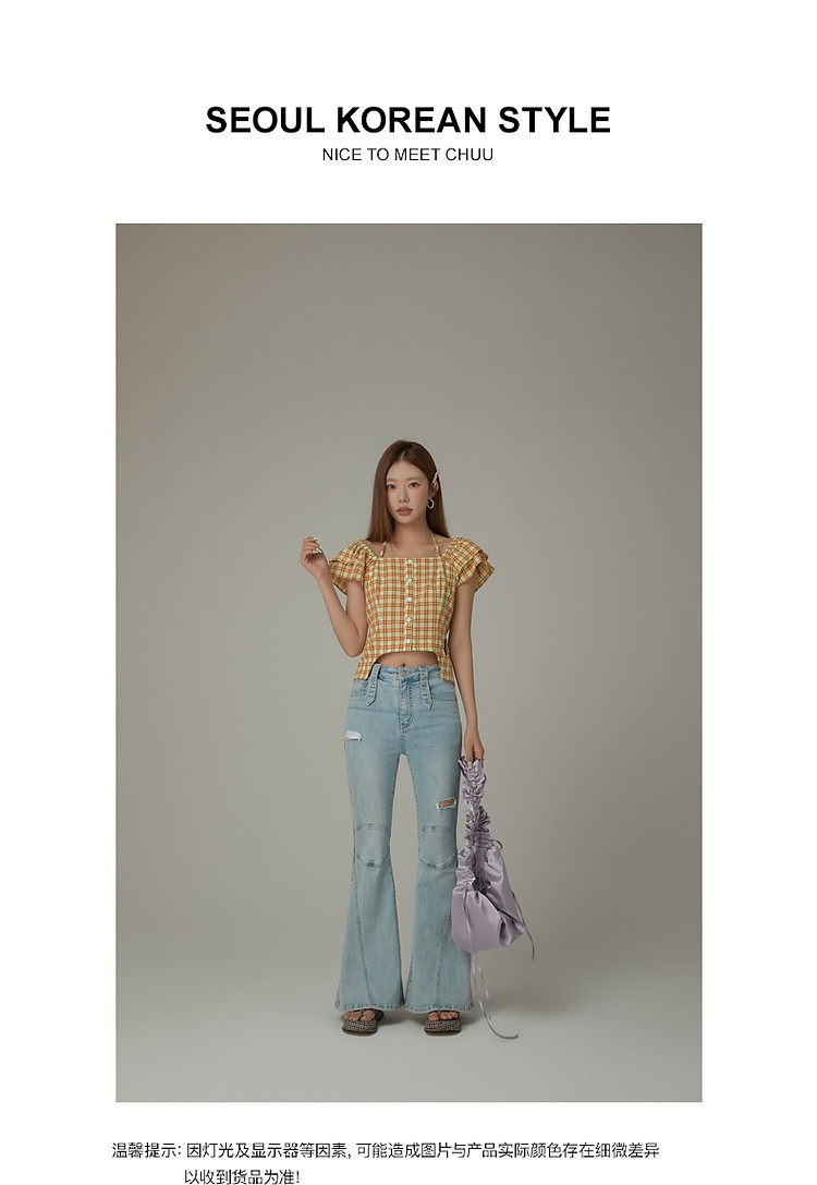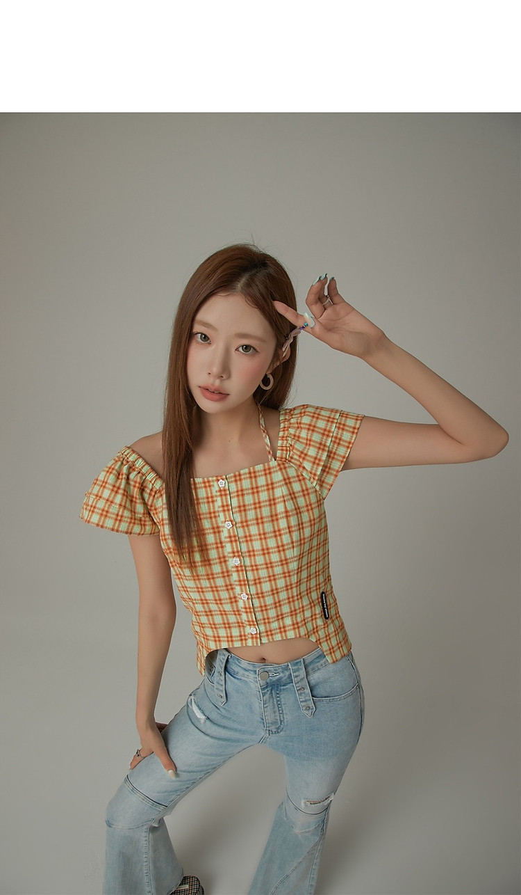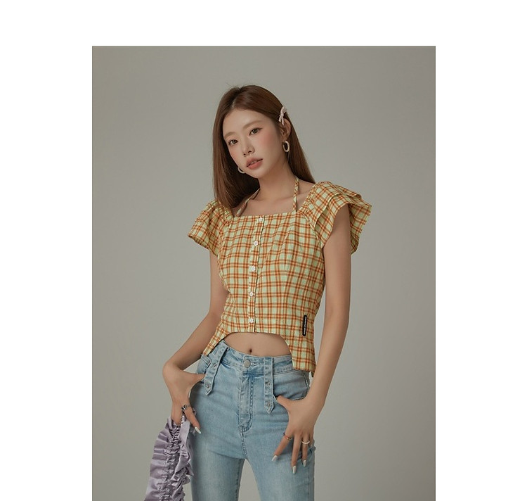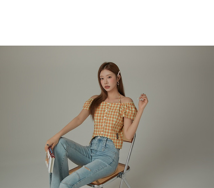 商品名称:格子雪纺衫女春秋挂脖系带甜辣减龄设计感小众上衣 483923