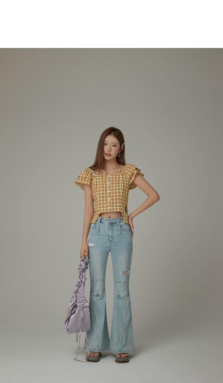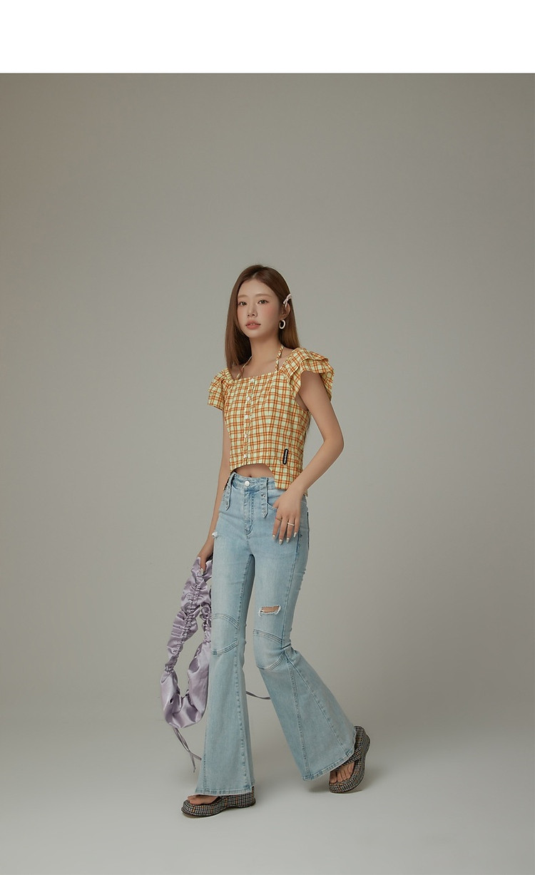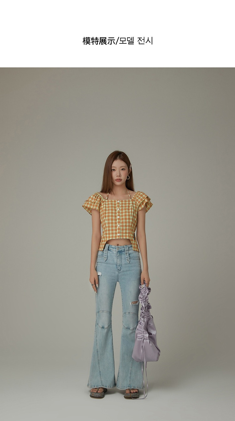 格子雪纺衫女春秋挂脖系带甜辣减龄设计感小众上衣 483923