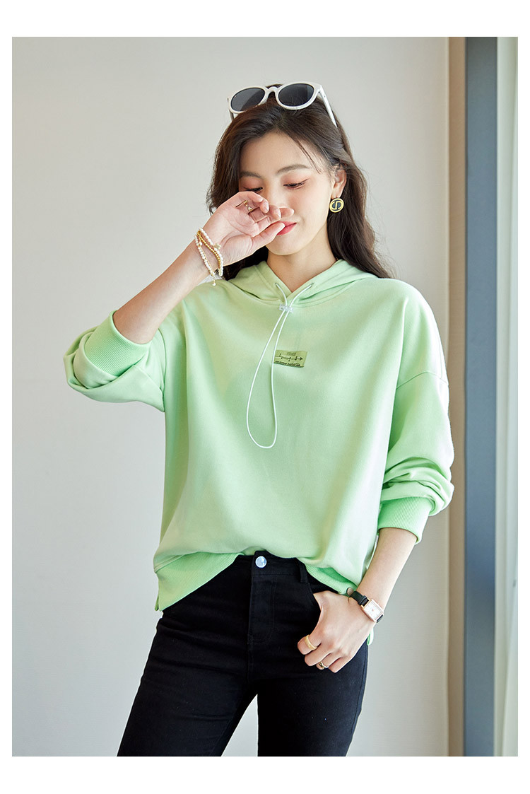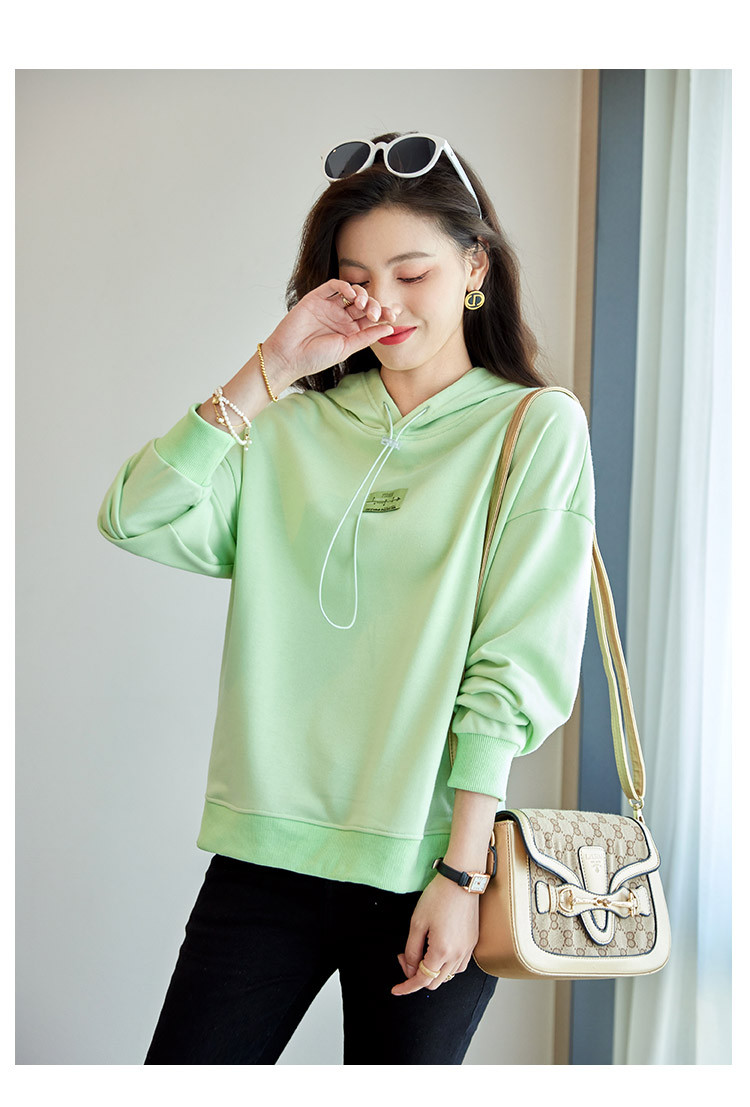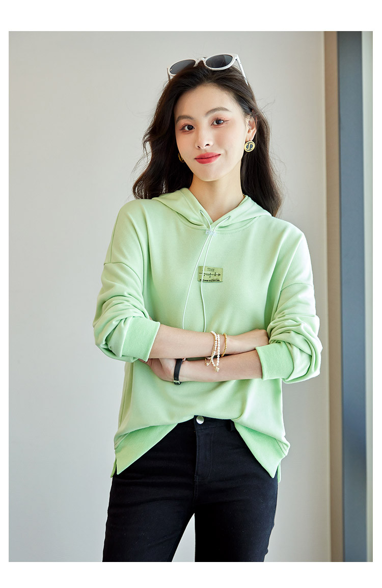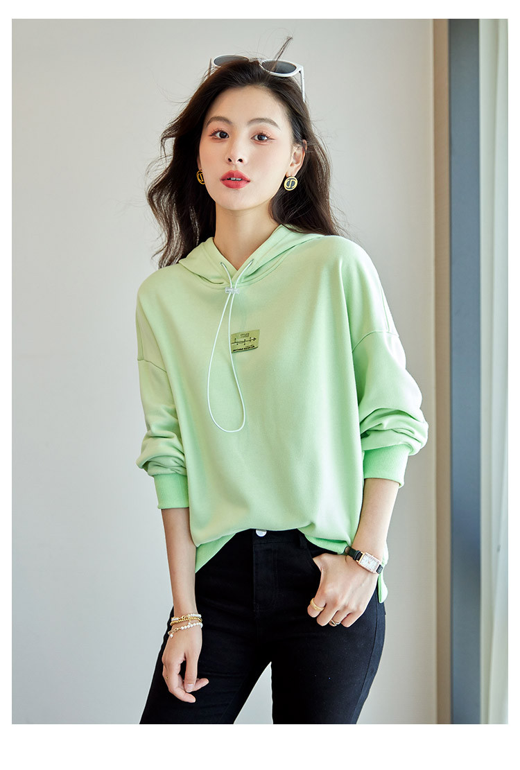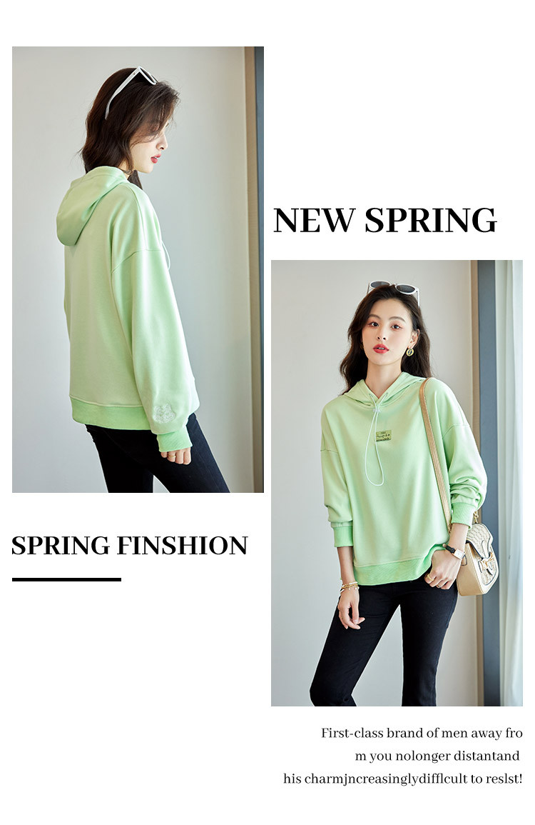 商品名称:连帽女式卫衣春季韩版经典纯色帽口收拉式设计休闲运动风上衣 391000