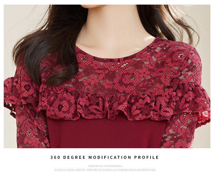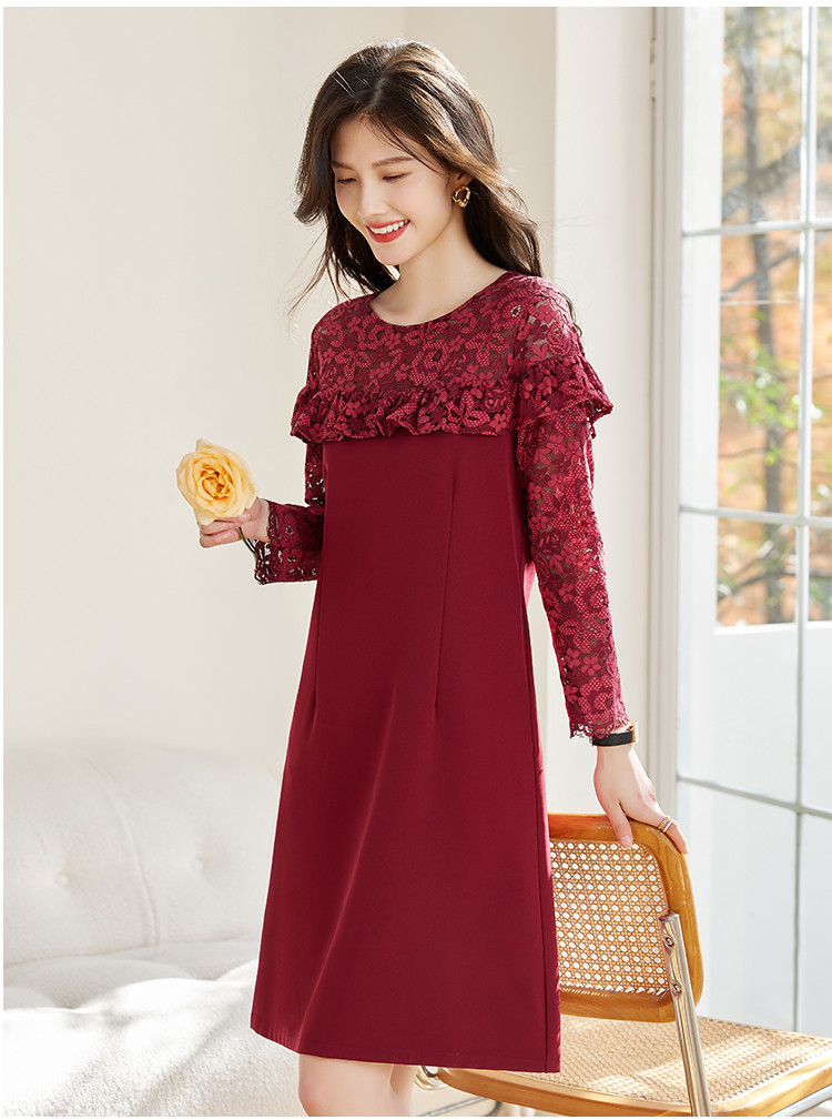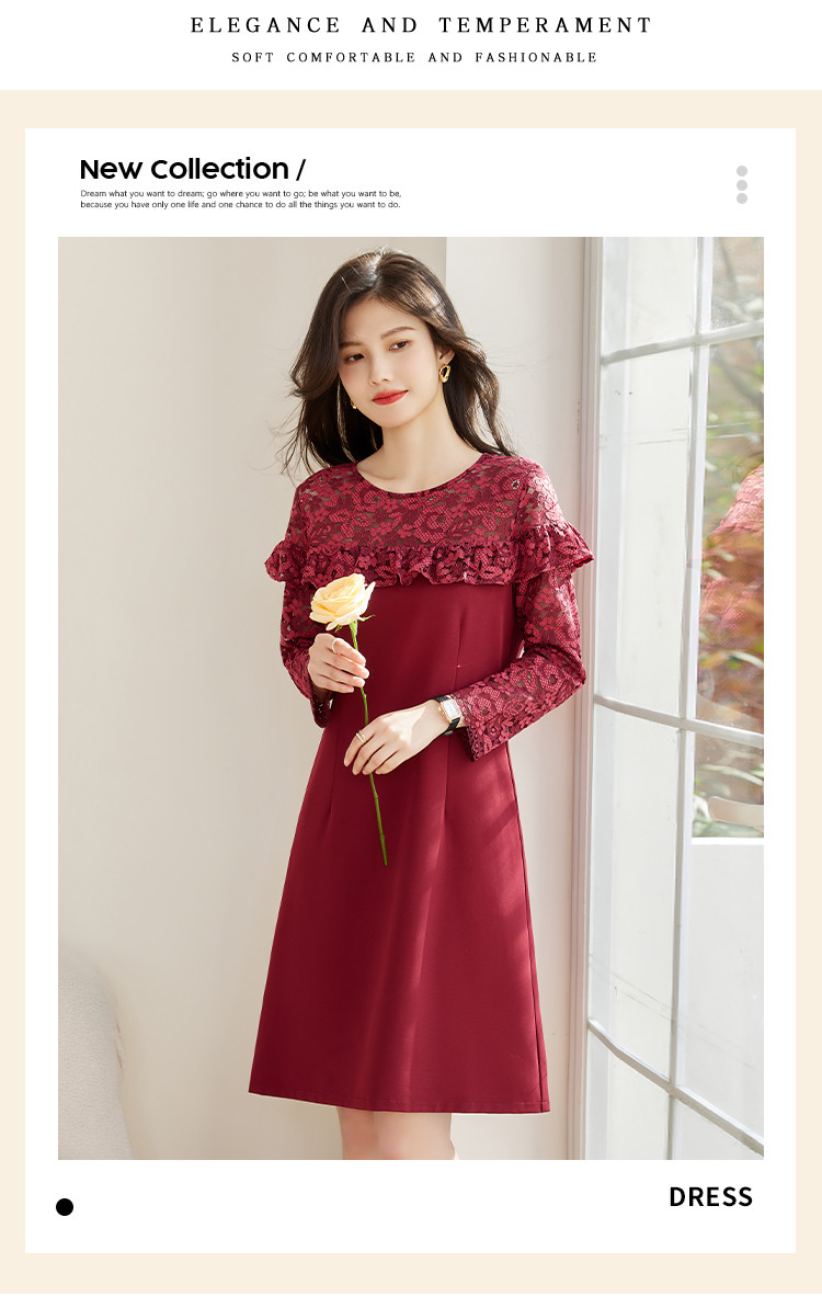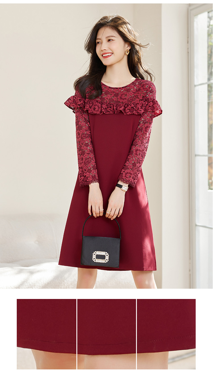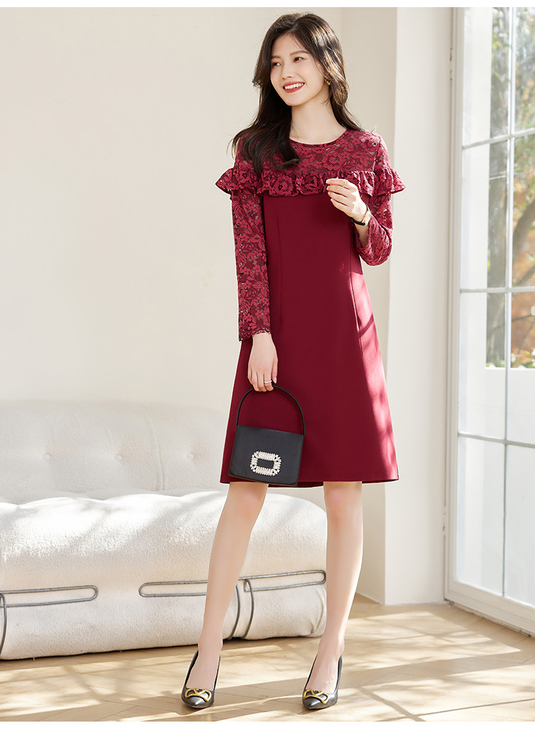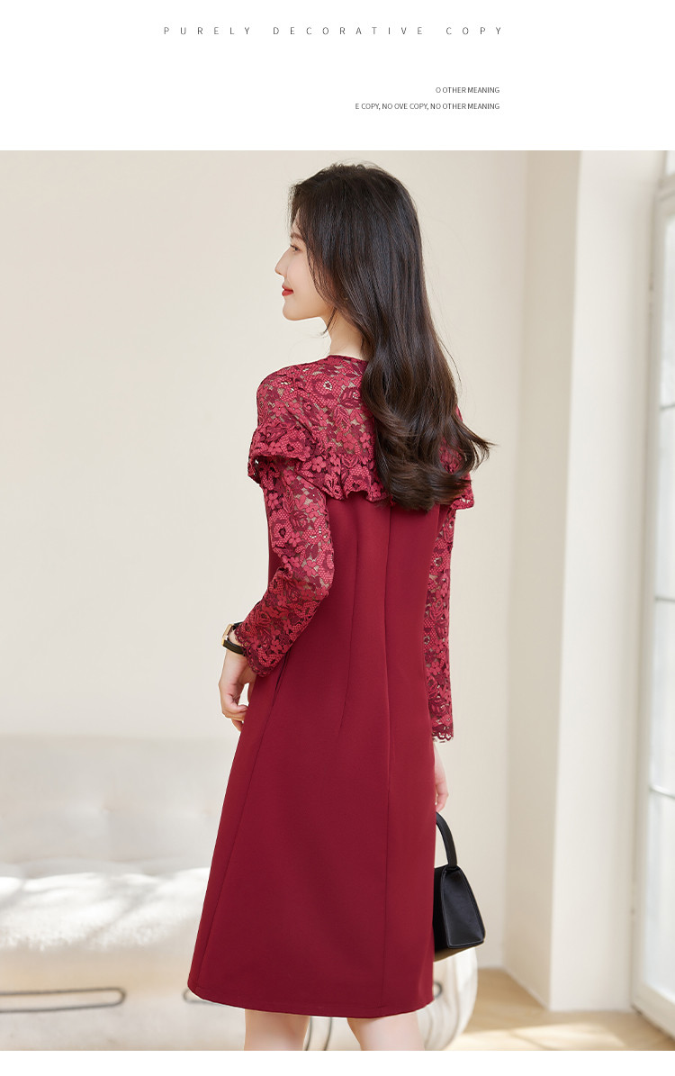 春装女装时尚蕾丝拼接花边领纯色显瘦淑女气质轻奢优雅连衣裙 110168