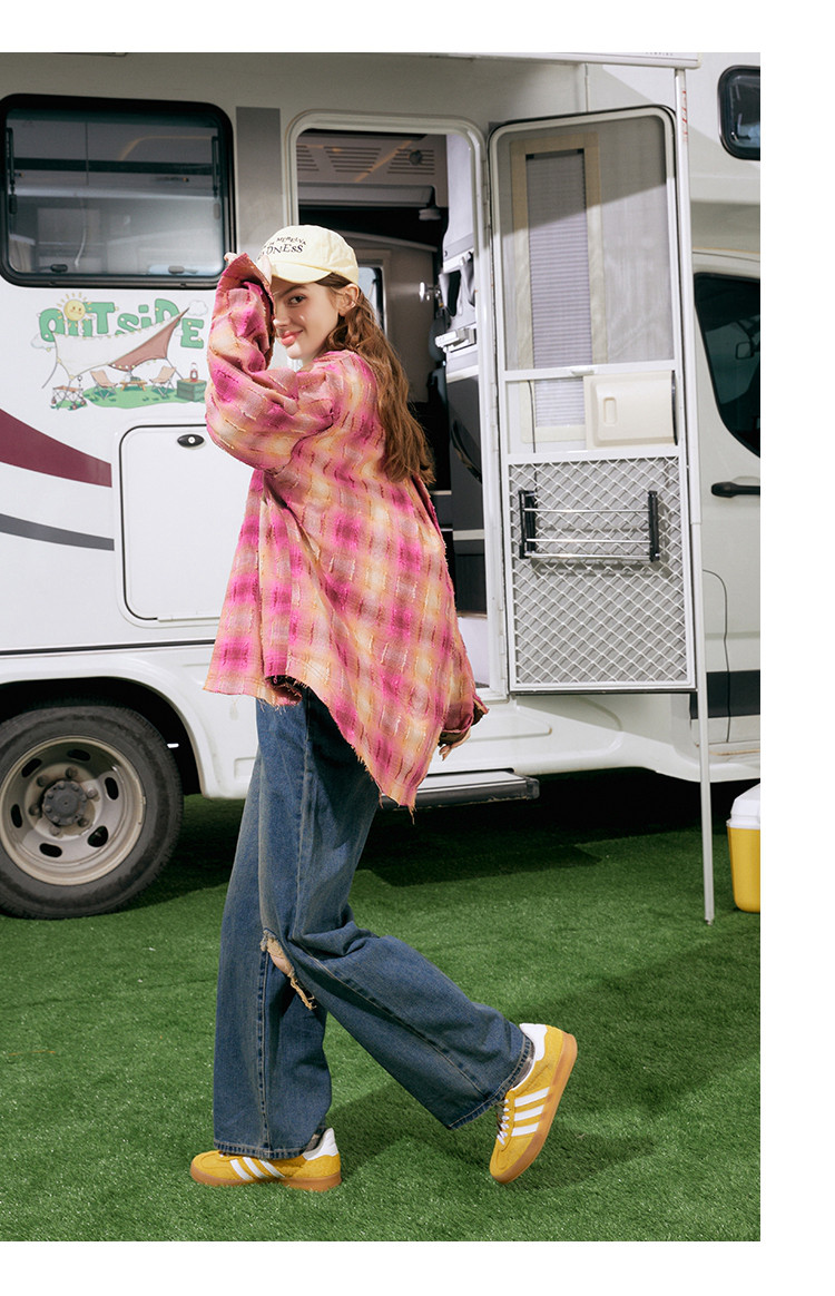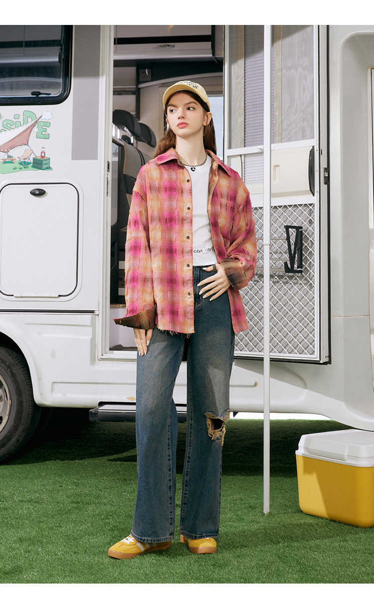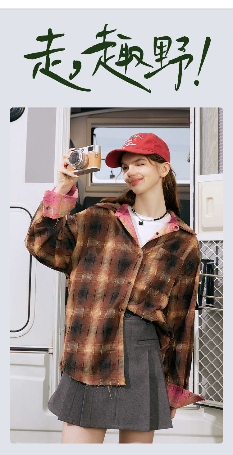 商品名称:宽松休闲双面穿格纹女式衬衫春季个性百搭翻领上衣 023965