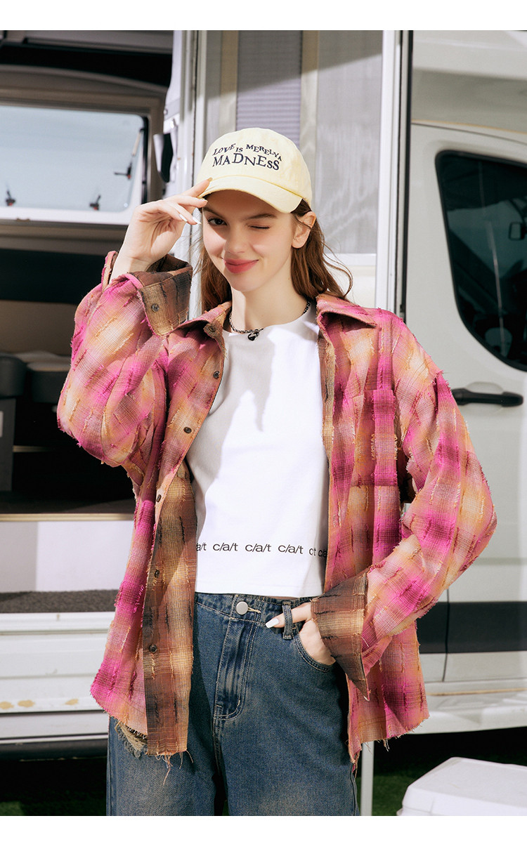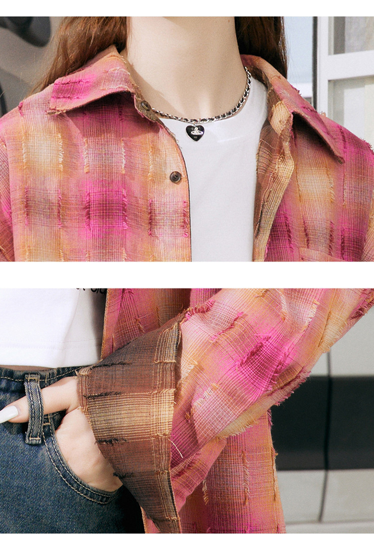 宽松休闲双面穿格纹女式衬衫春季个性百搭翻领上衣 023965