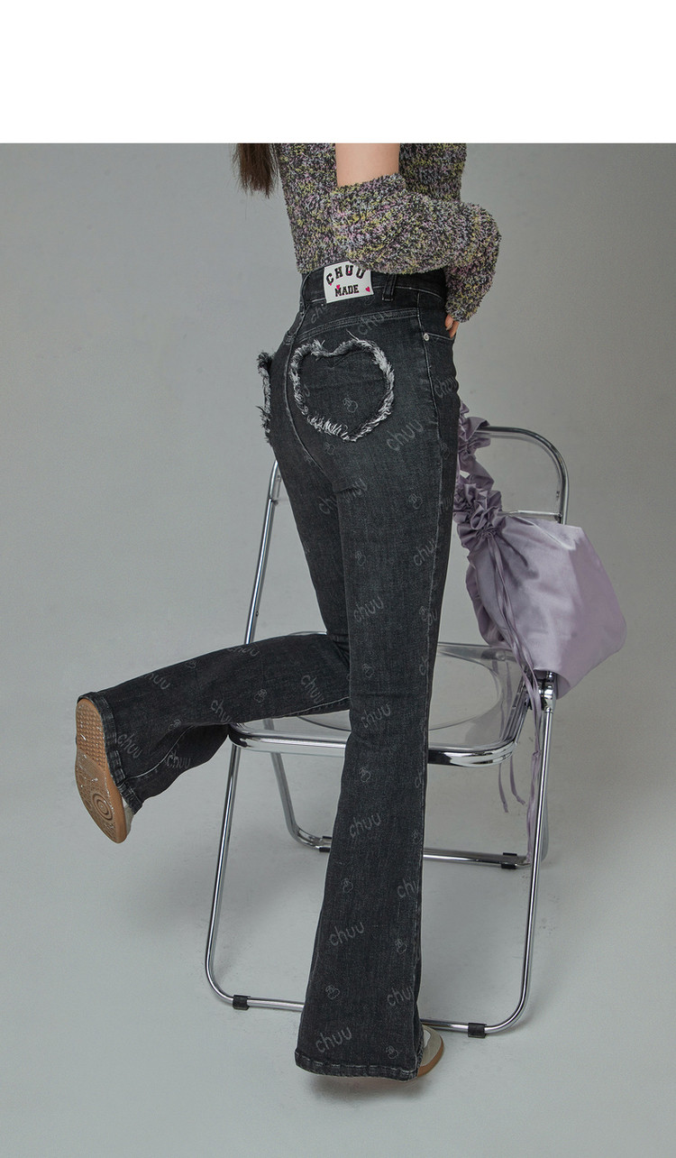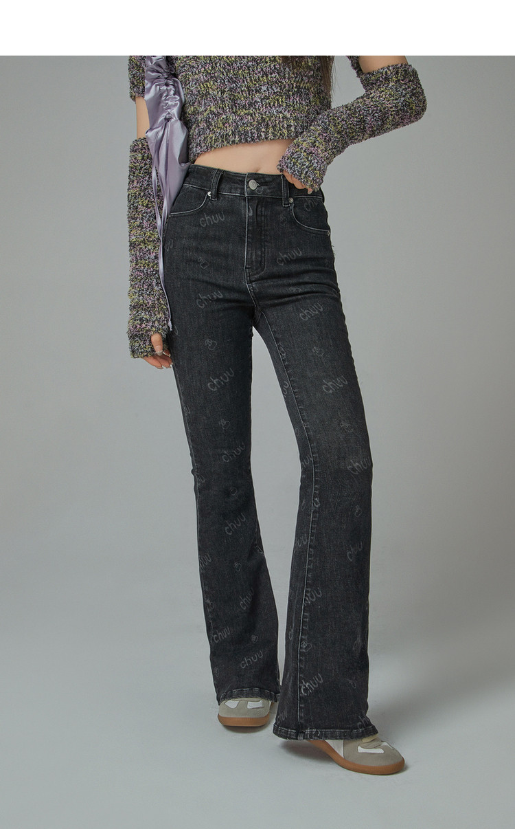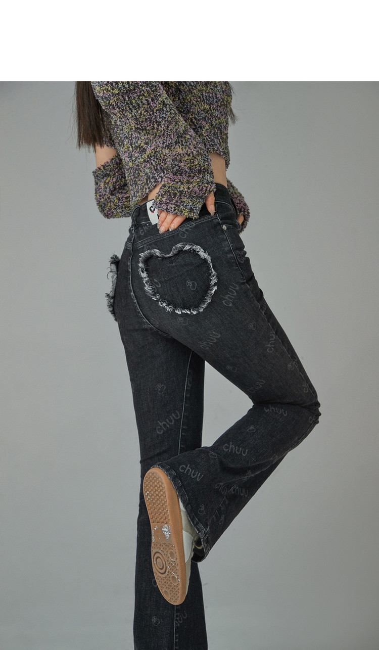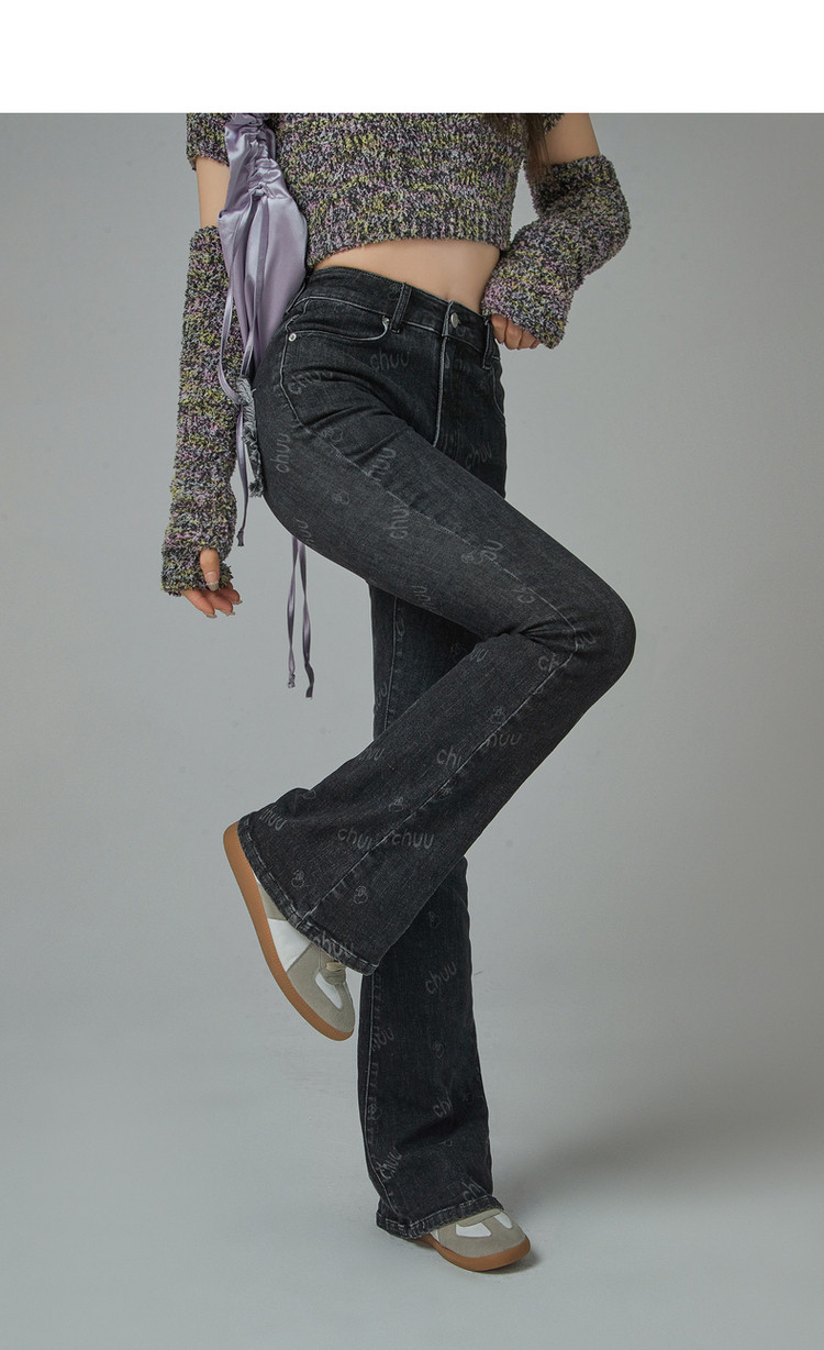 字母高腰牛仔裤女春秋设计感百搭微喇裤长裤子 354643