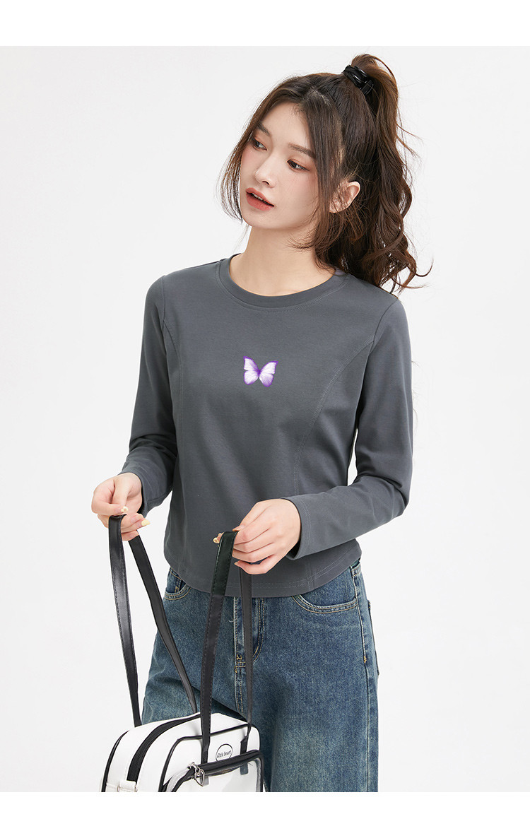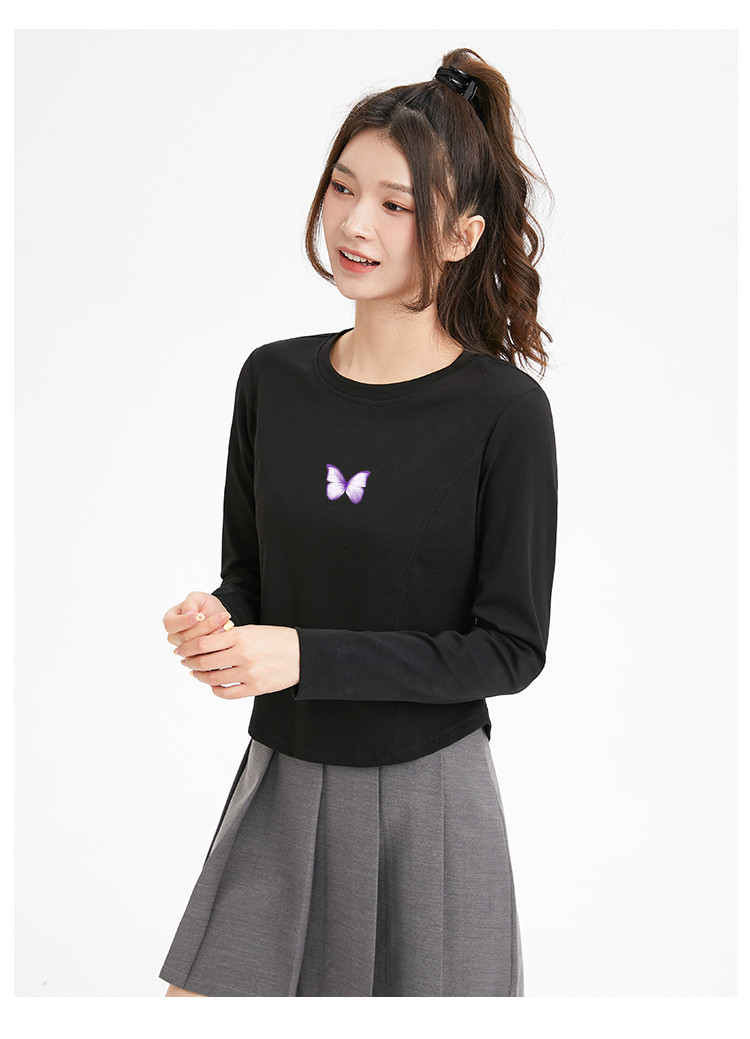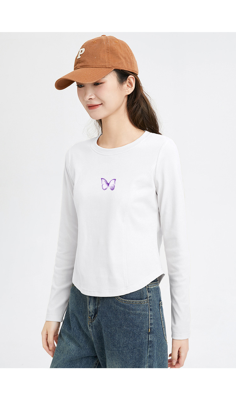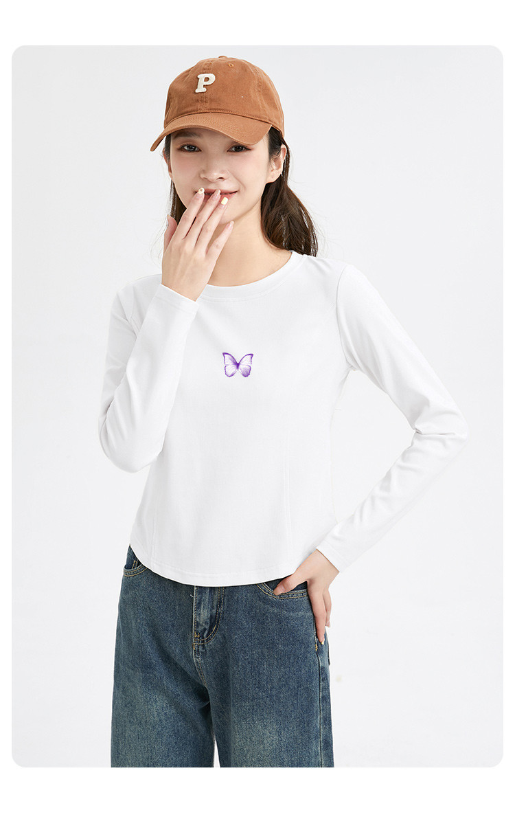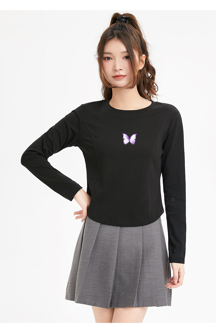 米子旗春秋圆领T恤女撞色蝴蝶印花基础款百搭潮 426586