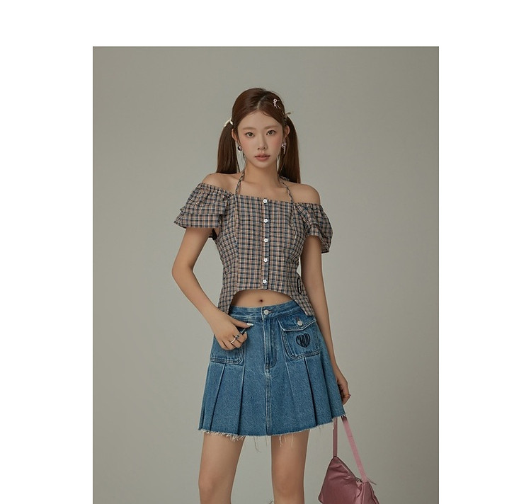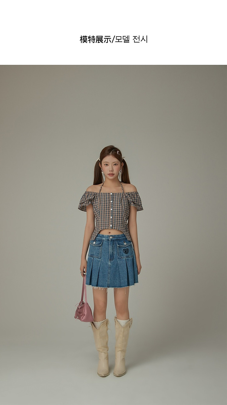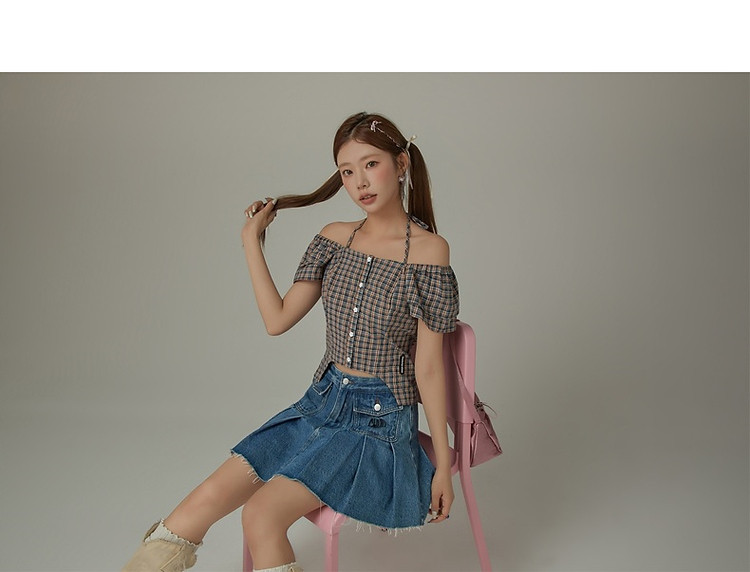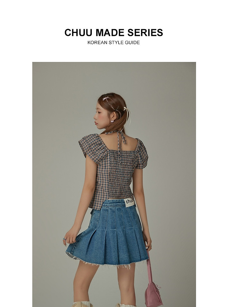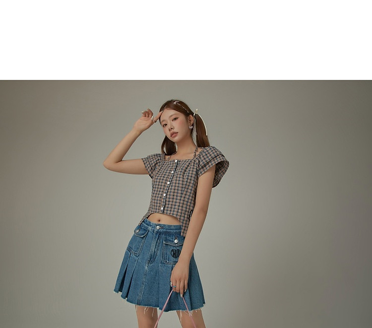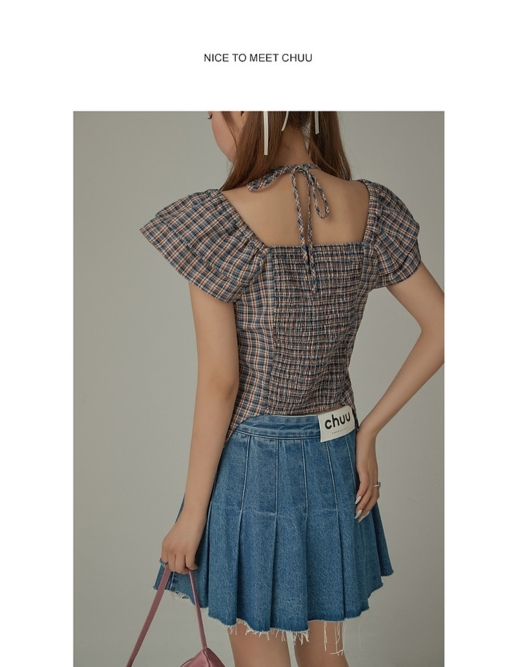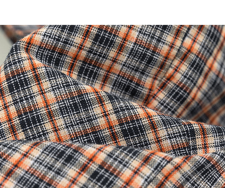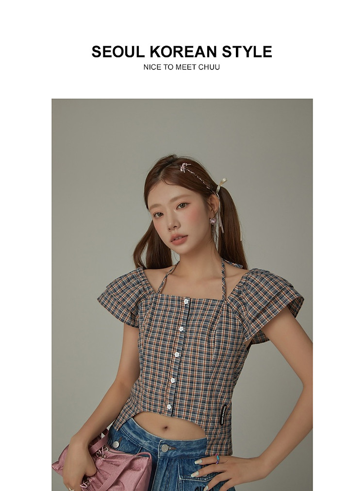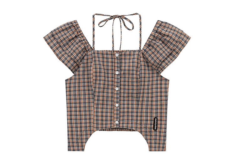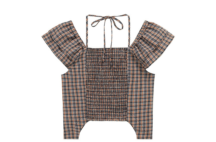 商品名称:格纹纽扣雪纺衫女春秋飞飞袖不规则露腰系带修身上衣 336467