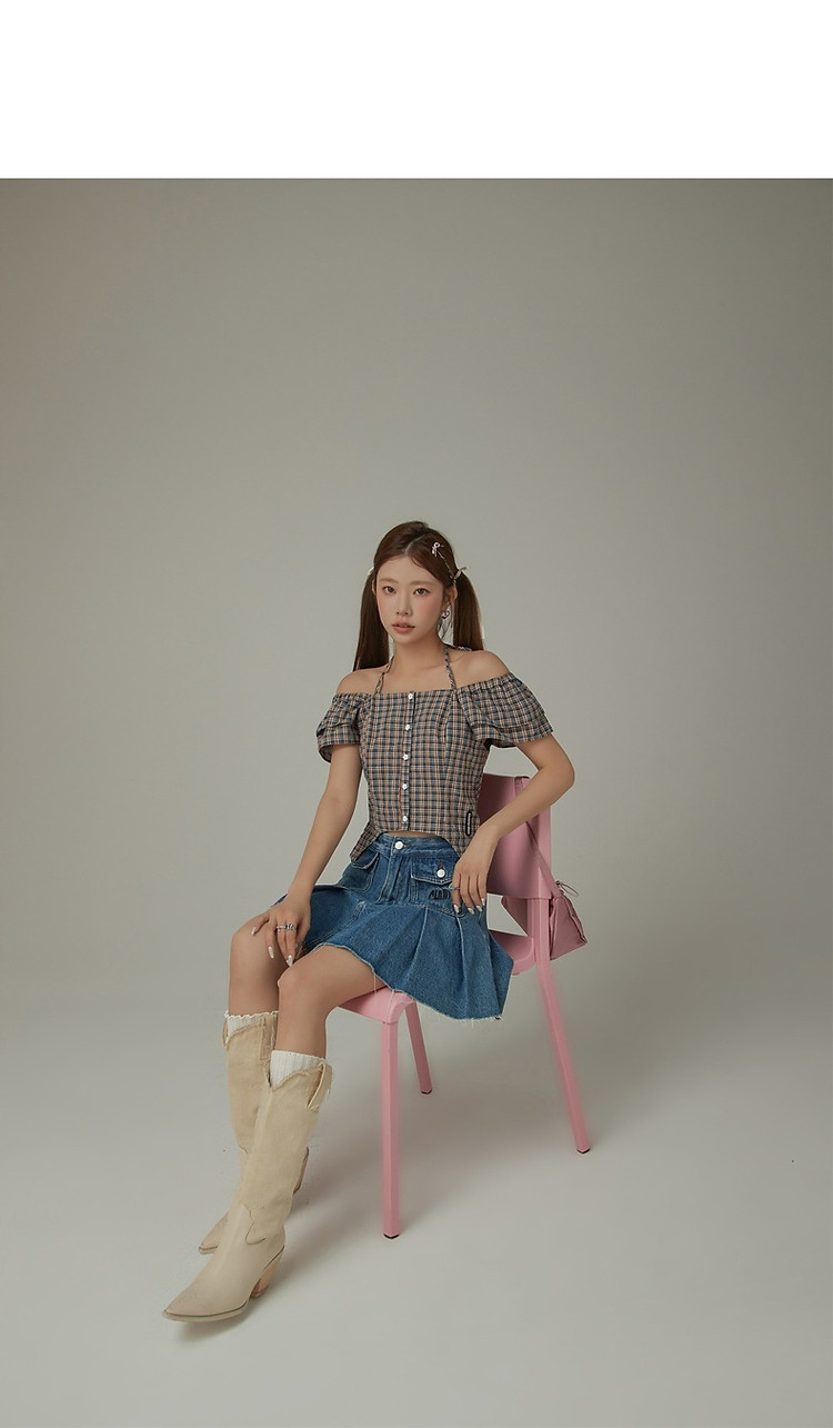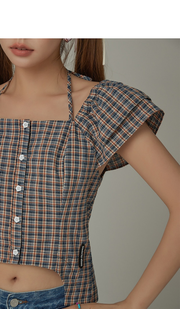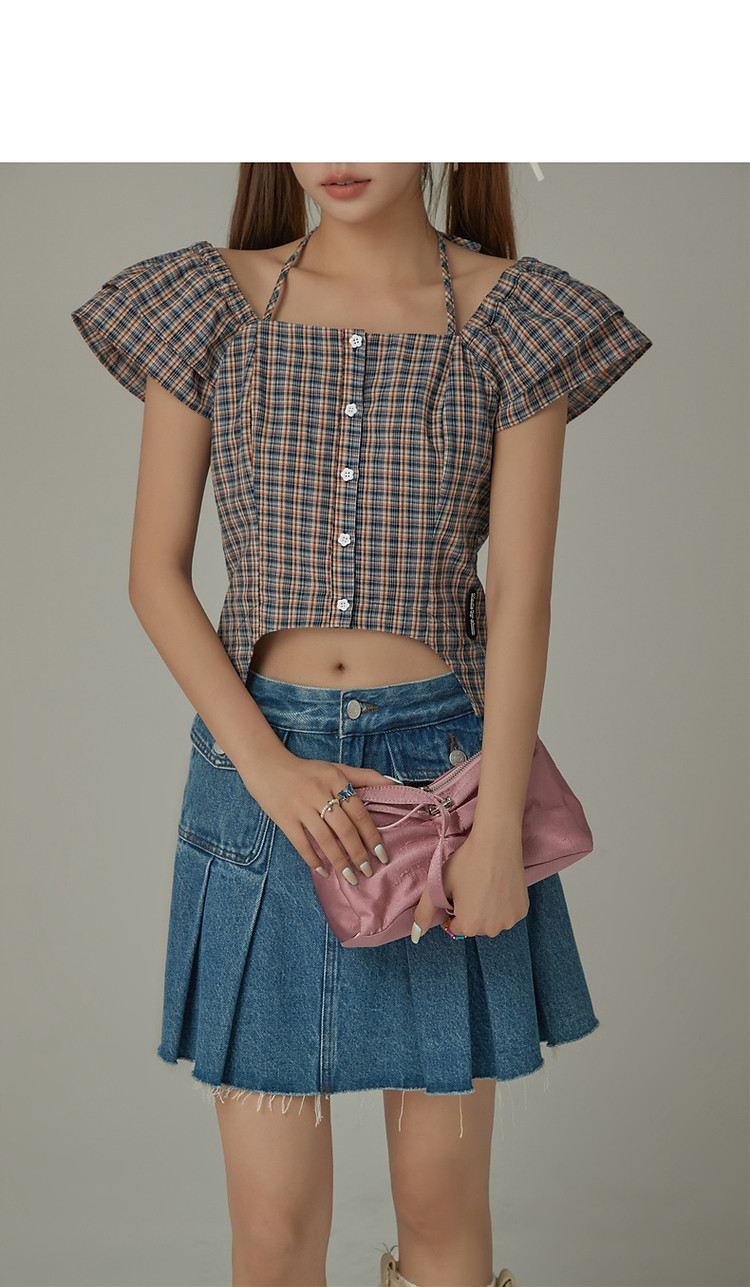格纹纽扣雪纺衫女春秋飞飞袖不规则露腰系带修身上衣 336467