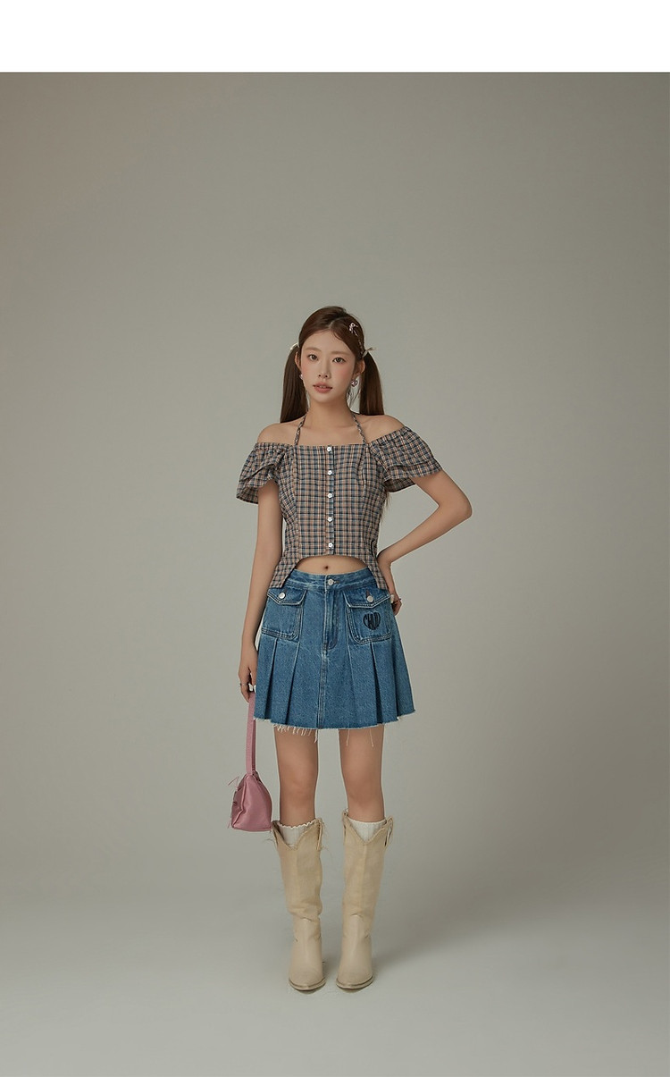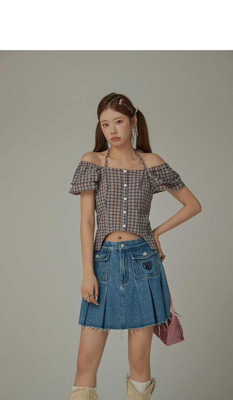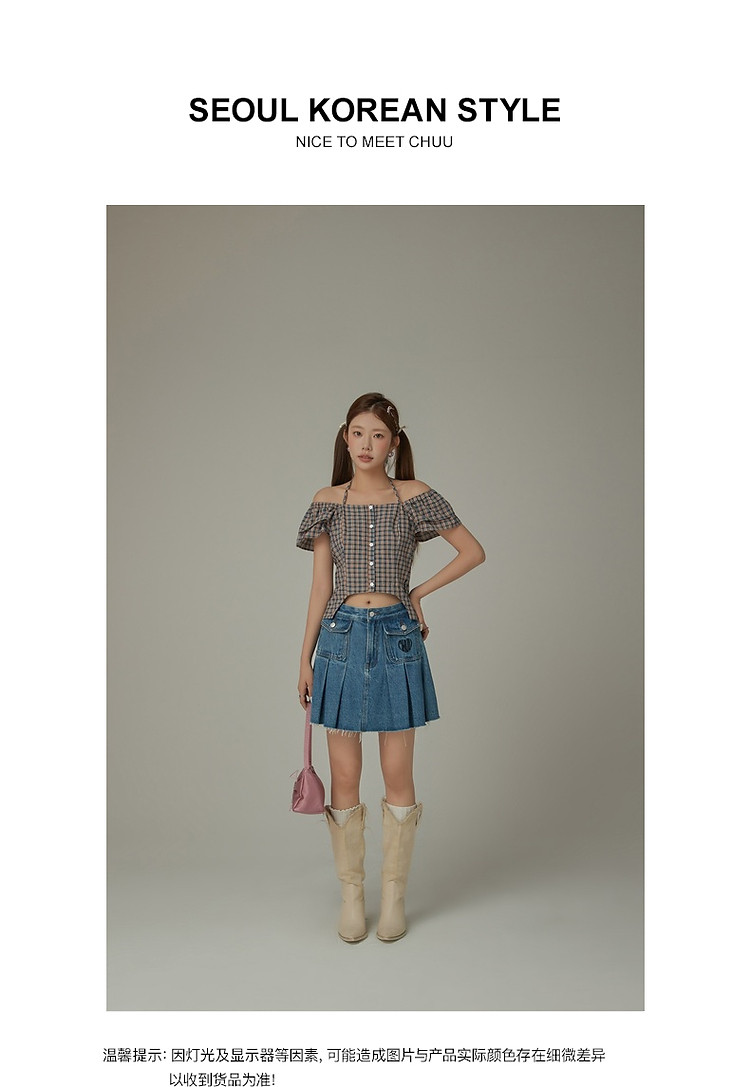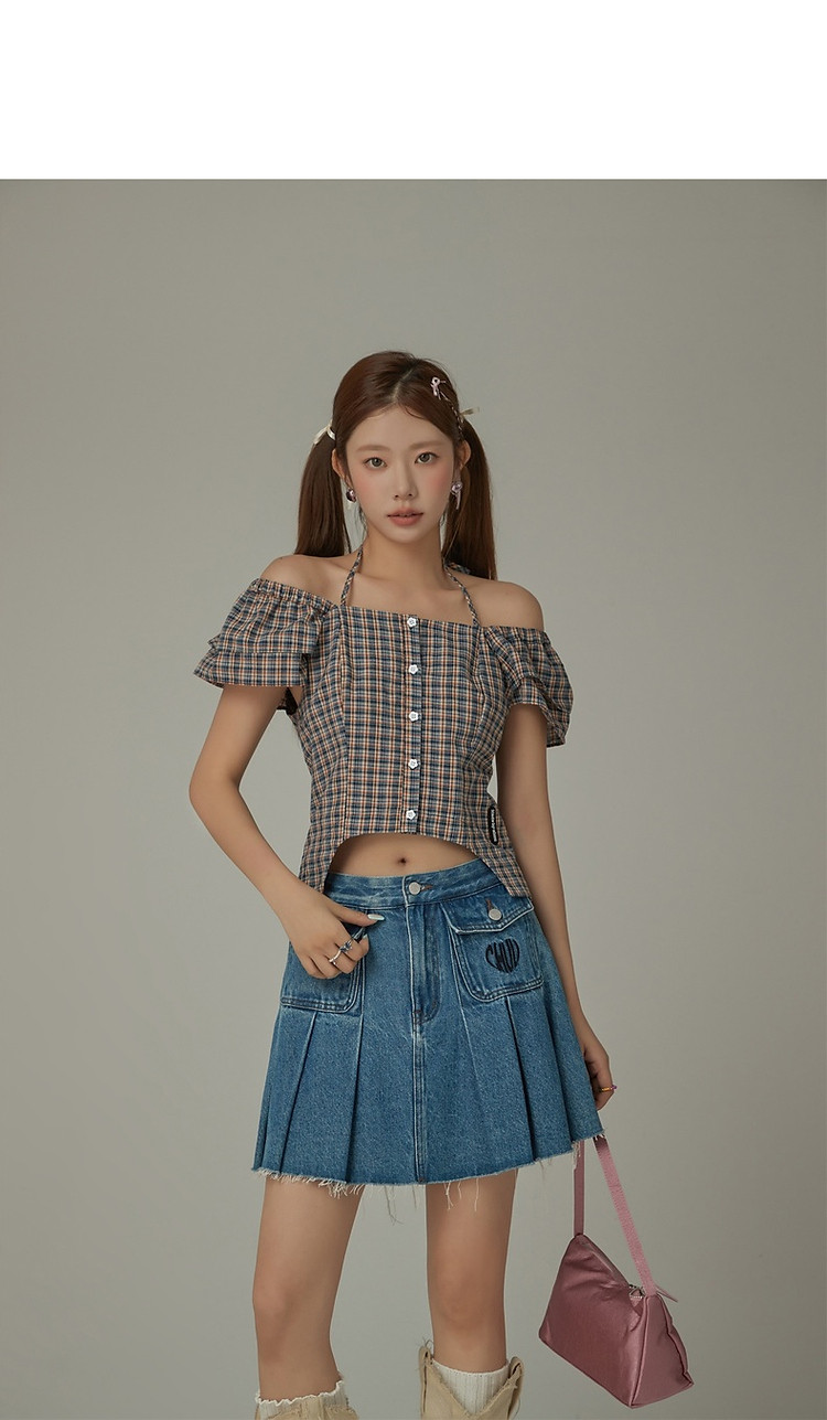 格纹纽扣雪纺衫女春秋飞飞袖不规则露腰系带修身上衣 336467