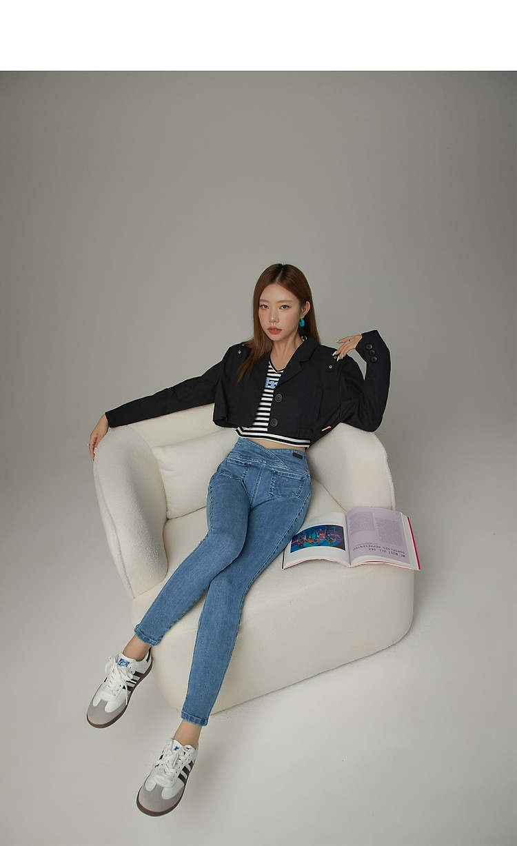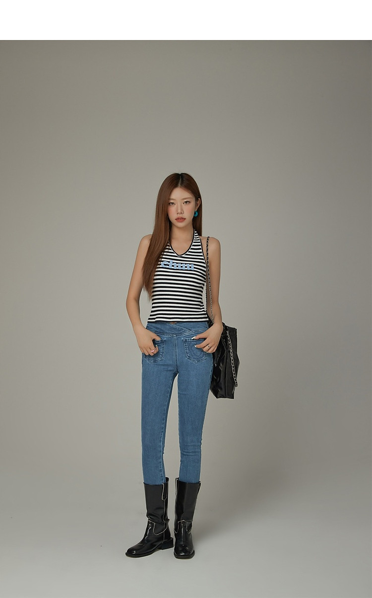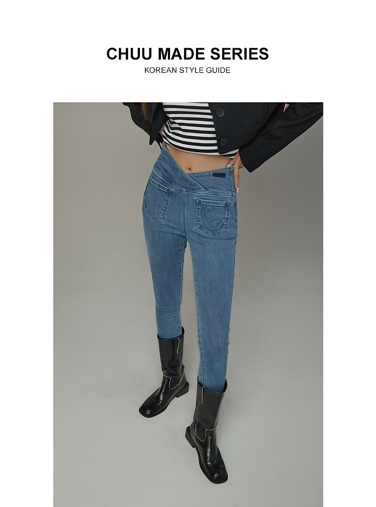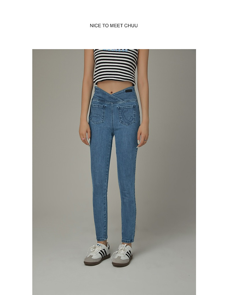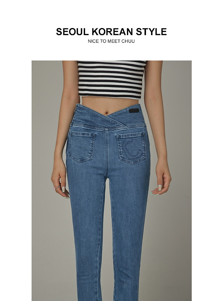 露脐牛仔裤女春秋法式水洗包臀修身小脚长裤子 287635